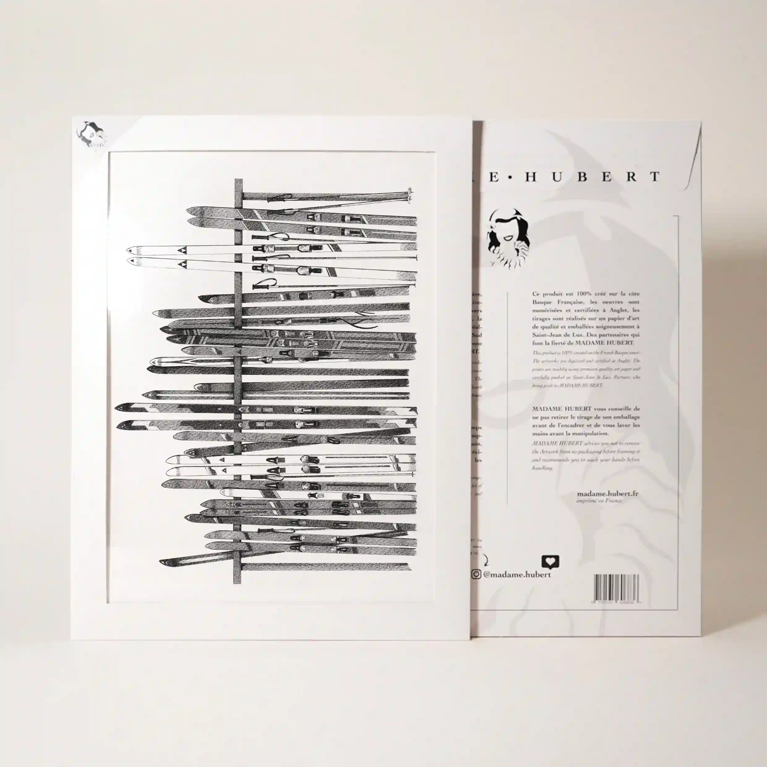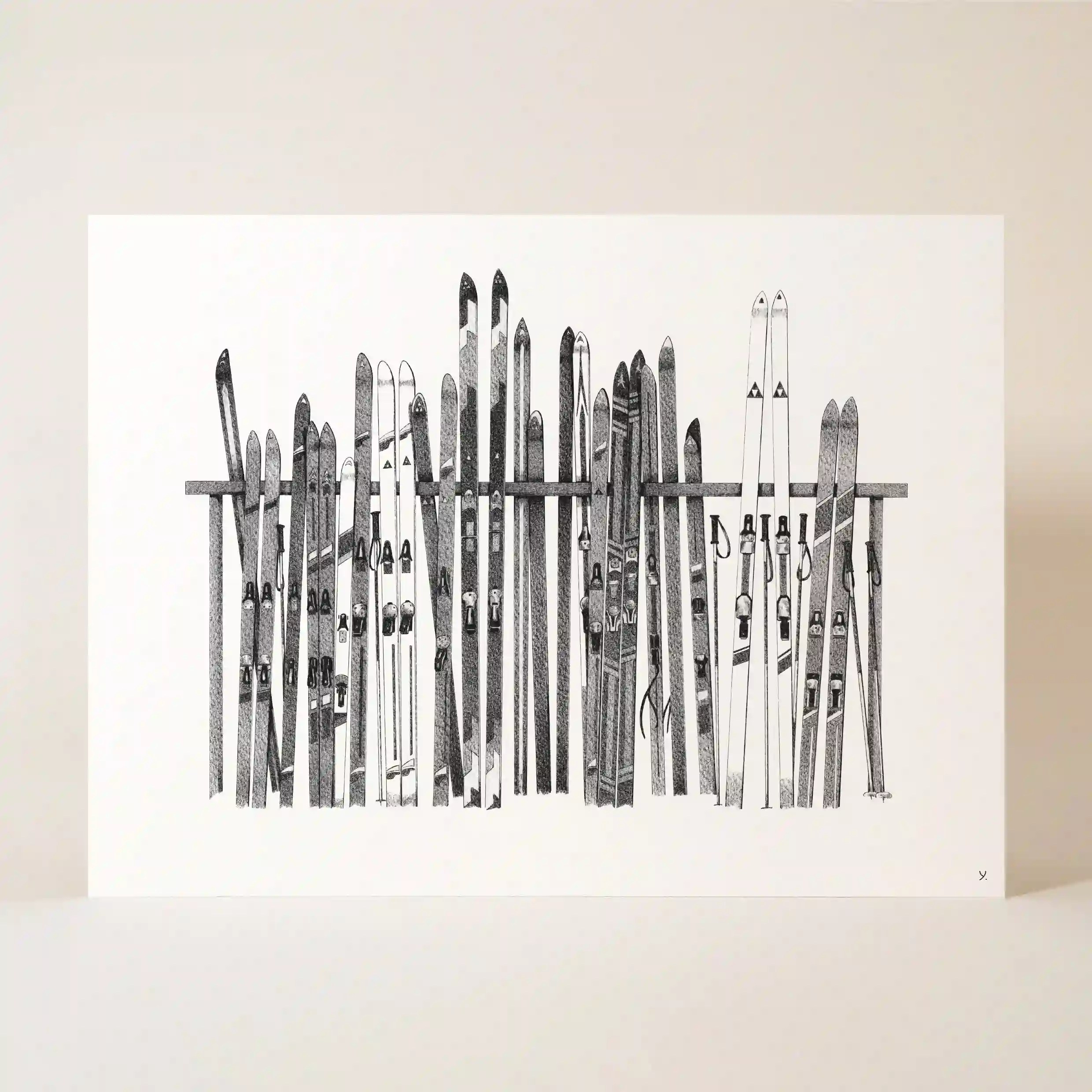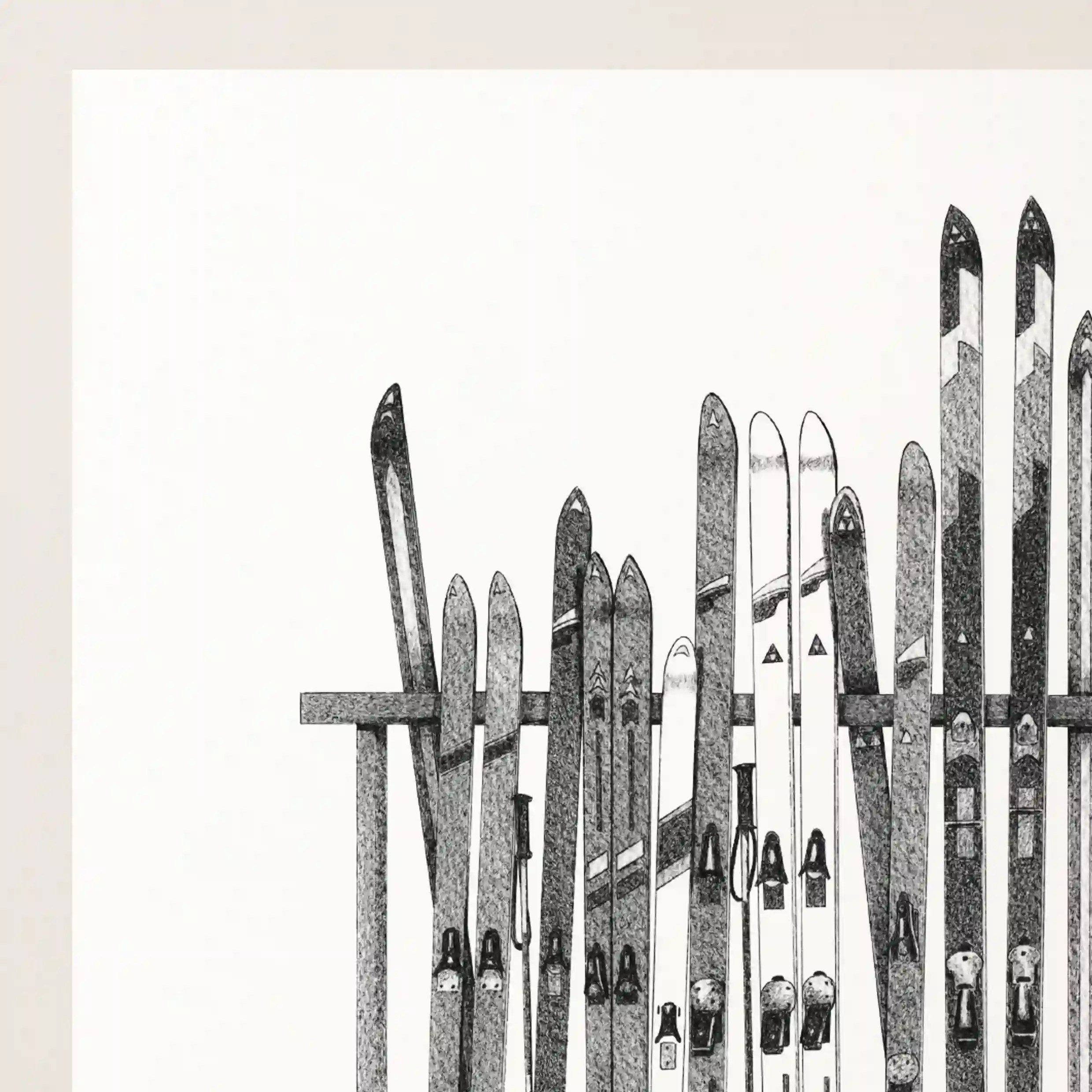 Chaque détail de cette œuvre met en lumière le charme rétro des skis d’antan, allant des modèles en bois sculptés aux versions plus modernes, créant ainsi un contraste subtil entre tradition et évolution du ski alpin. Les bâtons suspendus et l’agencement méticuleux des équipements rappellent les chalets d’altitude et les stations mythiques où se sont écrites les plus belles histoires de glisse.