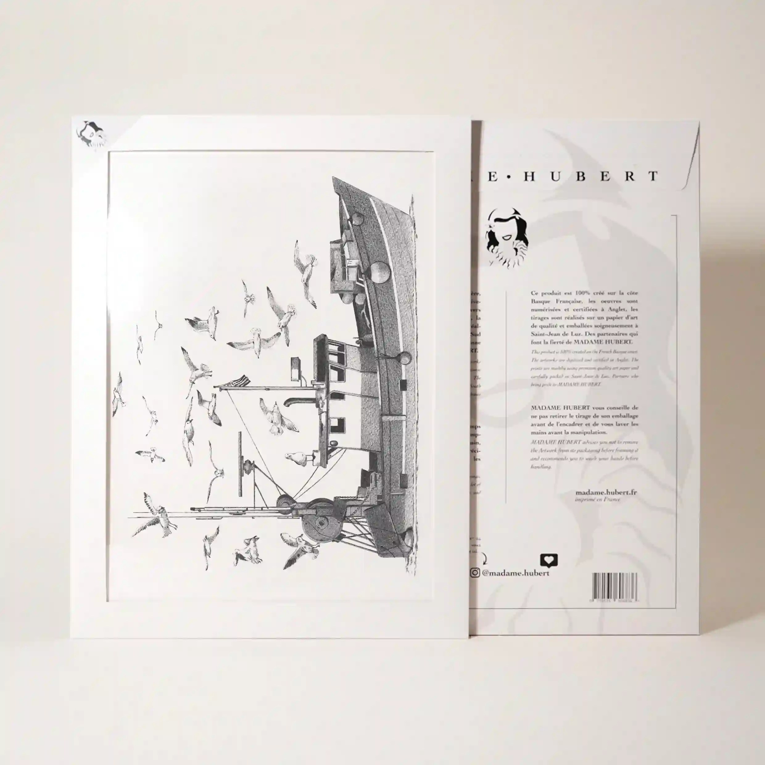 Plongez dans l’univers authentique des pêcheurs avec cette affiche mer originale, représentant un chalutier accompagné de son fidèle cortège de mouettes. Un dessin en noir et blanc d’une finesse remarquable, qui capte l’instant où le bateau revient de sa pêche, escorté par ces oiseaux marins en quête de quelques restes. Cette illustration est idéale pour les amateurs d’art maritime, de voyages en mer et d’ambiance marine intemporelle.