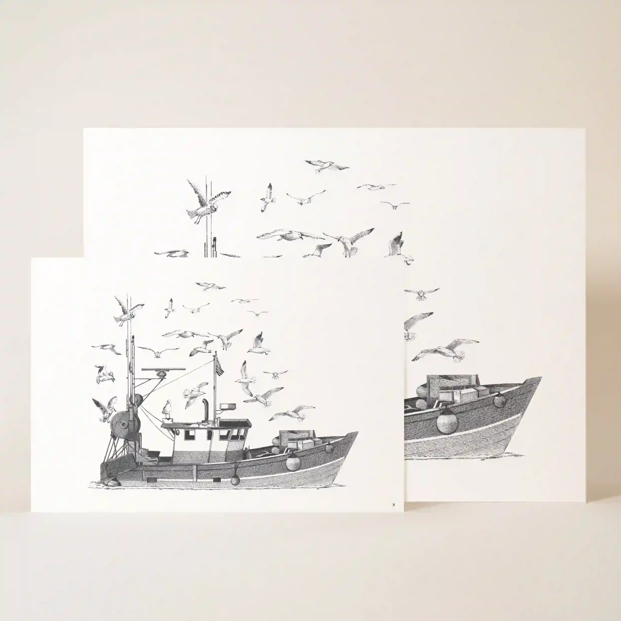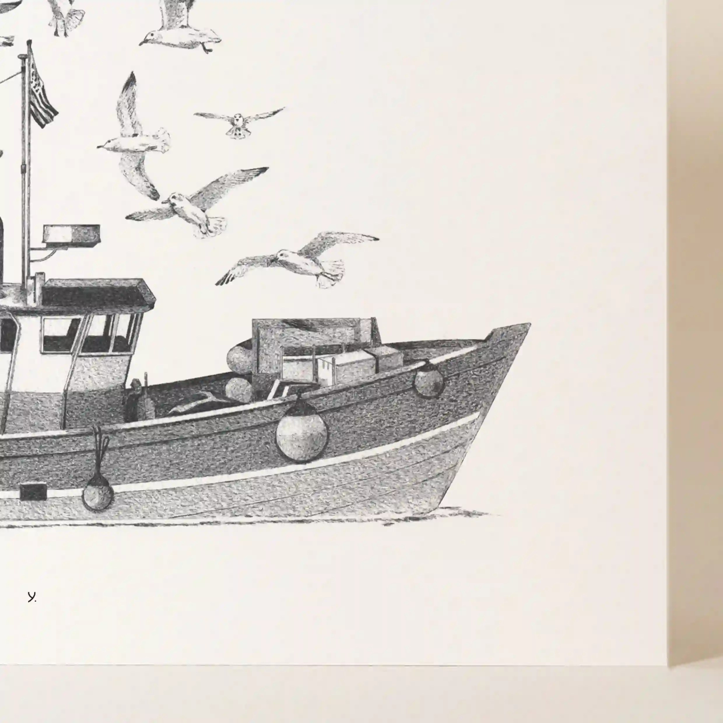 Cette affiche originale met en scène un chalutier en pleine mer, avec ses équipements de pêche et ses détails d’une précision exceptionnelle. Chaque élément du bateau est soigneusement dessiné : le mât, les filets, les bouées et même la cabine, donnant une impression de réalisme frappante. Au-dessus du navire, une nuée de mouettes s’envole, ajoutant une touche de dynamisme à l’illustration. L’ombre et la lumière, habilement travaillées, renforcent le relief et la profondeur du dessin, pour un rendu visuel saisissant.