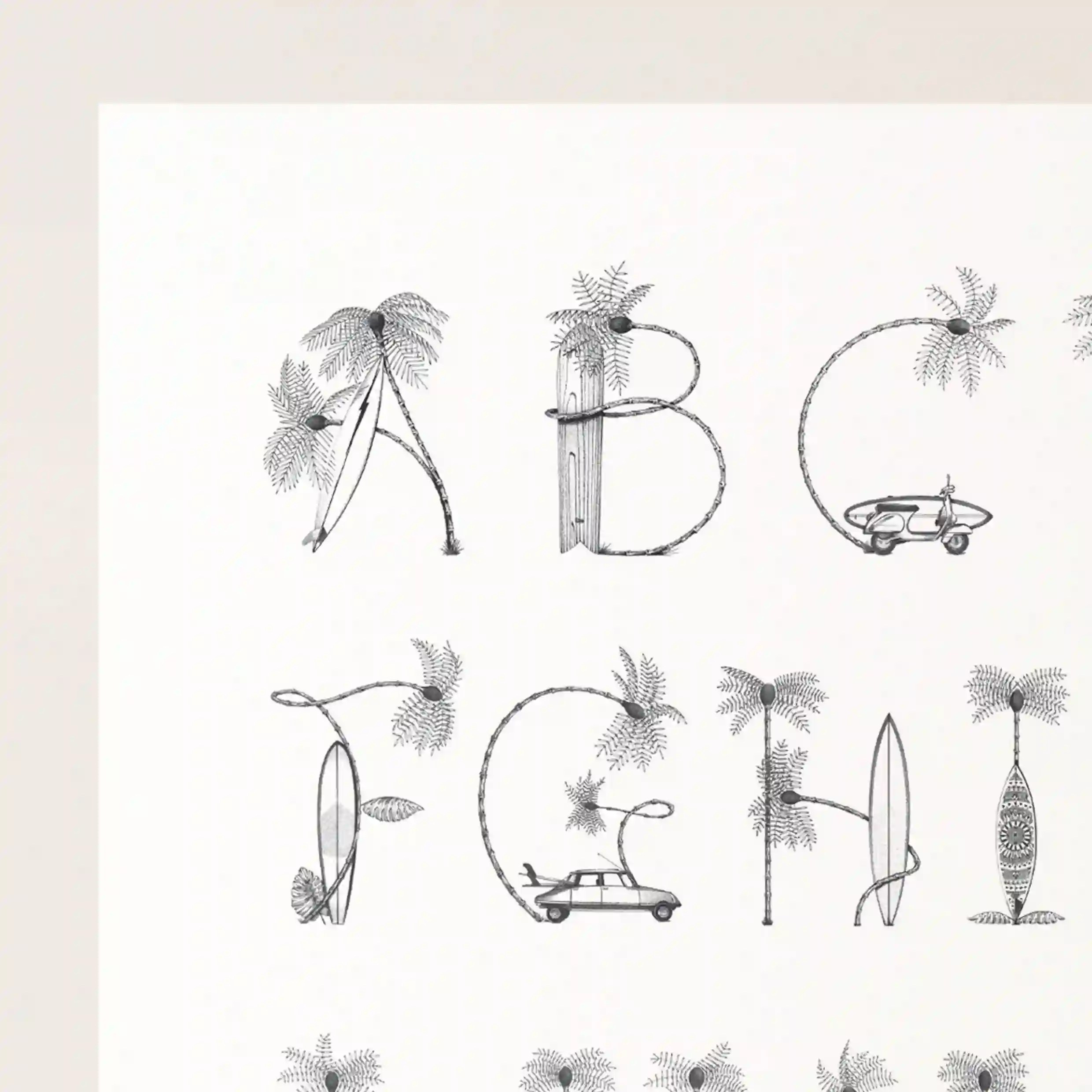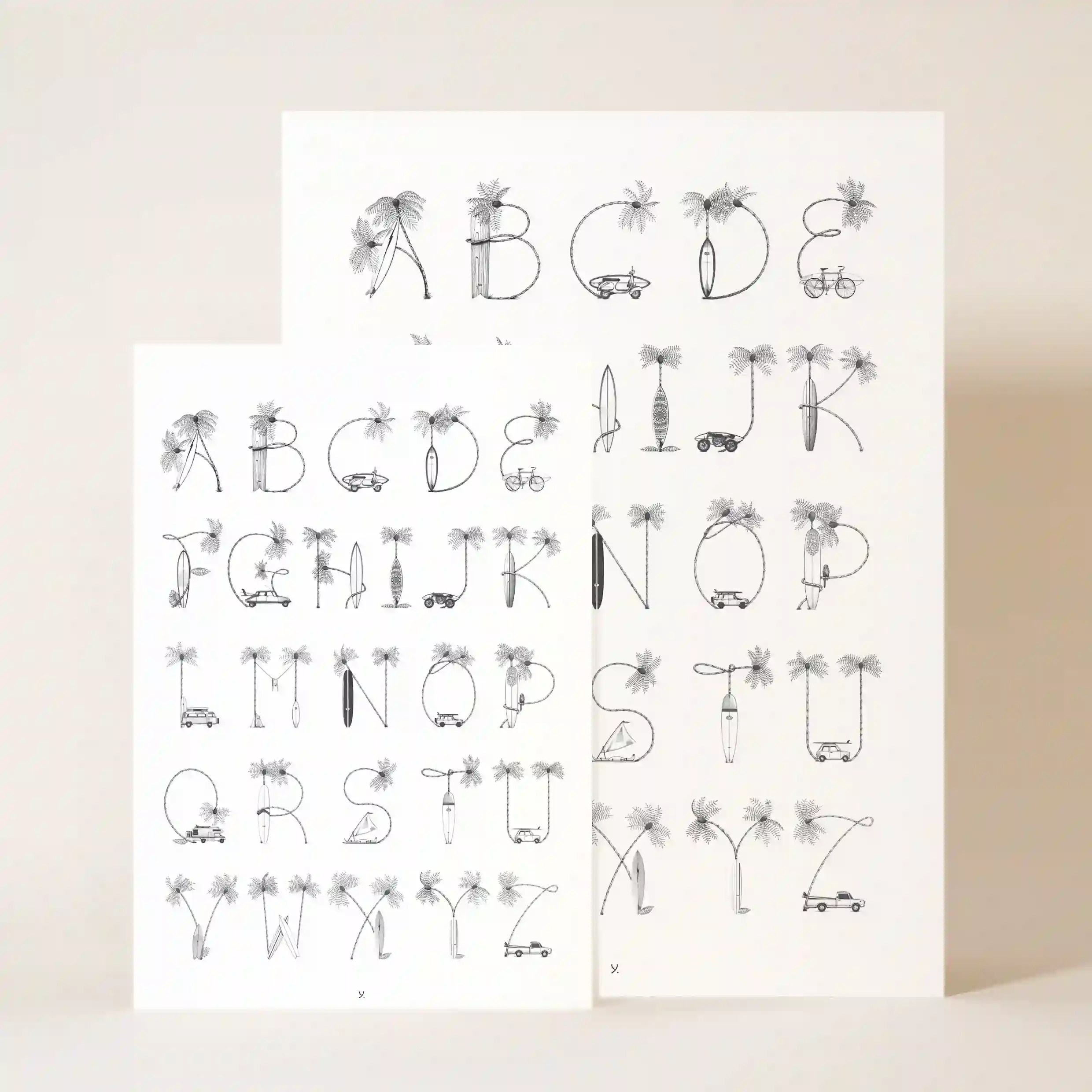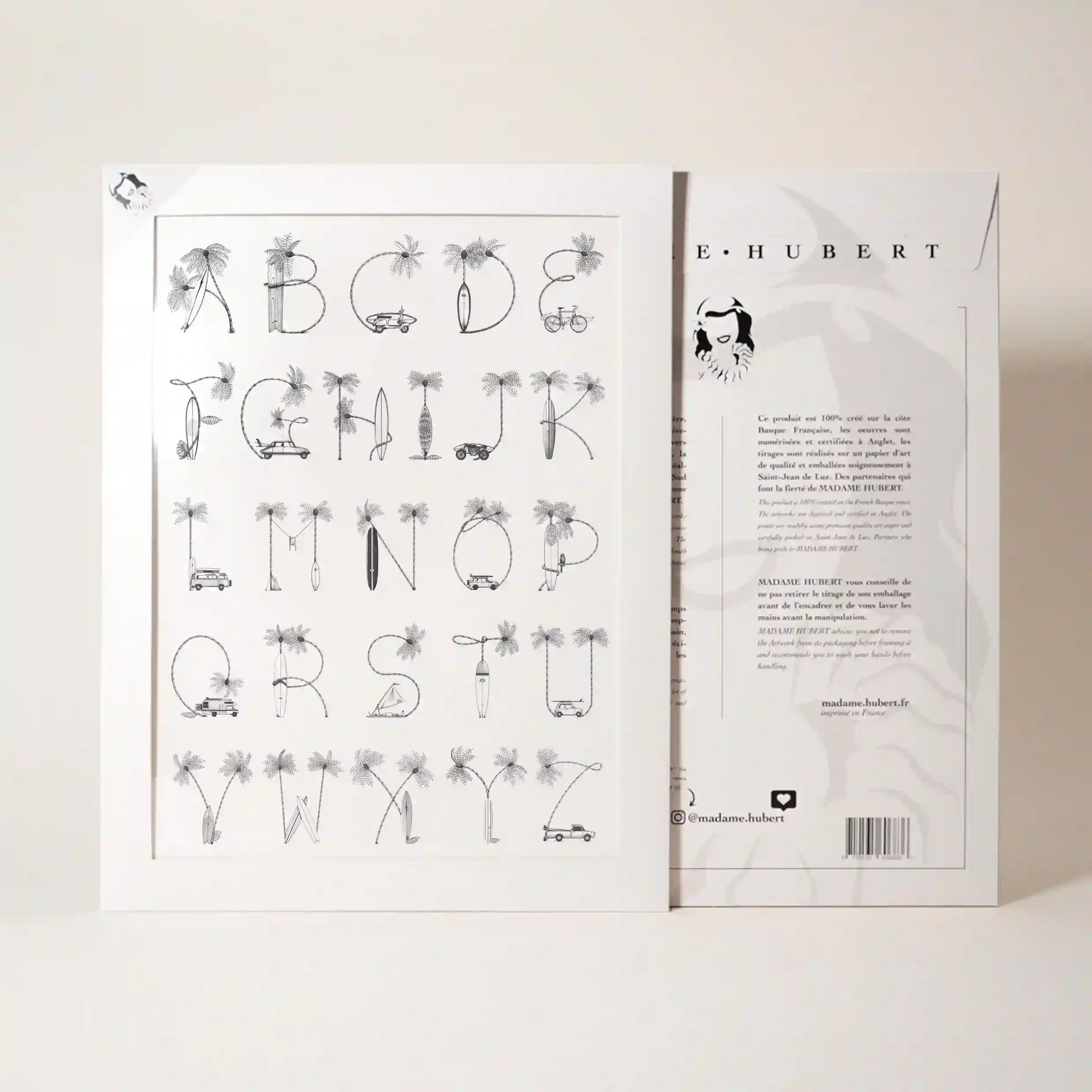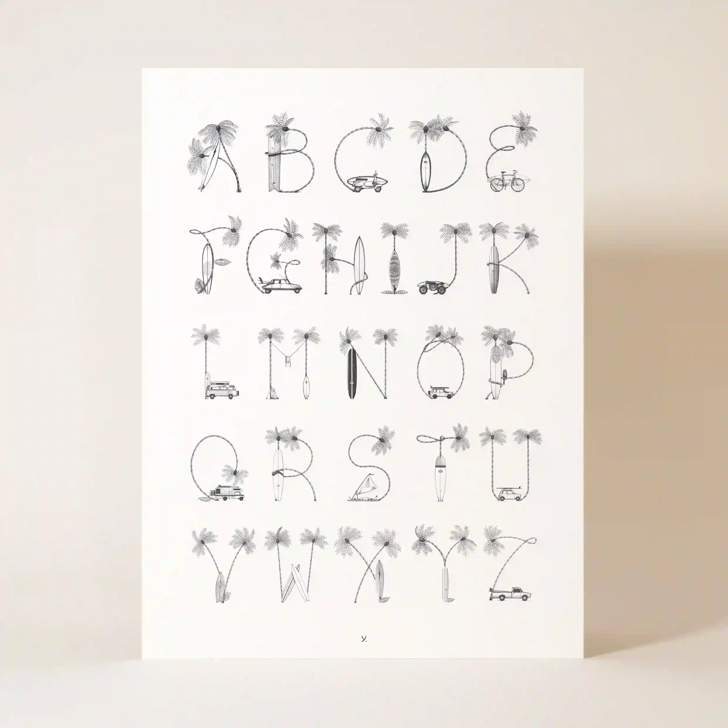Conçue avec une précision exceptionnelle, cette affiche propose un abécédaire hors du commun où chaque lettre se transforme en un objet ou un paysage rappelant l’univers de la plage et de la nature. L’attention portée aux détails et le travail en noir et blanc donnent un style épuré et intemporel qui s’adapte à tous les types de décoration.