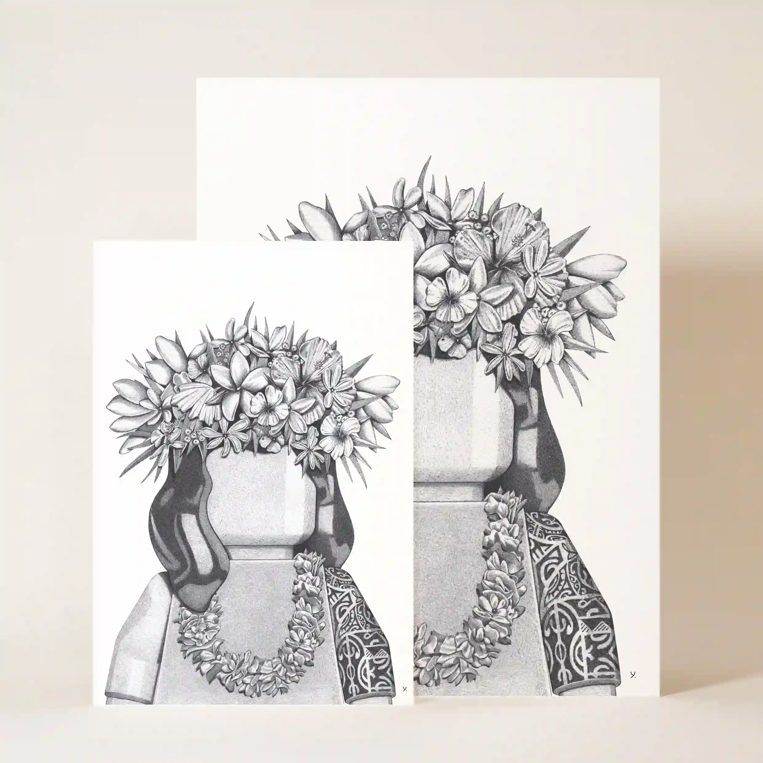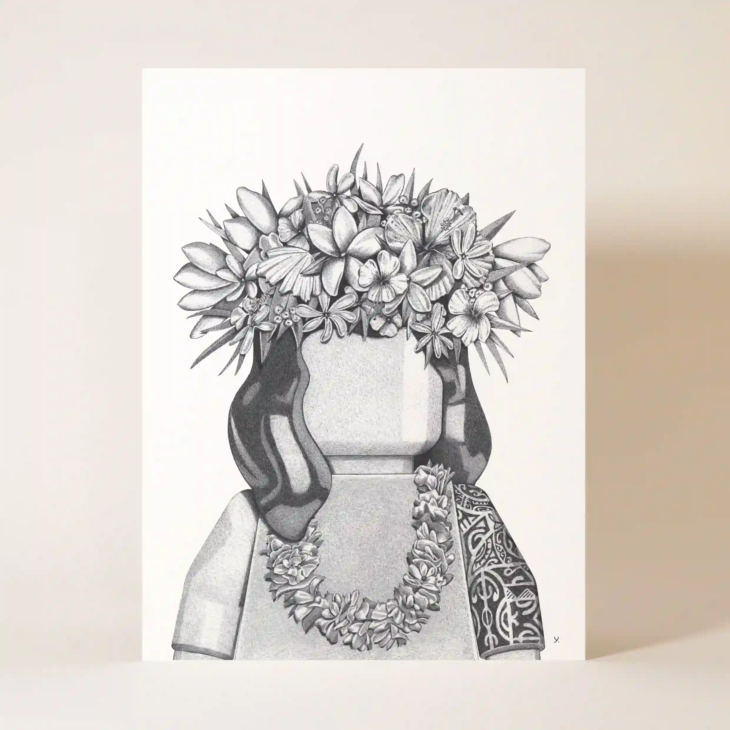 Cette affiche originale joue avec le contraste entre un univers ludique et un hommage à la culture polynésienne. La figurine emblématique se pare ici d’éléments traditionnels : une magnifique chevelure ondulée, une couronne de fleurs finement détaillée et un collier de bienvenue, évoquant l’esprit chaleureux et festif des îles du Pacifique. Son vêtement, décoré de motifs tribaux, apporte une dimension culturelle et artisanale à cette illustration captivante.