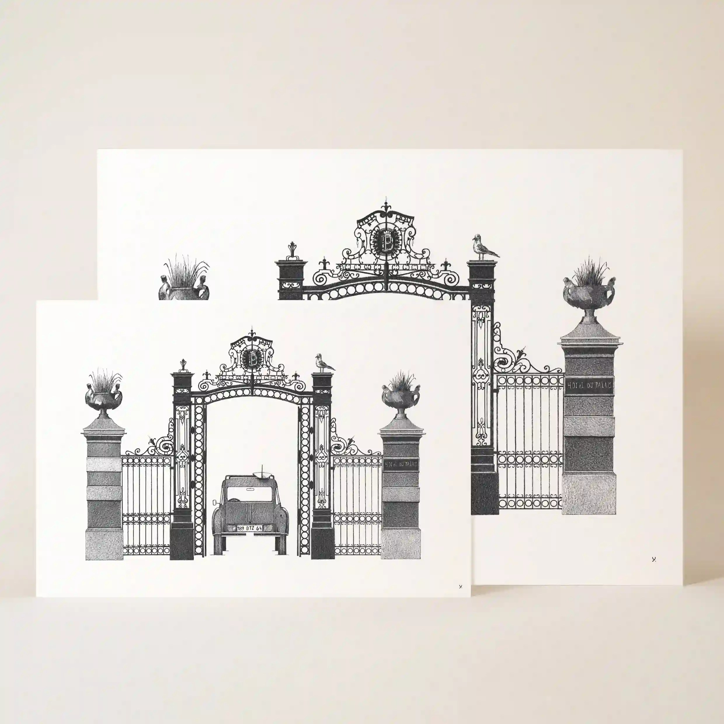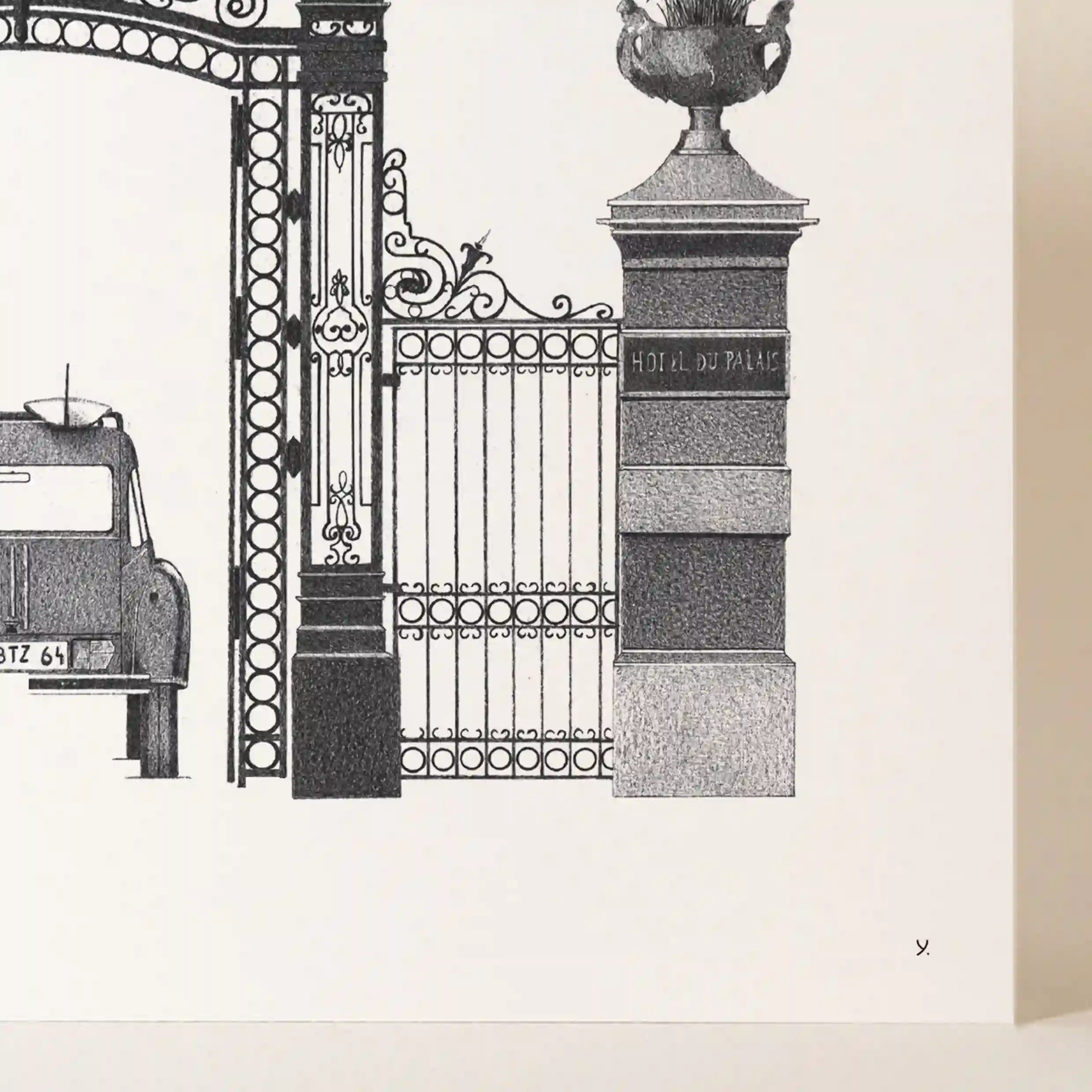 Cette affiche mer est bien plus qu’un simple dessin : elle représente une véritable invitation au voyage et à la découverte. L’arrière-plan suggère un lieu paisible, sans doute une villa surplombant l’océan, où l’on devine l’empreinte du sel et du vent marin. L’architecture du portail, finement détaillée, contraste avec la silhouette d’une voiture ancienne, symbole des road trips et des retours de session de surf. Les détails raffinés du fer forgé et les éléments marins disséminés dans la composition ajoutent une touche artistique unique.