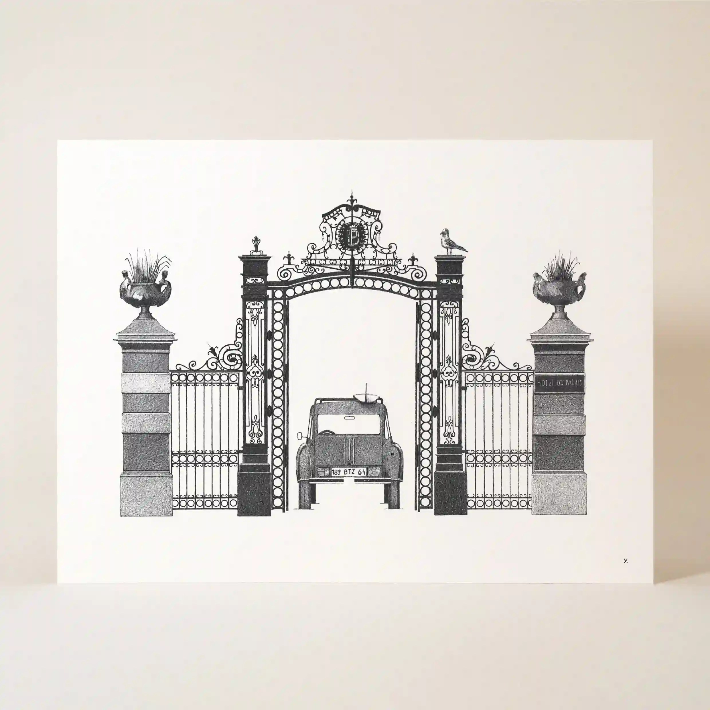 Apportez une touche d’élégance et d’évasion à votre intérieur avec cette affiche originale intitulée Back Home. Ce dessin captivant en noir et blanc illustre une scène intemporelle où une voiture vintage passe sous un majestueux portail orné, évoquant un retour au bercail empreint de sérénité et de souvenirs. Parfait pour les amateurs de surf et de voyage, ce visuel est une ode au littoral, aux escapades en bord de mer et à l’esprit de liberté.