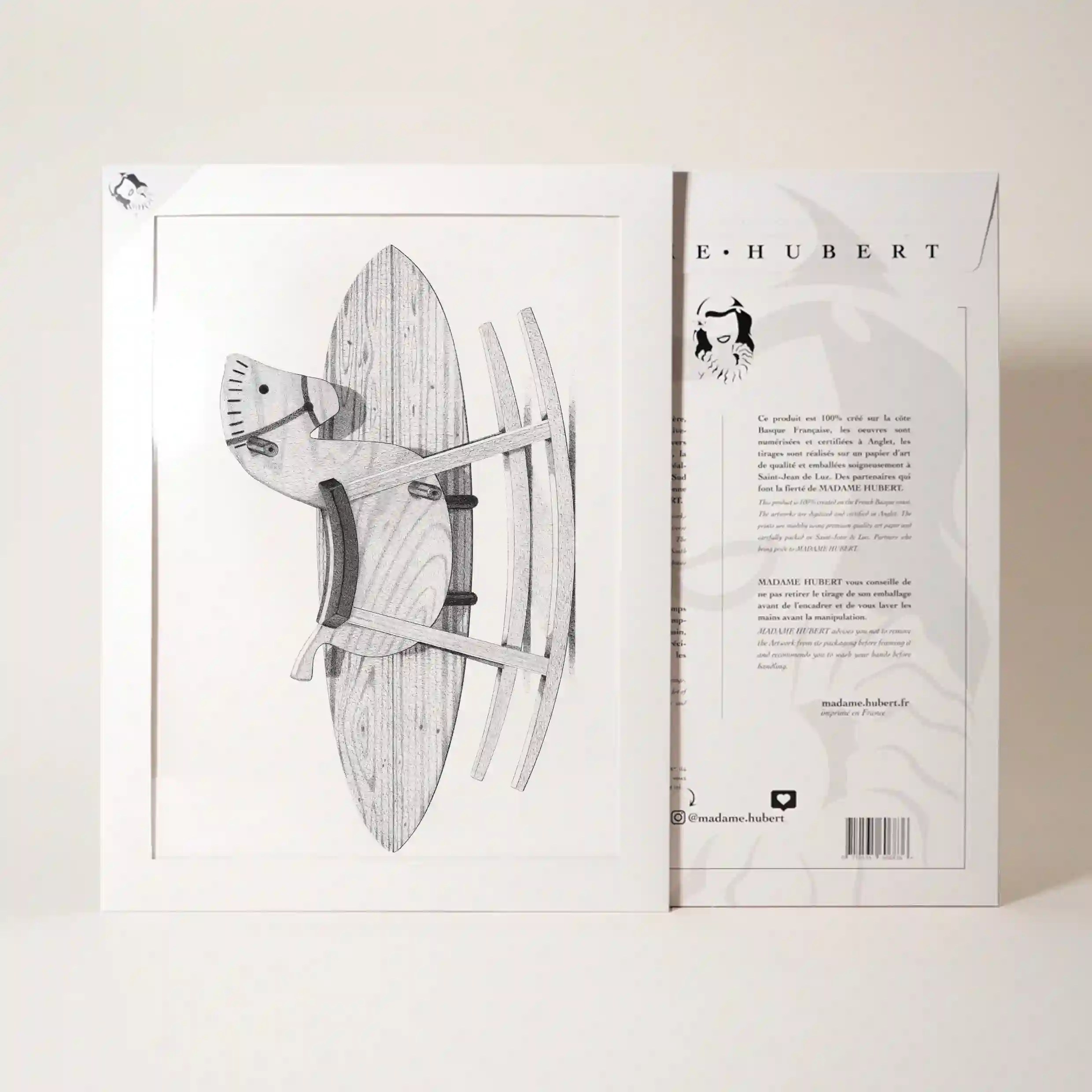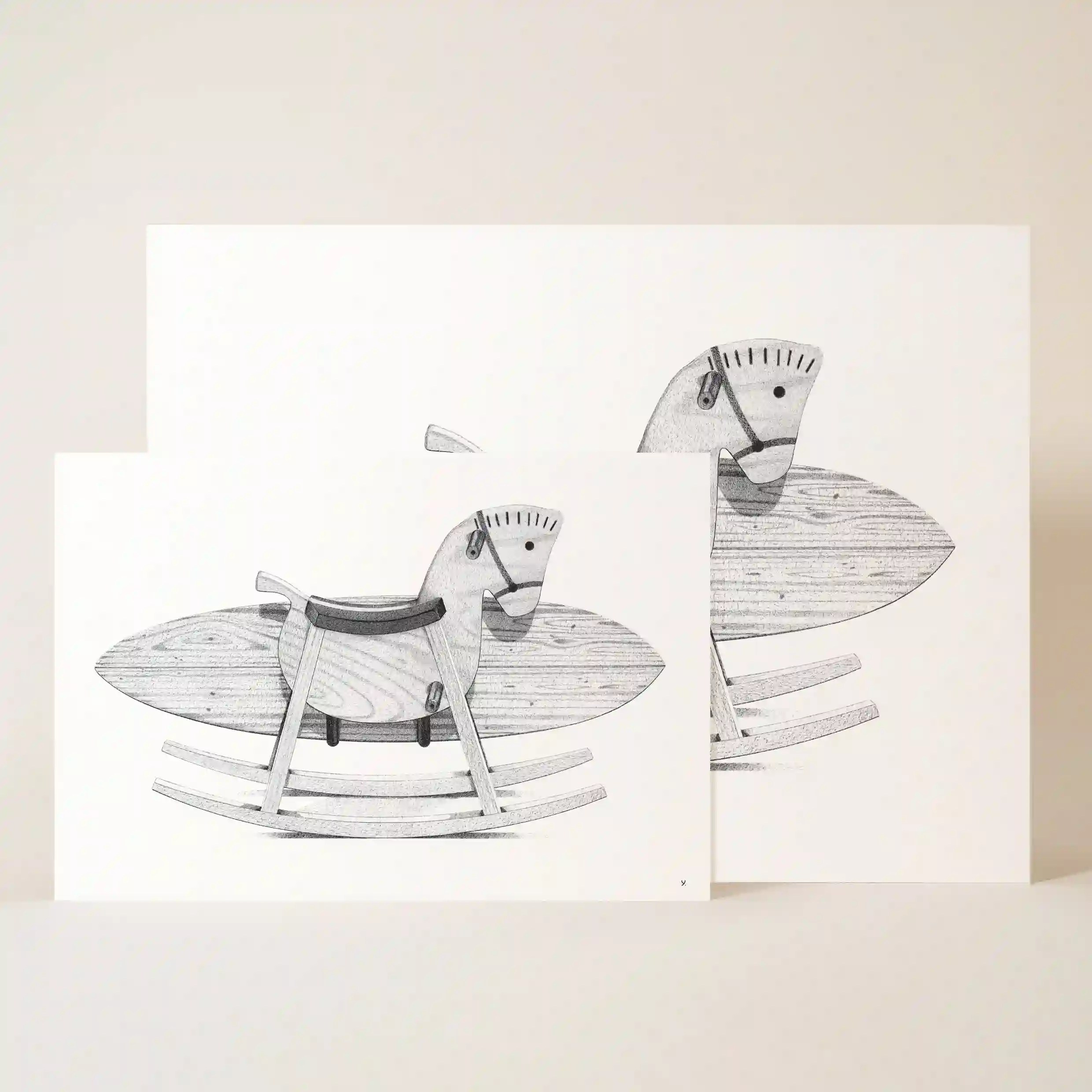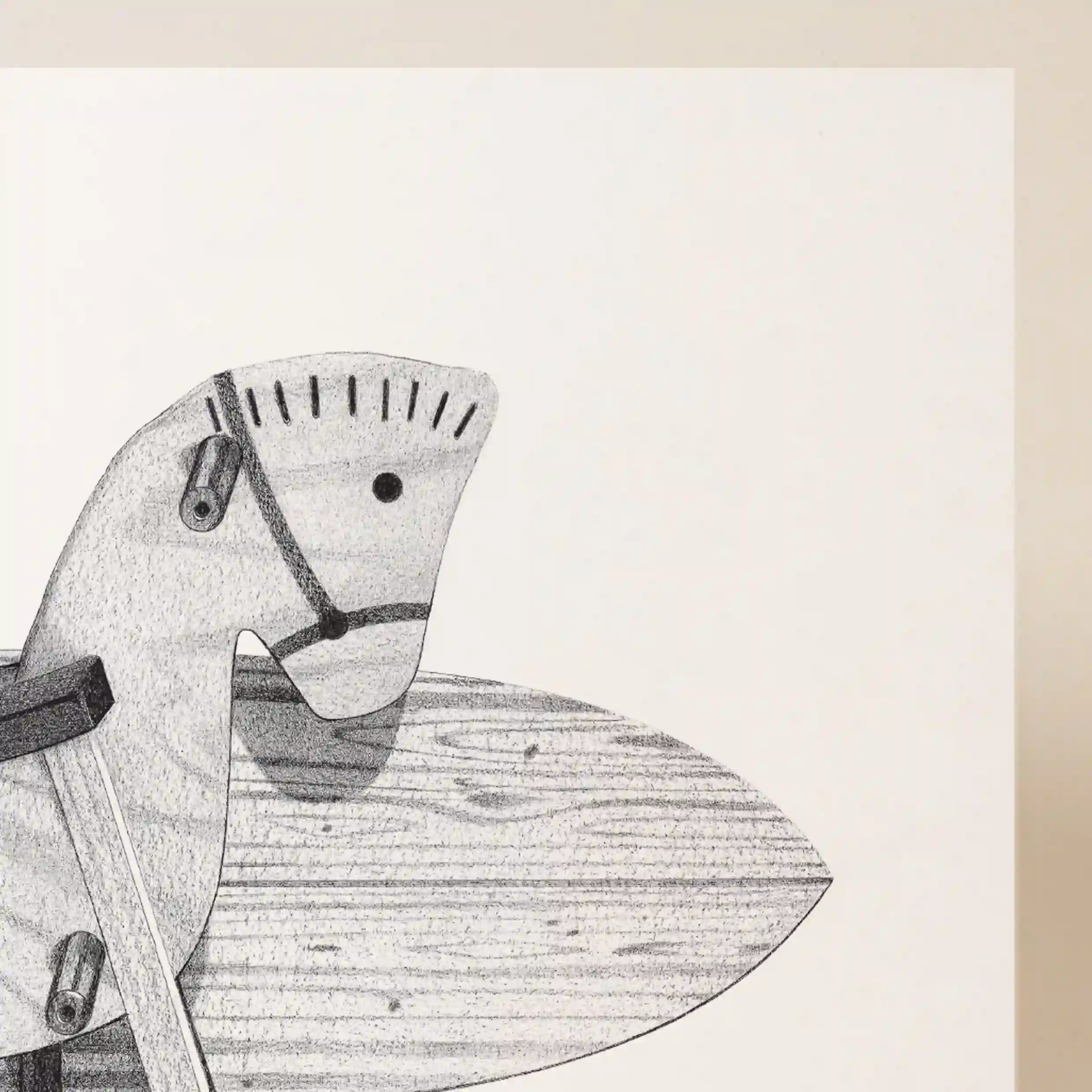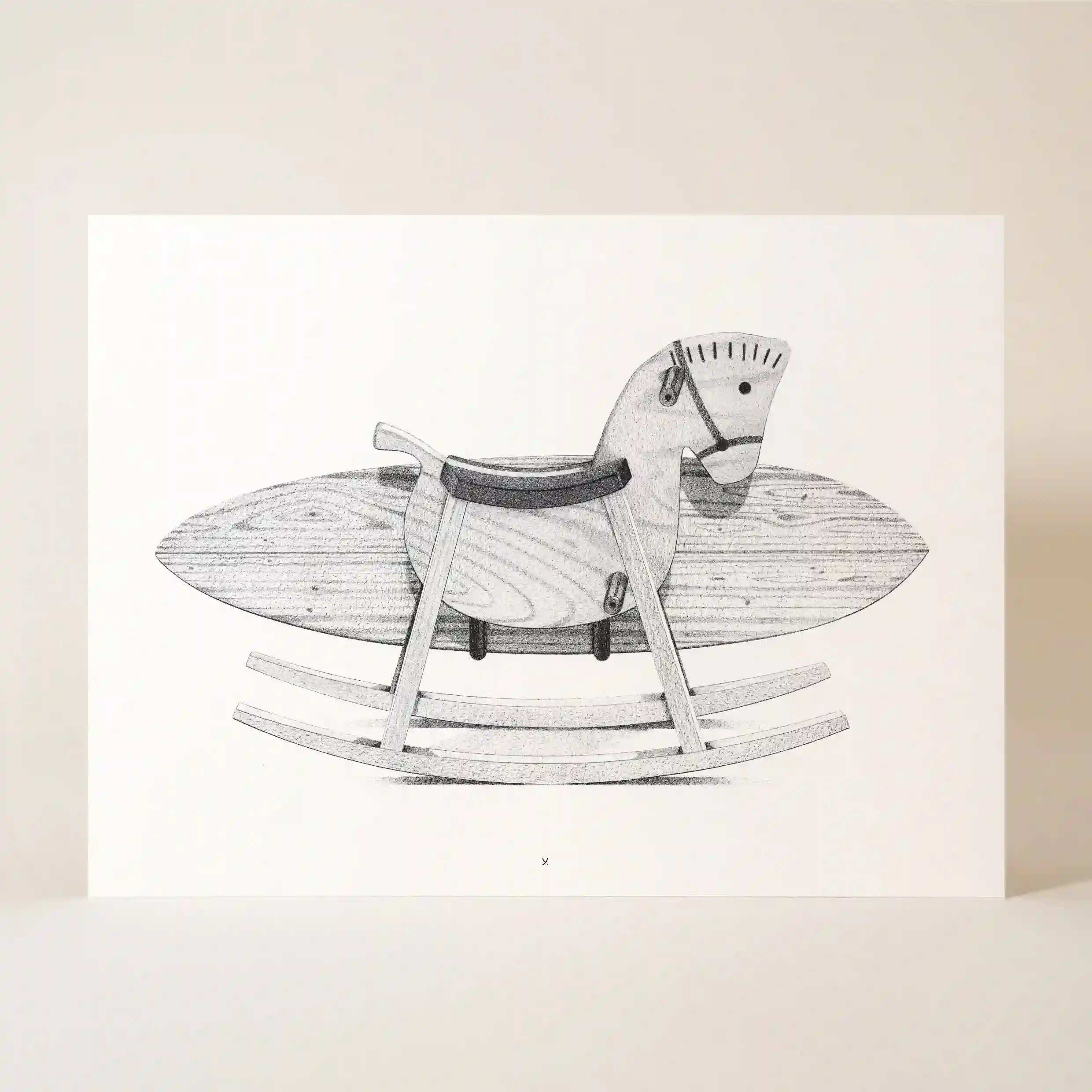 Le cheval à bascule, symbole de l’enfance et du jeu, est ici revisité d’une manière inattendue. Son socle en bois est remplacé par une planche de surf aux courbes douces et naturelles, évoquant l’évasion et la liberté. Cette composition apporte une touche subtile d’originalité et de poésie, idéale pour stimuler l’imagination des petits tout en ravissant les amateurs d’art graphique.