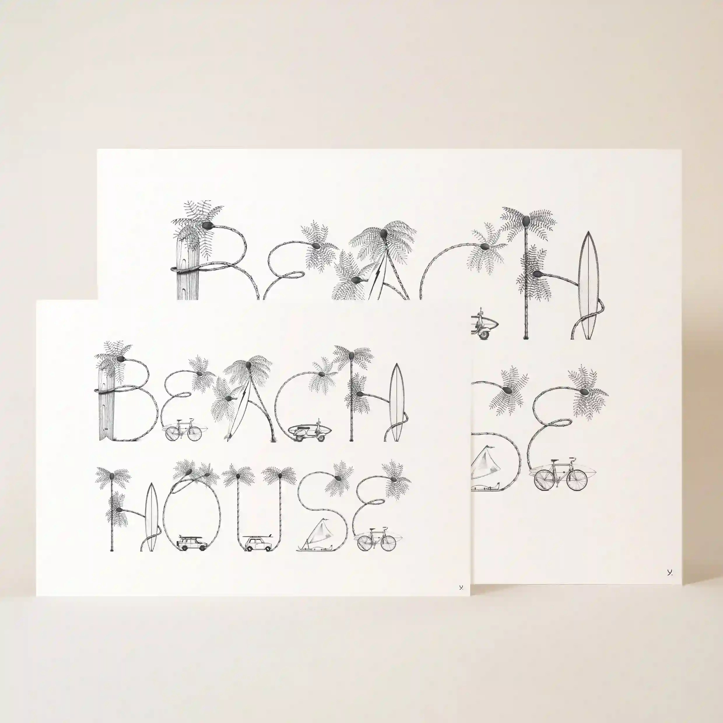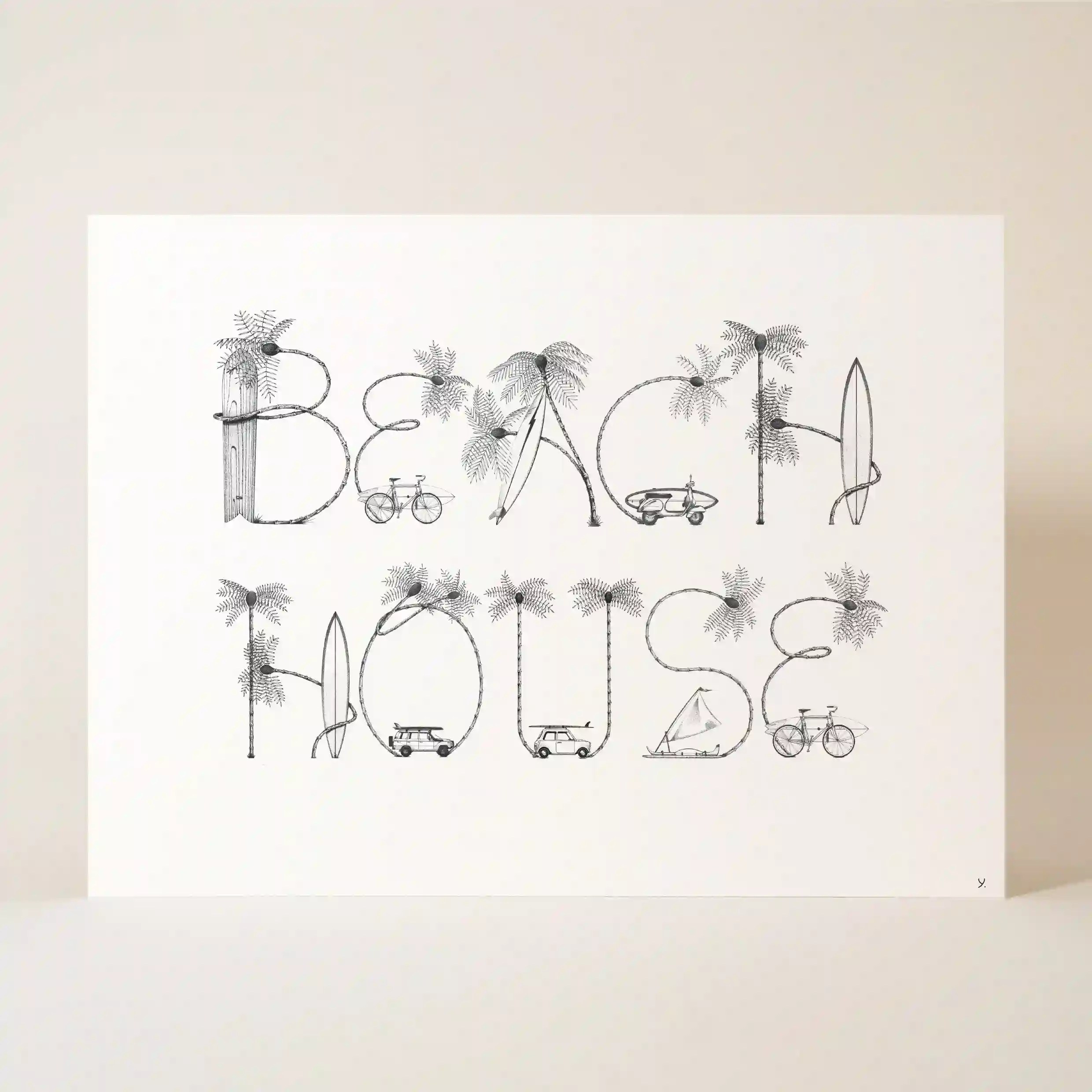 Cette affiche mer est bien plus qu’un simple texte. Chaque lettre de BEACH HOUSE est composée d’éléments iconiques du bord de mer :