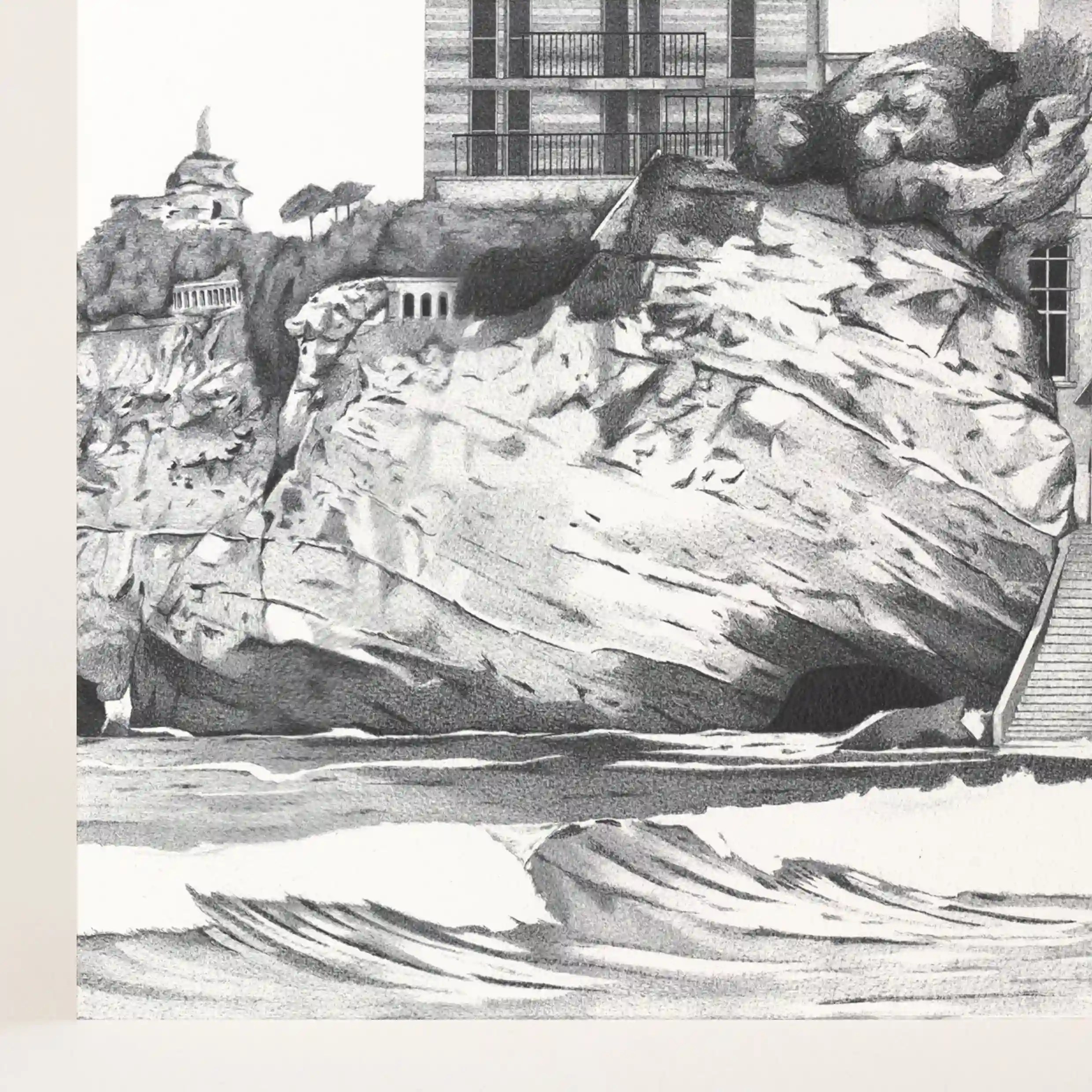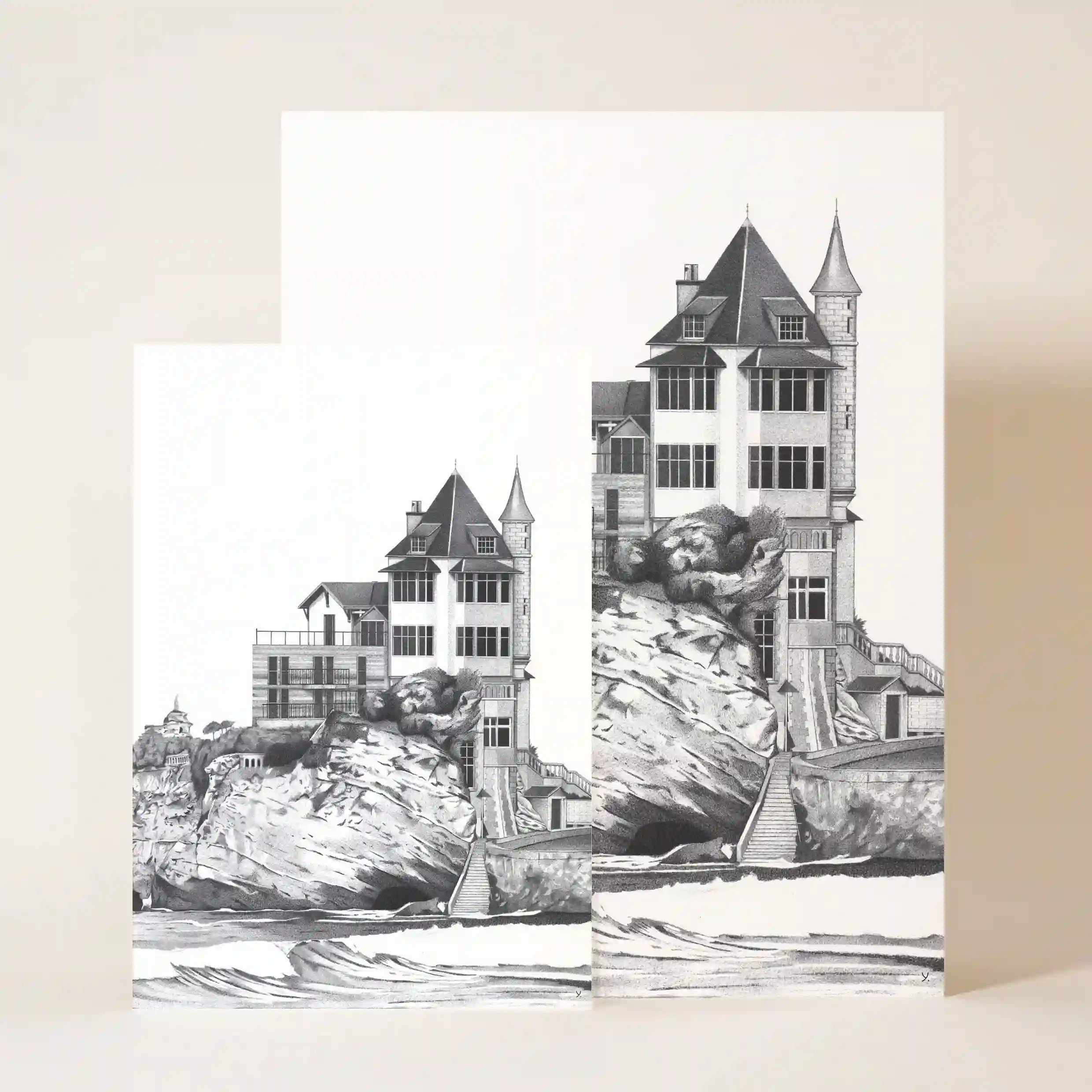 L’artiste a capté l’essence même de ce lieu mythique en jouant avec la lumière et les ombres, mettant en valeur les contrastes entre la bâtisse, la roche et les vagues déchaînées. Le trait précis et délicat du dessin confère une impression de réalisme saisissante, comme si la villa veillait éternellement sur l’océan.