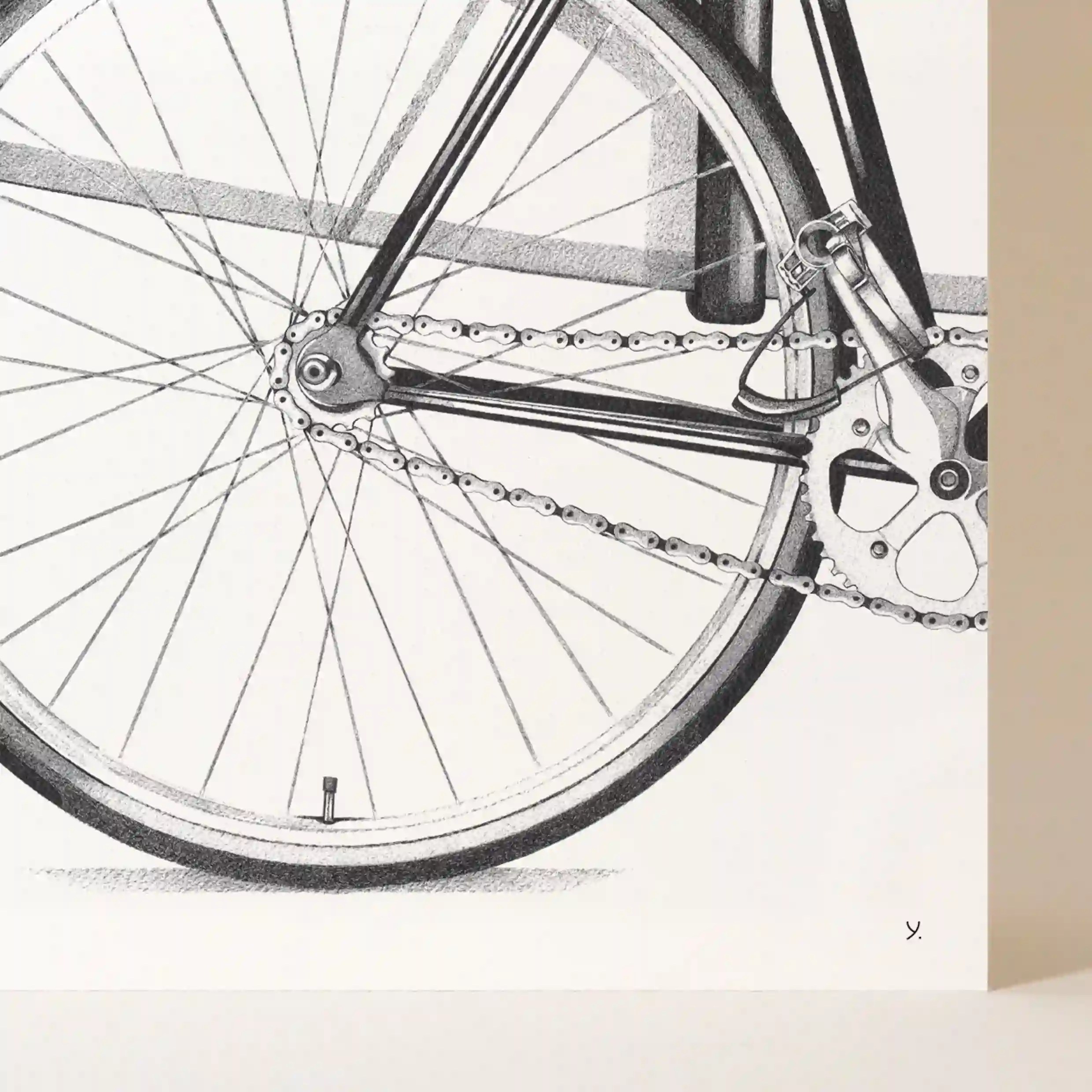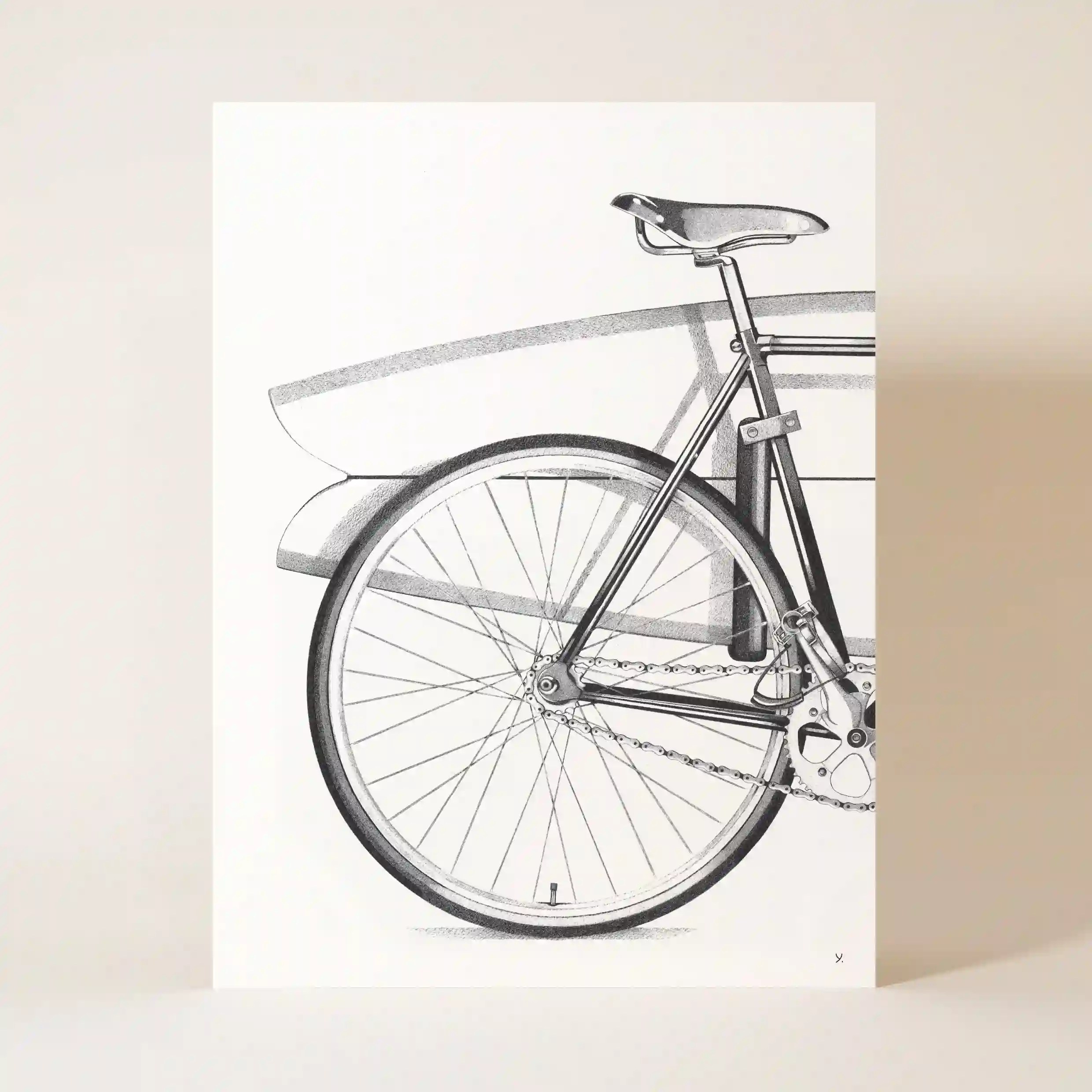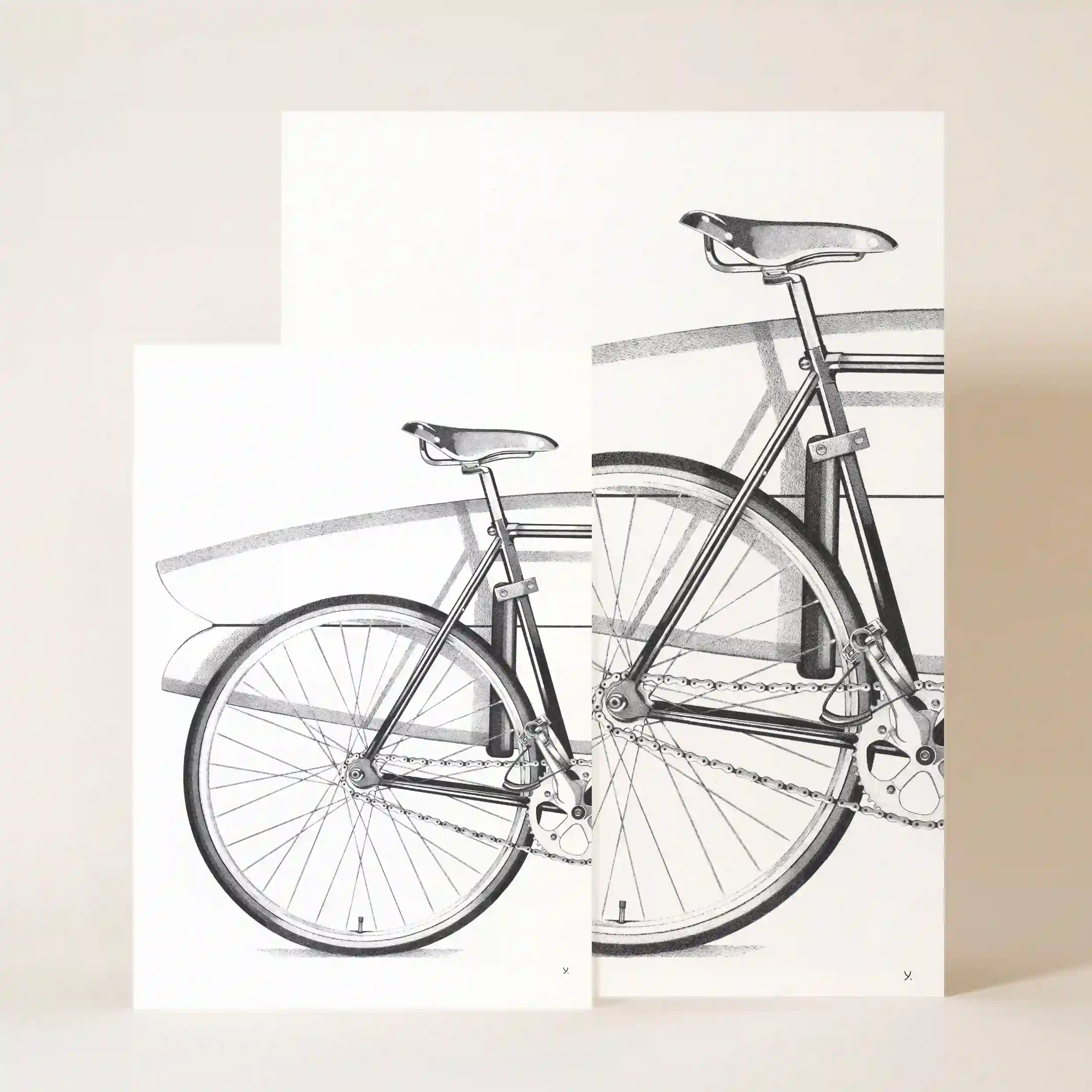 Ce contraste entre la structure mécanique du vélo et la douceur de la planche de surf crée une affiche originale qui saura séduire les amateurs de glisse, d’évasion et de design épuré. Avec son tracé précis et ses ombrages subtils, cette illustration joue sur les textures et les formes pour donner une profondeur unique à la composition.