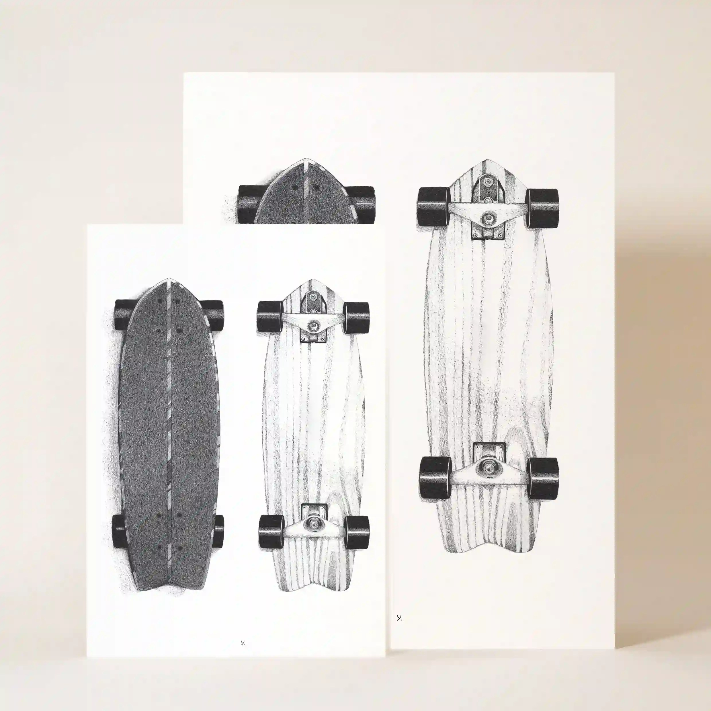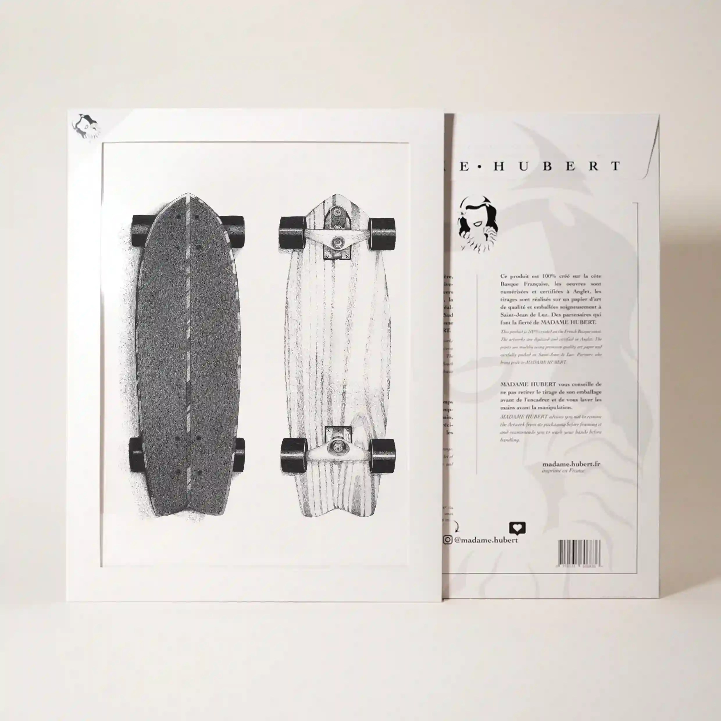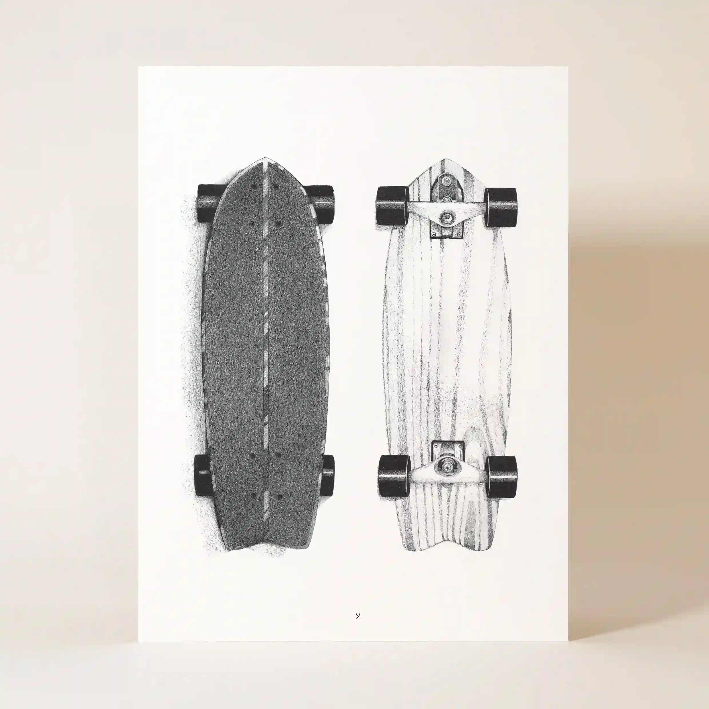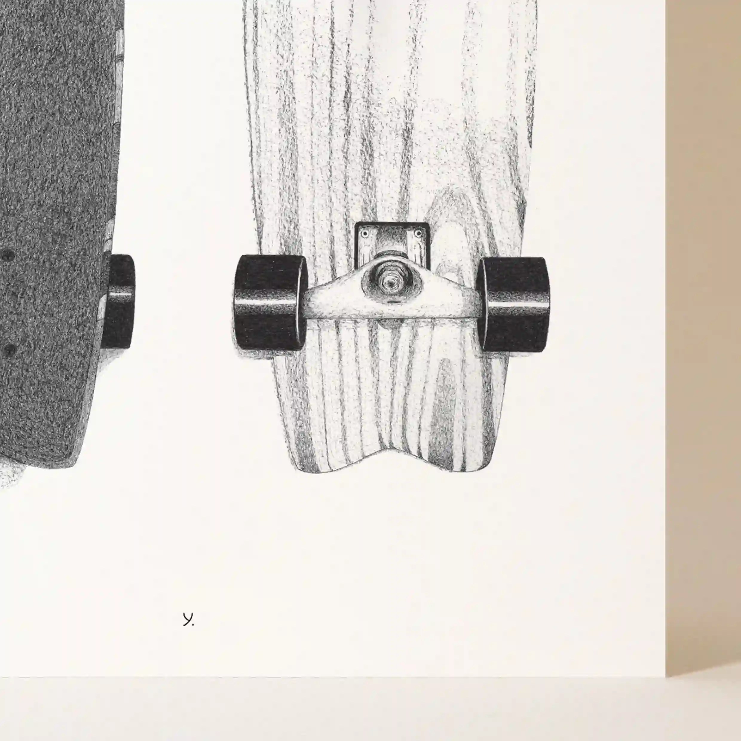 L’illustration, réalisée avec une technique précise de pointillisme et de hachures, retranscrit fidèlement les matières et les détails du bois, des trucks et des roues. Ce rendu réaliste apporte une touche intemporelle et graphique qui plaira aussi bien aux amateurs de skate qu’aux passionnés d’art.