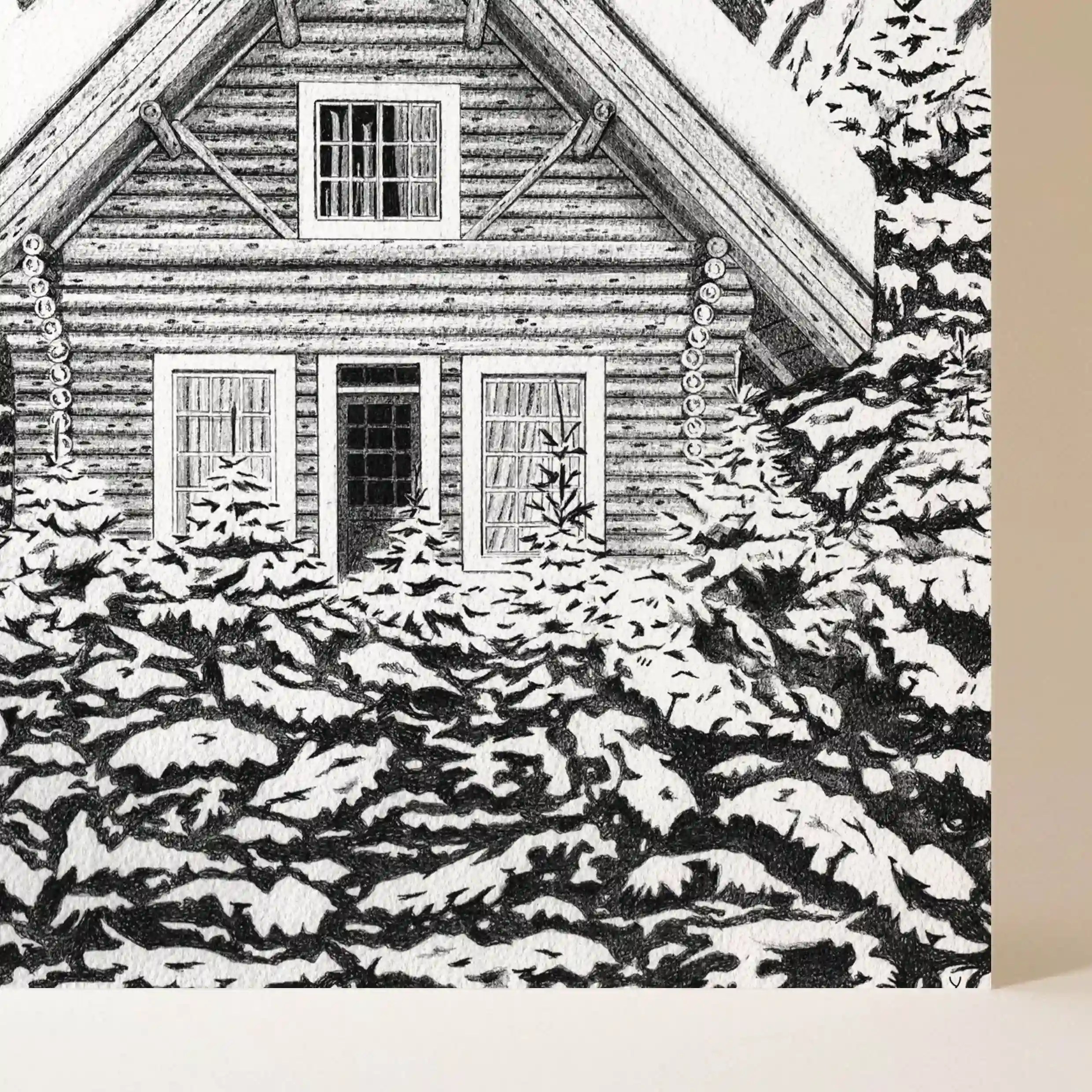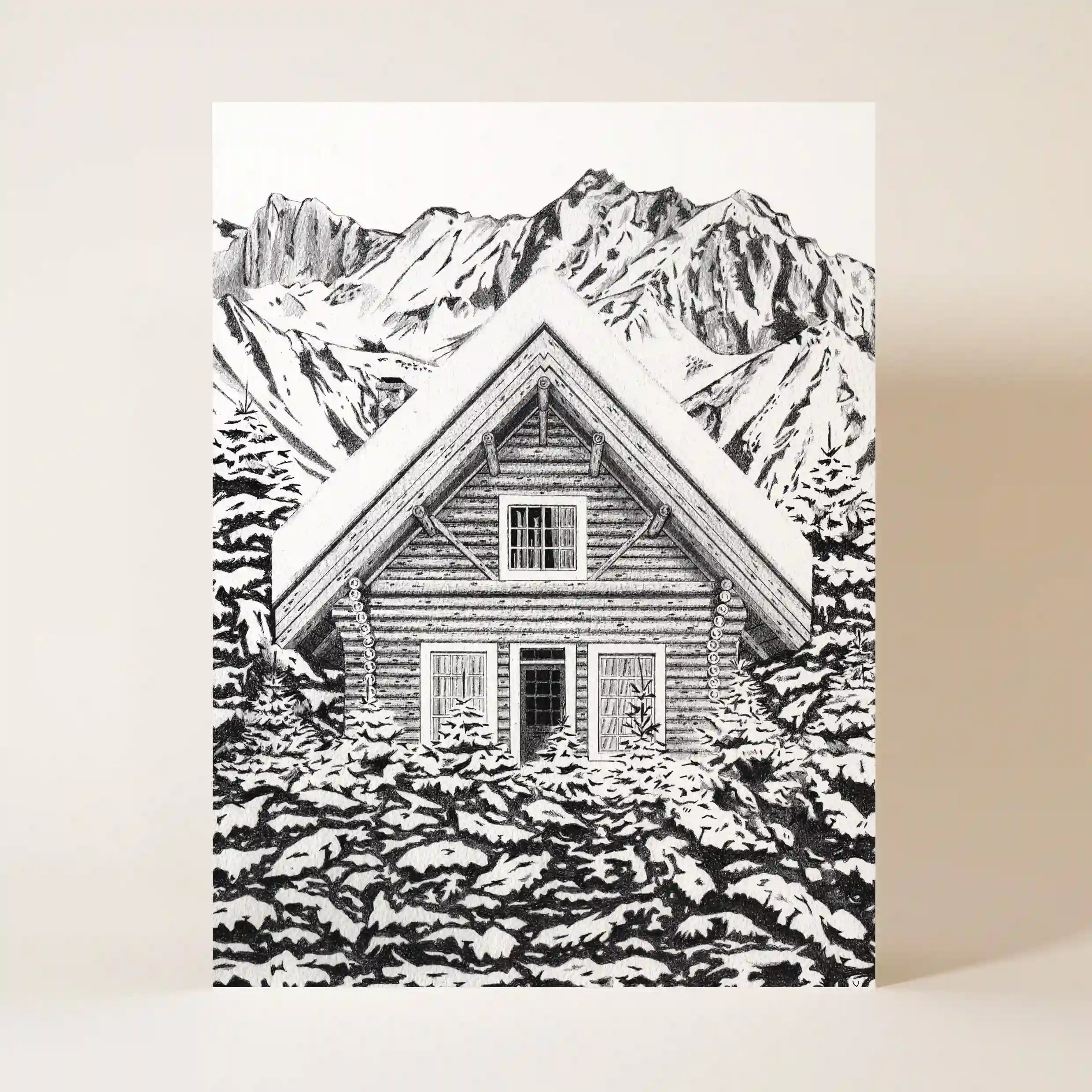 Plongez dans l’ambiance paisible et réconfortante d’un chalet montagnard perdu au cœur d’une forêt enneigée avec cette affiche montagne au style raffiné. Réalisée avec une précision remarquable en noir et blanc, cette illustration met en avant le charme intemporel d’une cabane en bois nichée entre les sapins, surplombée par des sommets majestueux.