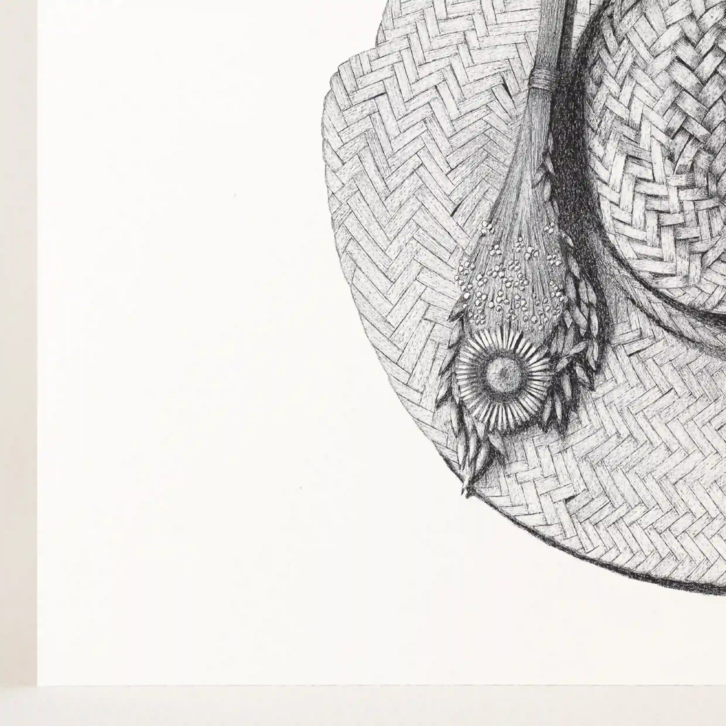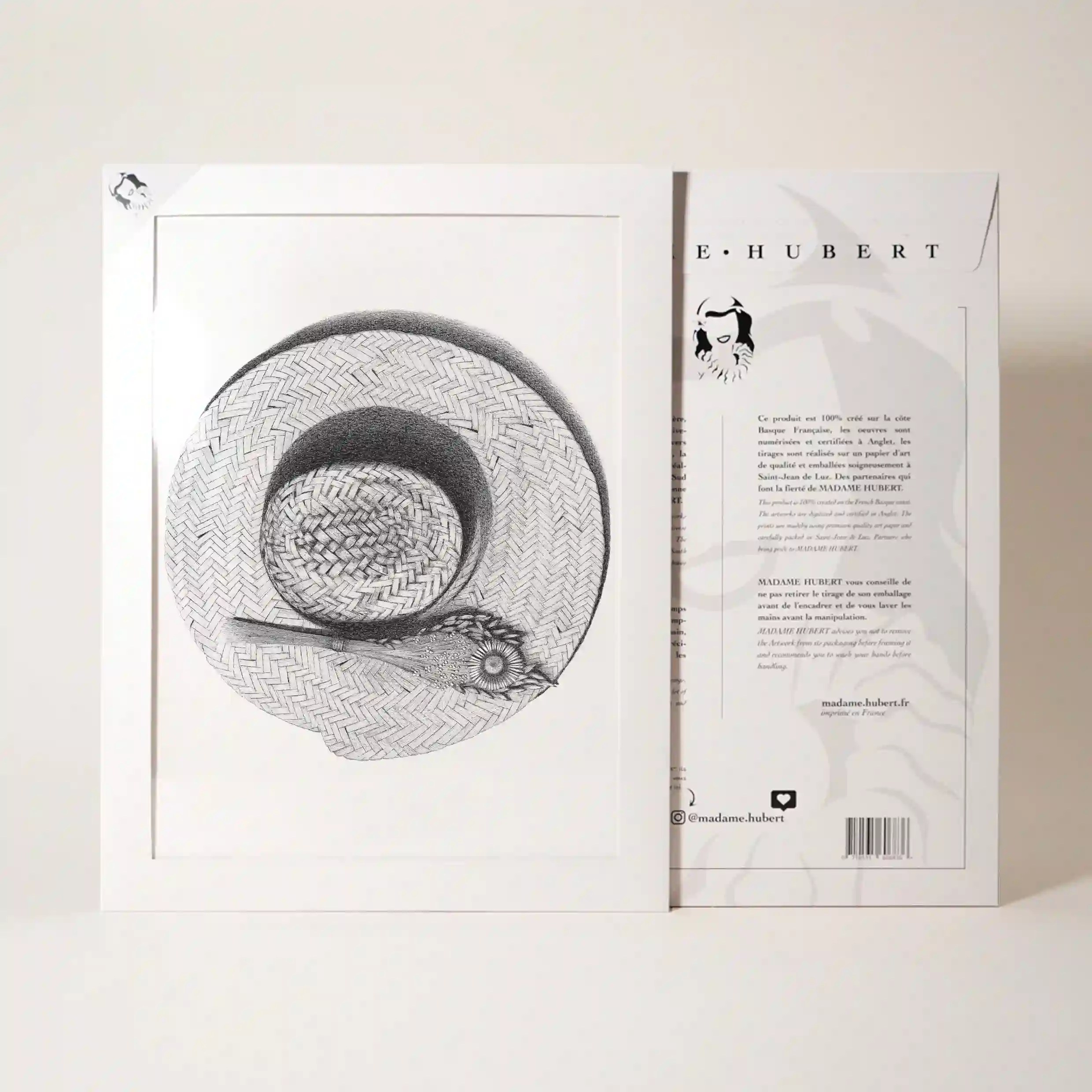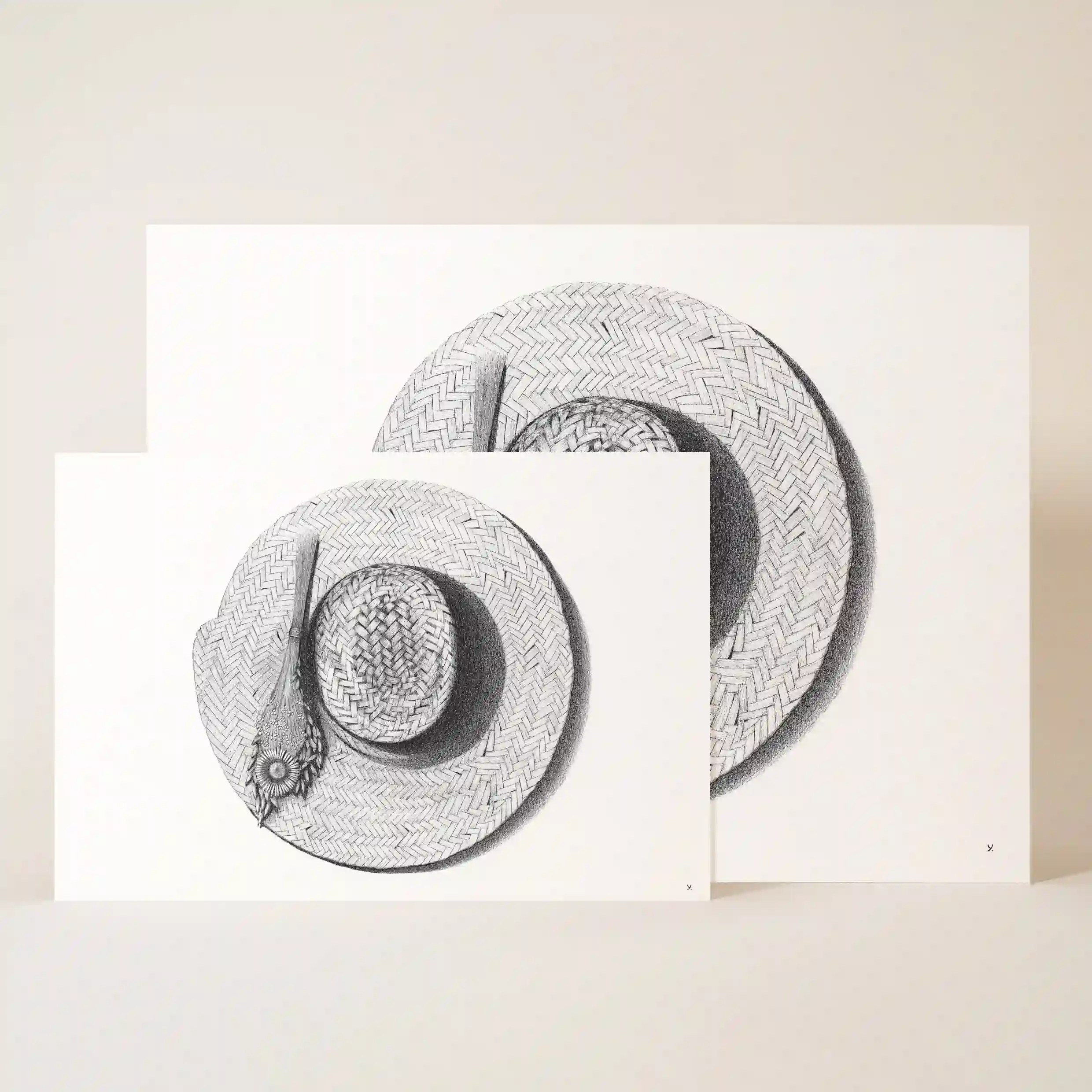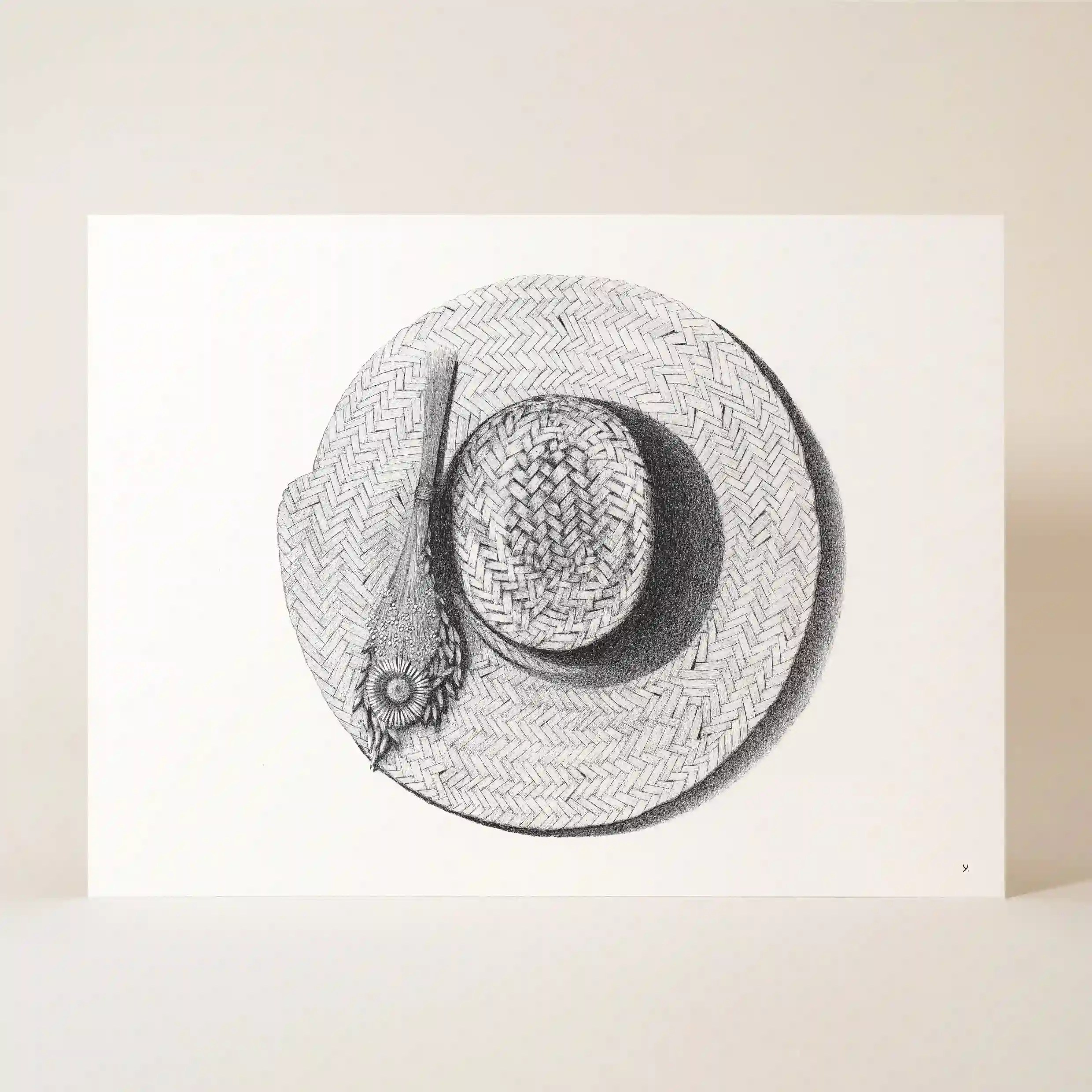 Ce dessin en noir et blanc sublime chaque détail du chapeau de paille tressé, élément iconique des escapades maritimes. Posé avec légèreté, il semble presque attendre que l’on vienne le saisir pour une promenade sur la plage. L’ombre portée renforce le réalisme de la scène et ajoute une profondeur saisissante. Le dessin joue subtilement avec la lumière pour mettre en valeur les textures naturelles des matériaux, offrant un rendu d’une extrême finesse.
