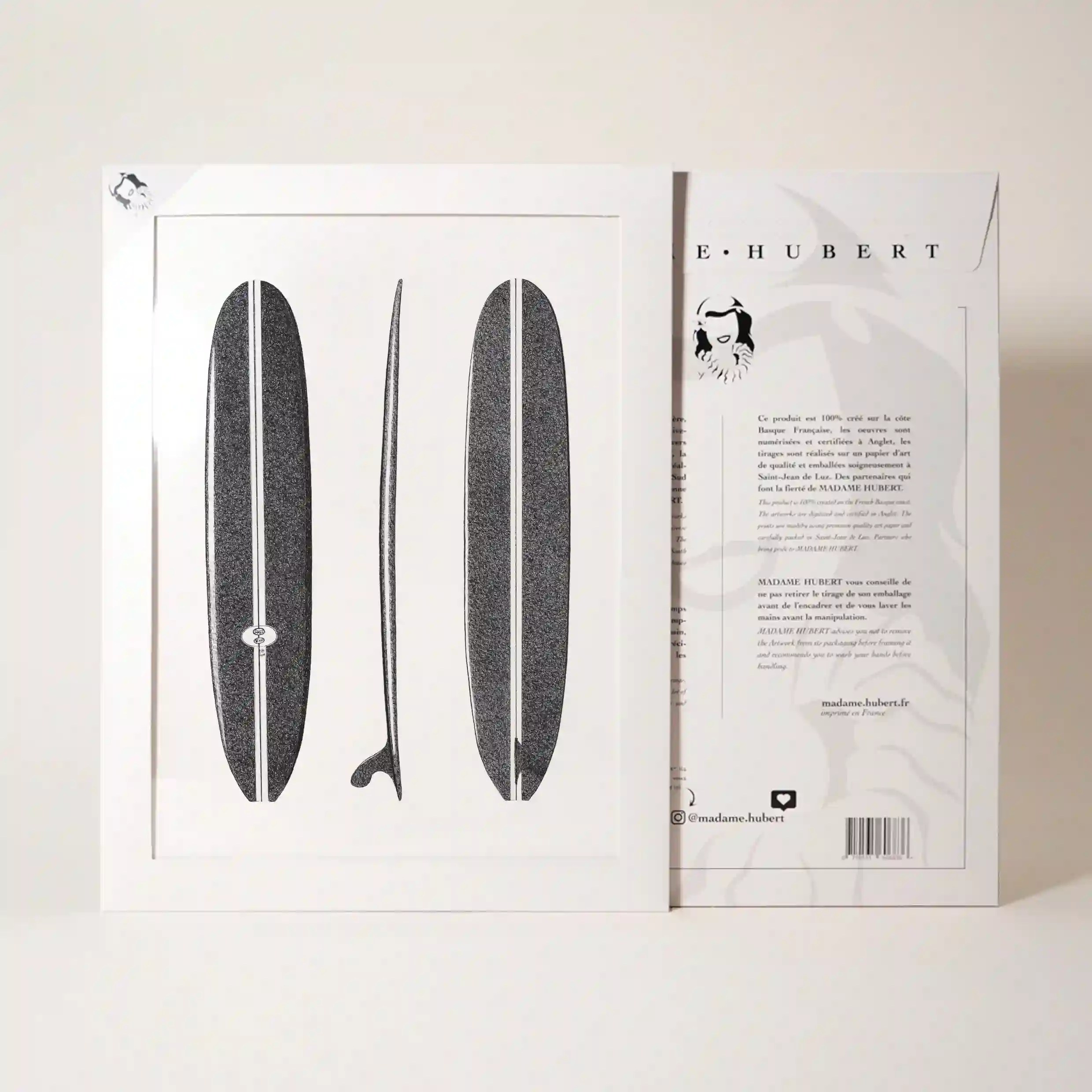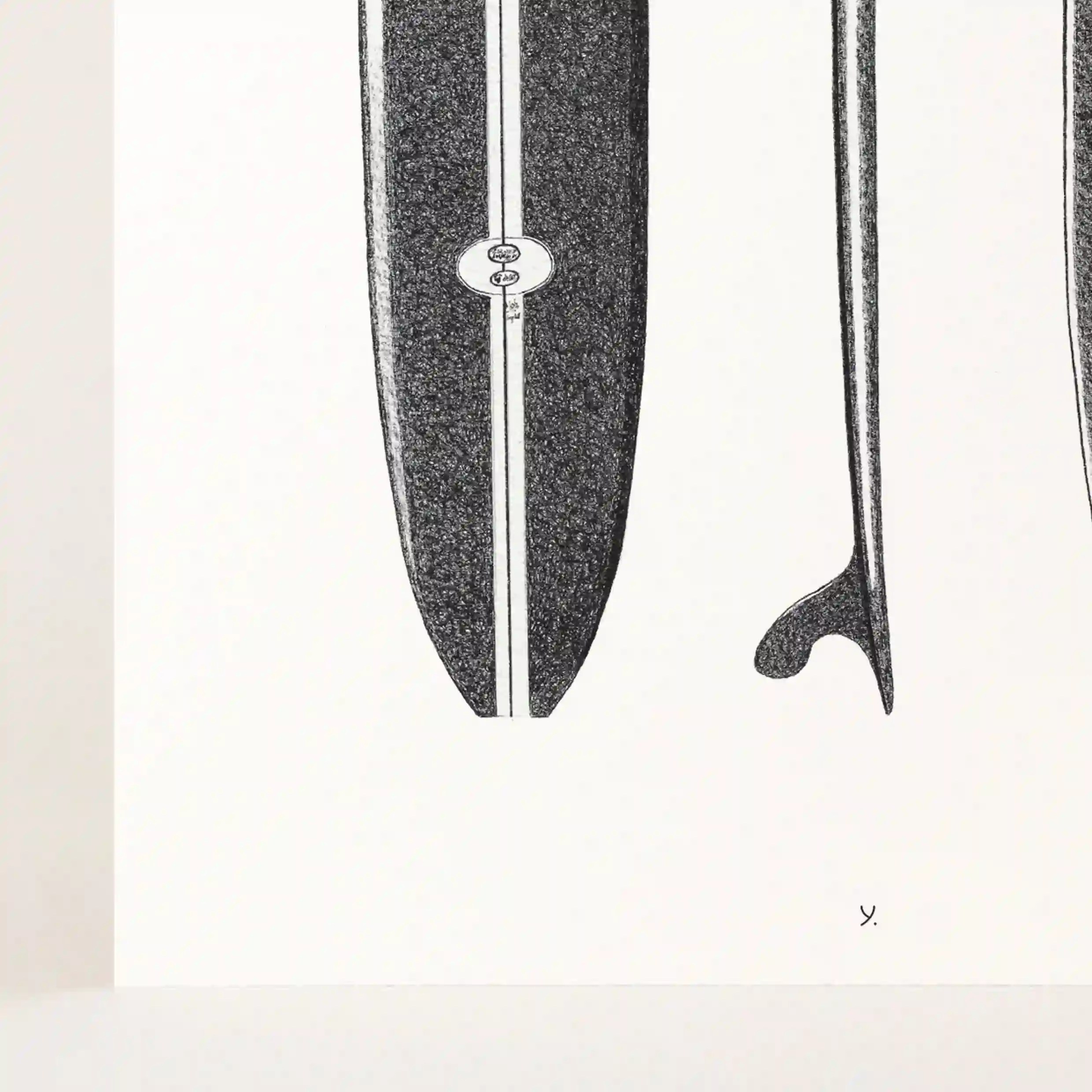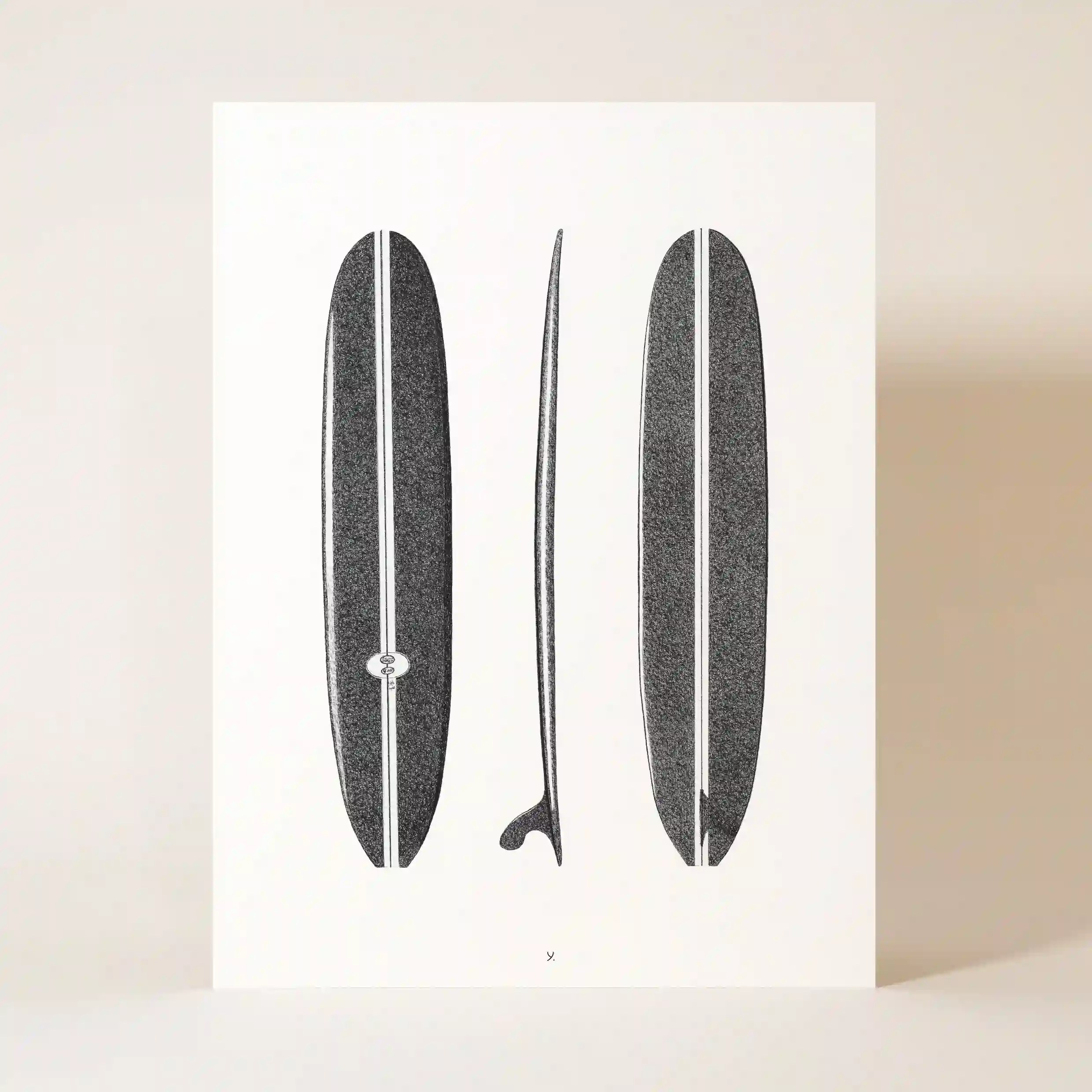 Ce dessin illustre avec précision et finesse un longboard iconique, connu pour sa maniabilité et son esthétique intemporelle. Présenté sous trois angles – de face, de profil et de dos – il met en avant la symétrie parfaite et les lignes épurées du shape, typiques des planches des années 60 et 70. Avec son design monochrome et ses contrastes subtils, cette affiche mer évoque la simplicité et la pureté du surf traditionnel.
