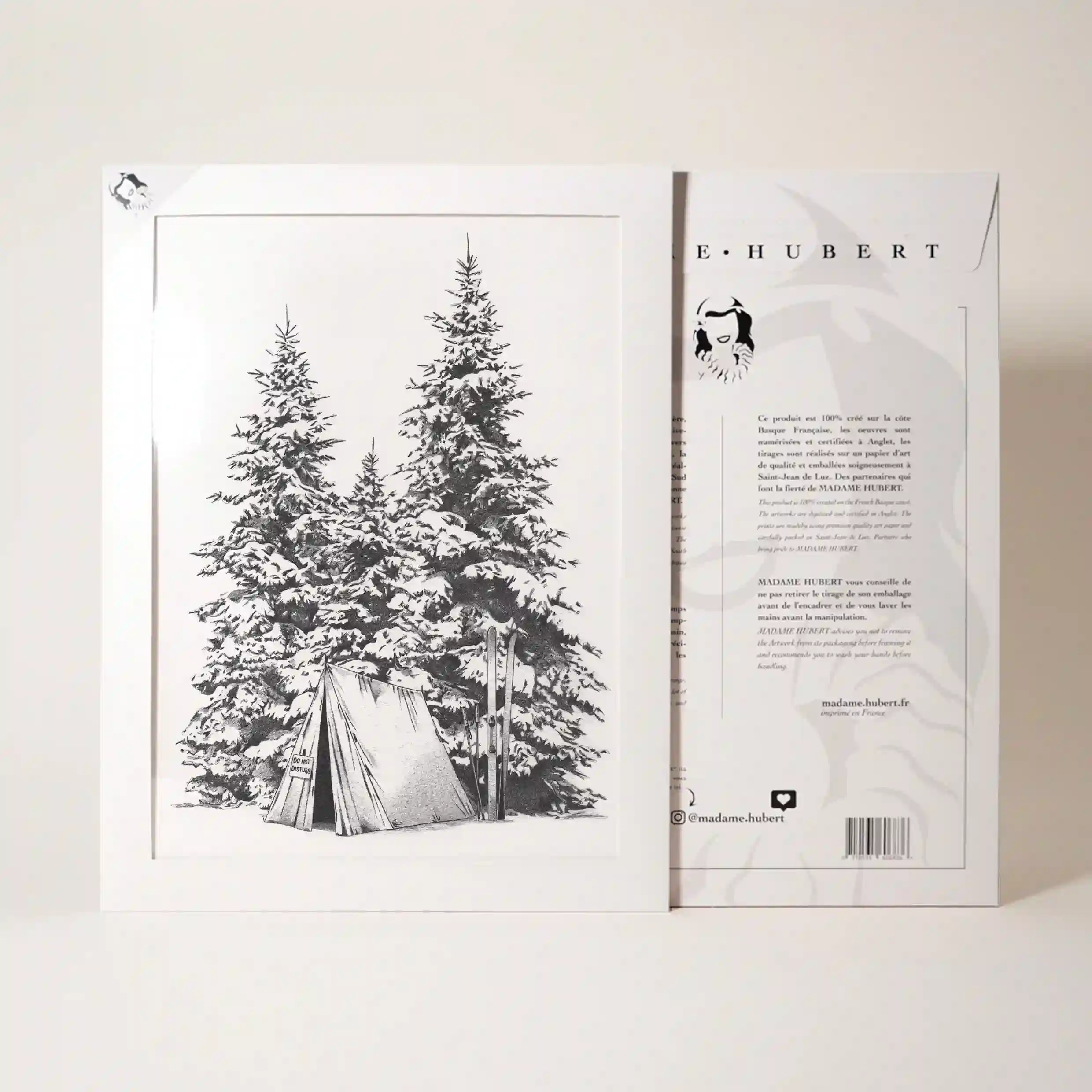 Cette affiche montagne transporte immédiatement le spectateur dans un décor hivernal authentique. Les sapins imposants, recouverts d’une épaisse couche de neige, se dressent en arrière-plan, créant une sensation de protection et d’intimité. La tente, installée avec soin, semble être le refuge parfait pour un aventurier ou un amoureux de la nature en quête de tranquillité.