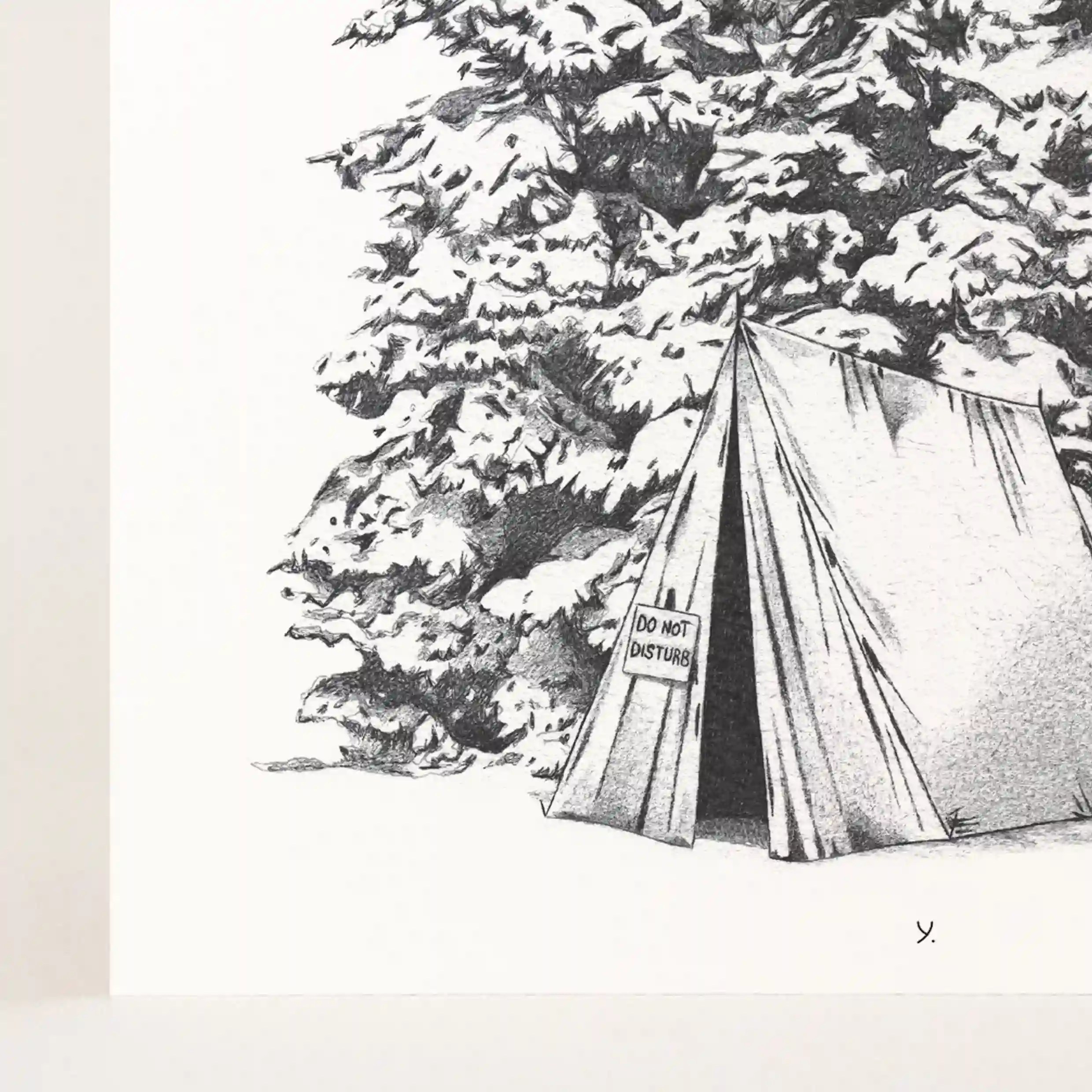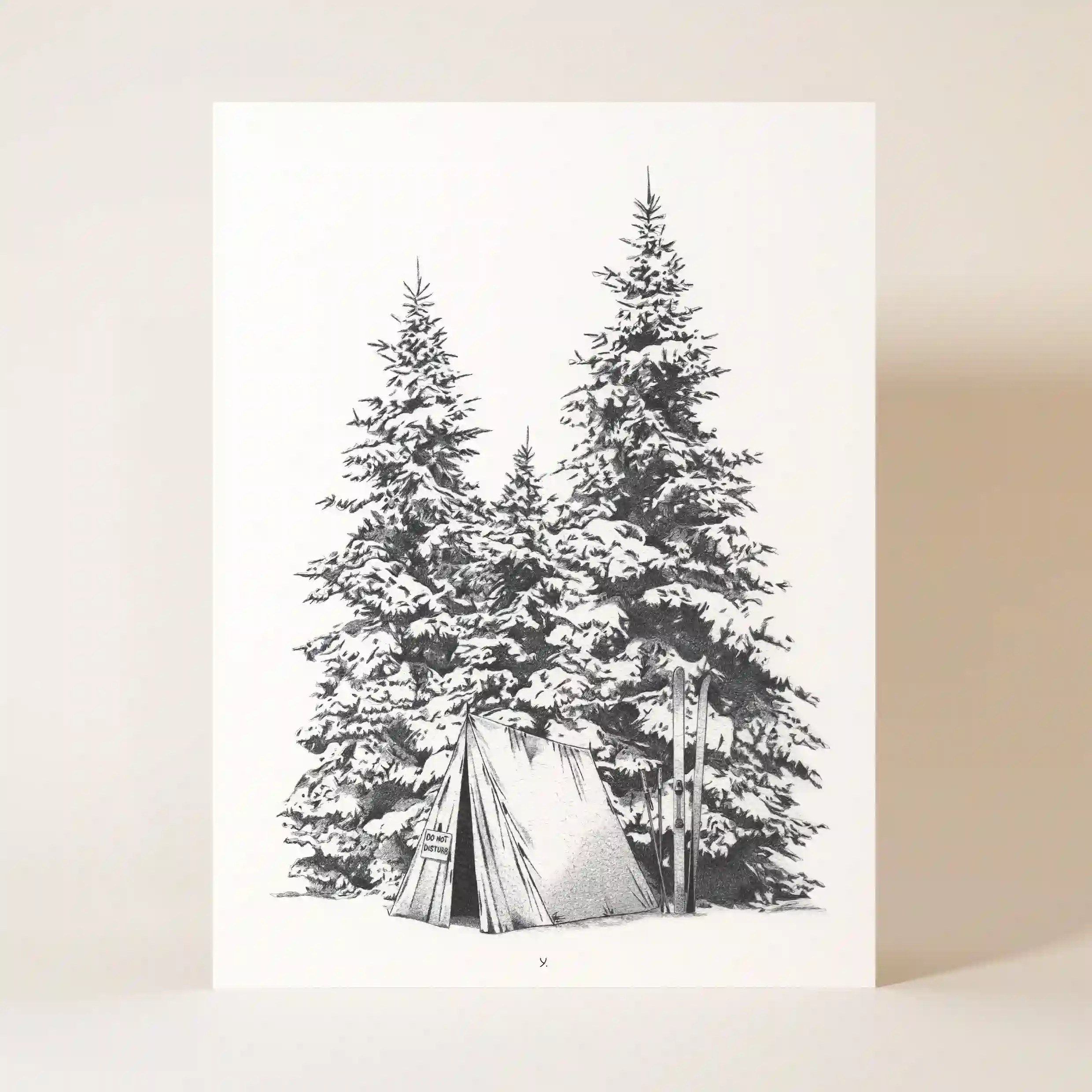 Plongez au cœur d’un paysage enneigé et sauvage avec cette affiche montagne empreinte de sérénité et d’évasion. Ce dessin en noir et blanc représente une scène à la fois minimaliste et immersive : une tente installée au pied de majestueux sapins couverts de neige, avec une paire de skis plantée dans le sol à proximité. Une pancarte « Do Not Disturb » accrochée à l’entrée de la tente ajoute une touche d’humour subtil, renforçant l’idée d’un refuge isolé, loin du tumulte du monde. Une affiche originale qui évoque la liberté, le calme et la beauté brute des grands espaces.