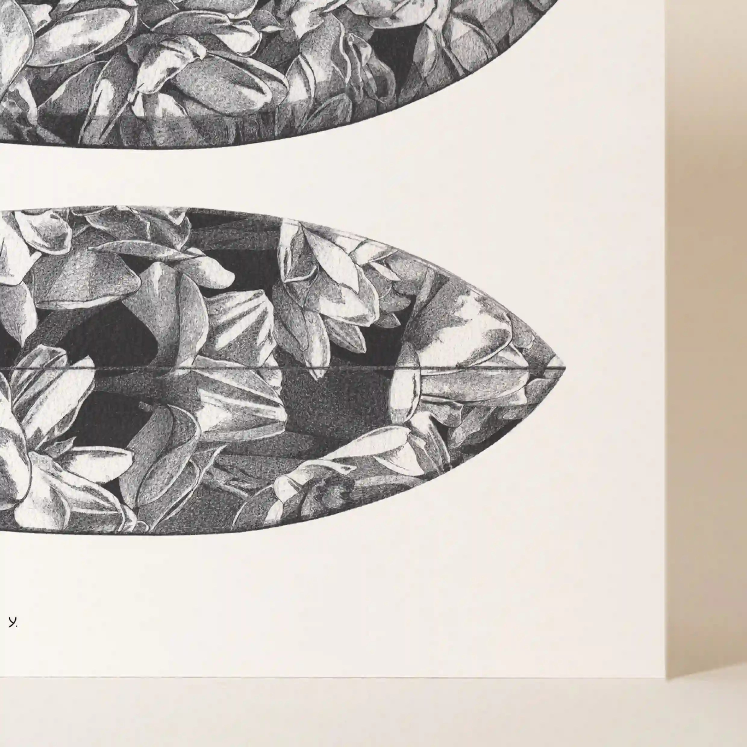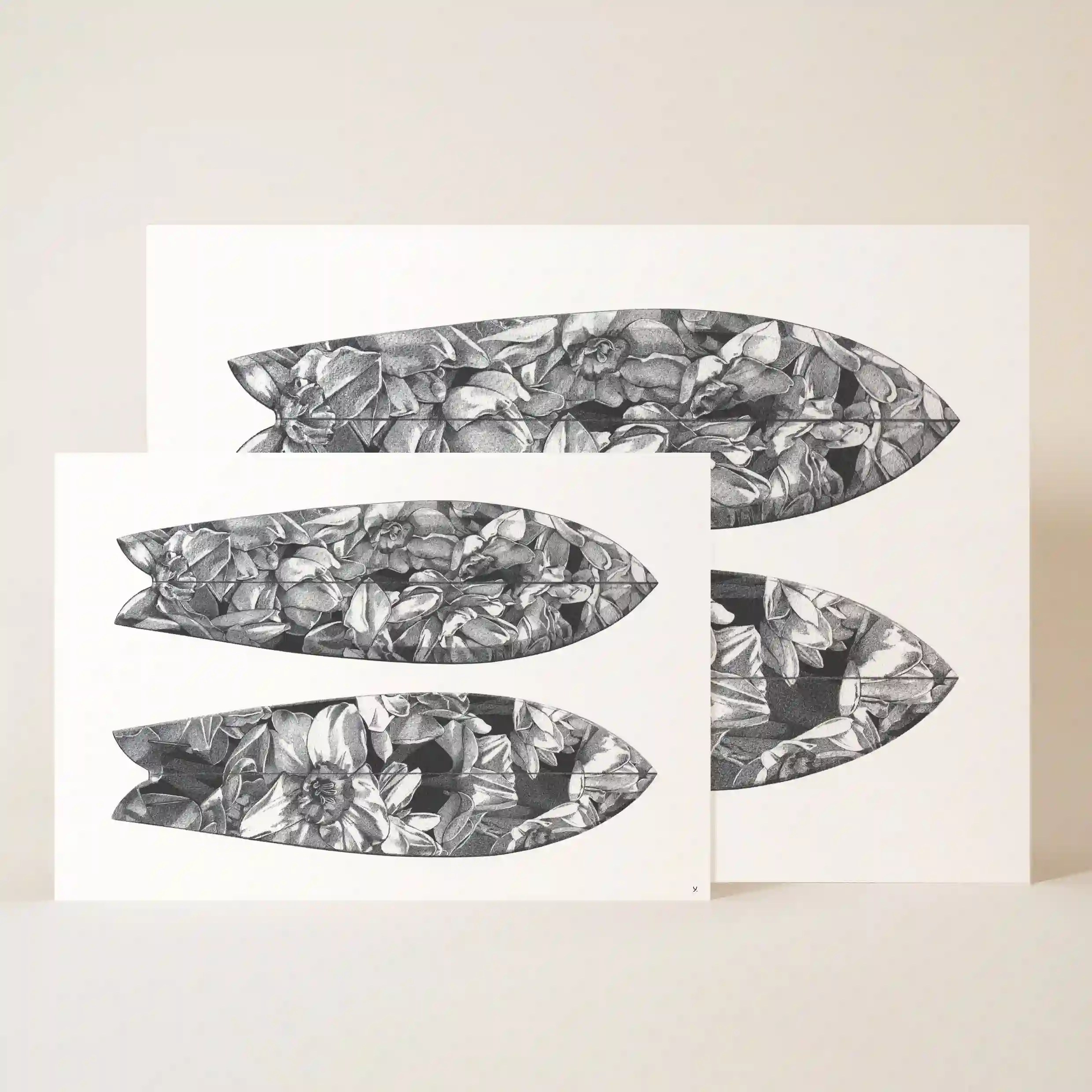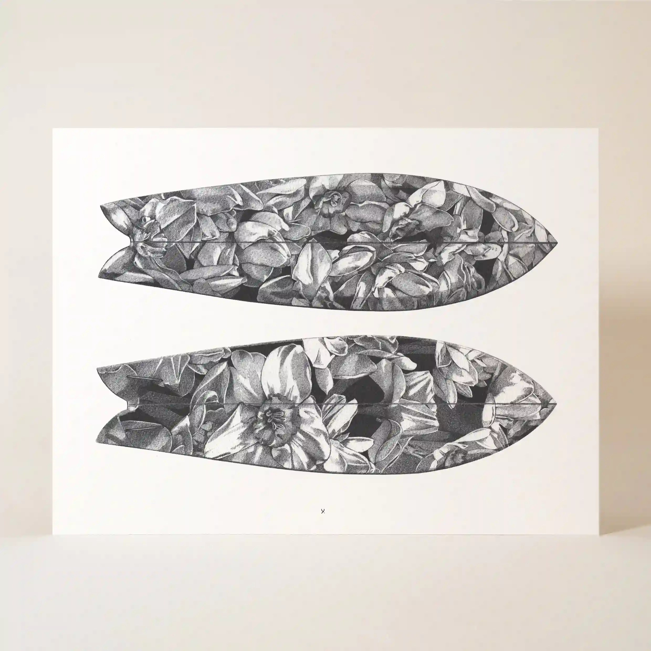 Ce dessin met en avant deux planches de surf « fish » qui se distinguent par leurs formes arrondies et leurs doubles dérives caractéristiques. Mais l’élément qui attire immédiatement le regard est le motif floral recouvrant ces planches, créant une fusion parfaite entre la nature et l’univers du surf. Ce jeu visuel entre les lignes du bois et les fleurs délicates offre une esthétique raffinée et pleine de poésie.