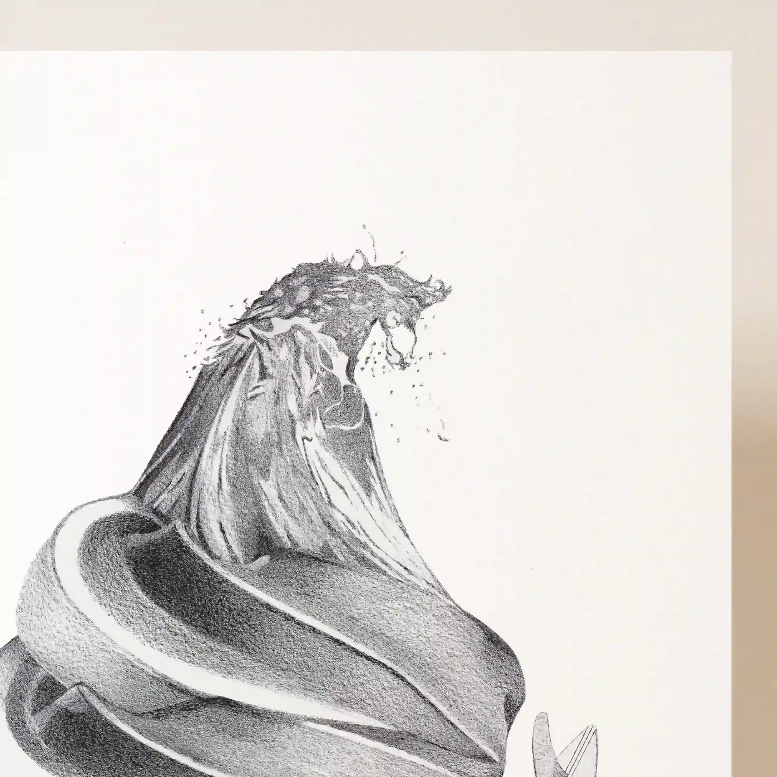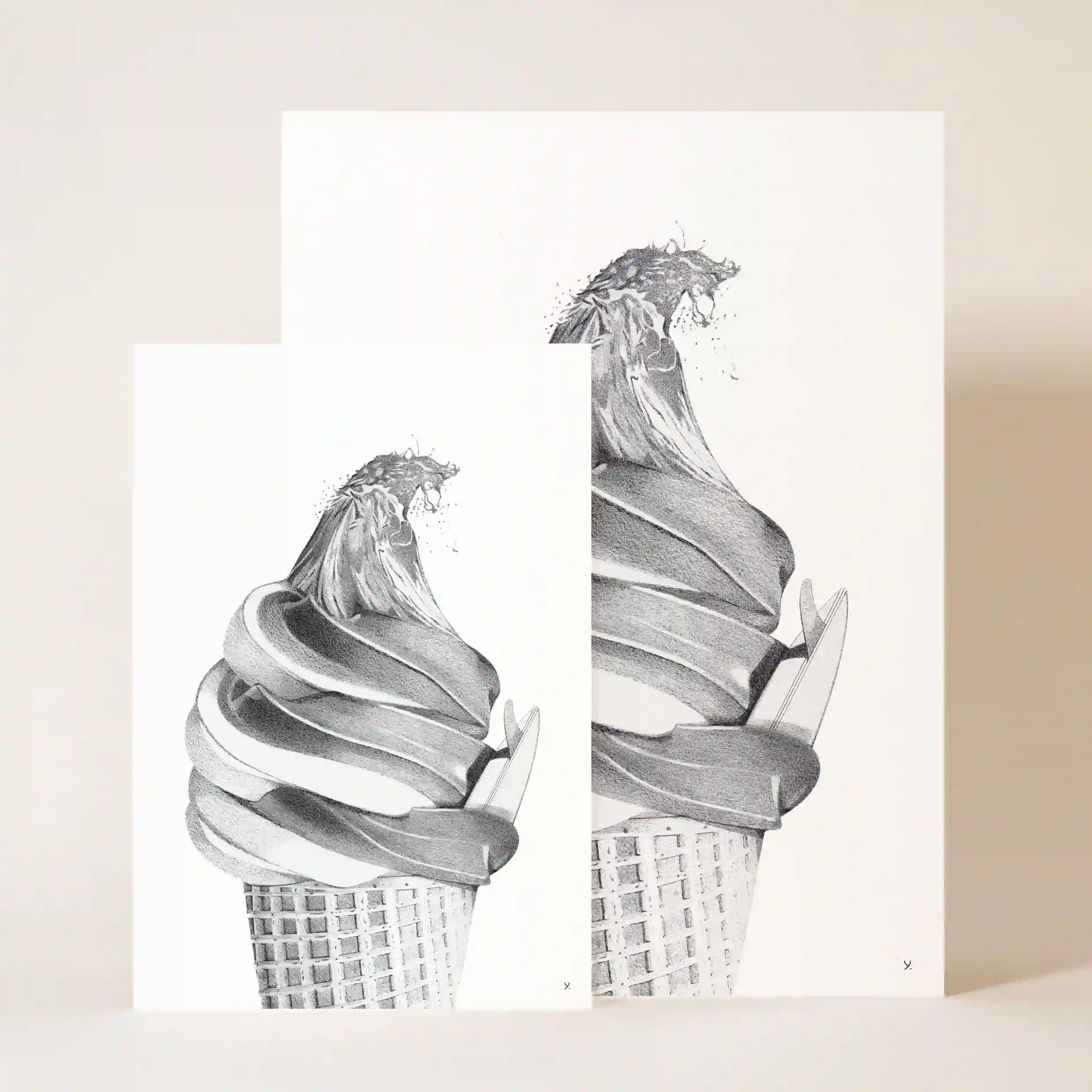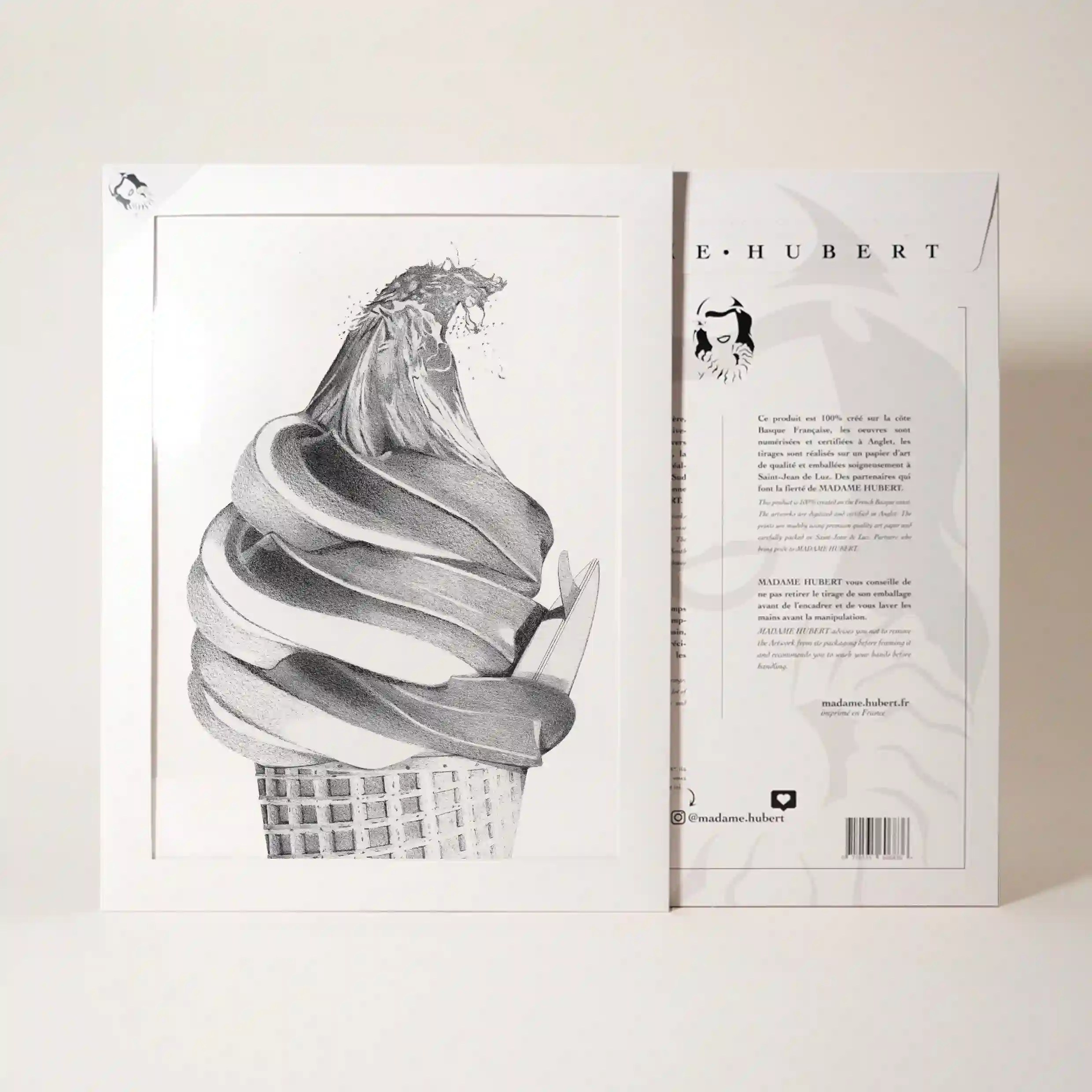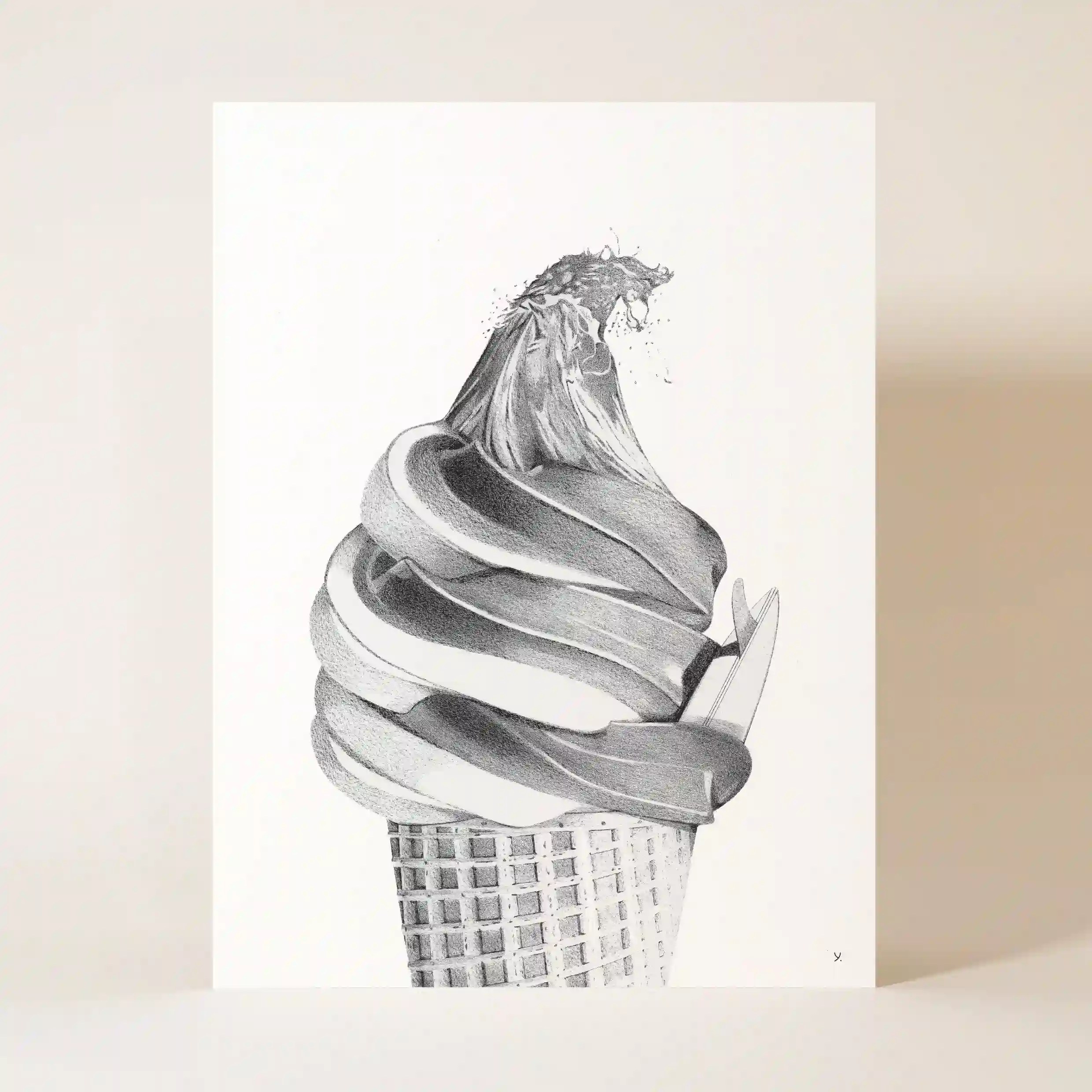 Cette œuvre graphique captivante se distingue par la finesse de ses détails. Le contraste entre la texture soyeuse de la glace et la force brute de la vague est magnifiquement retranscrit grâce à un travail de dessin précis et minutieux. Chaque élément, du cornet croustillant aux remous de l’eau, est mis en valeur avec une technique de dégradés et d’ombres qui donne une impression de relief et de mouvement saisissant.