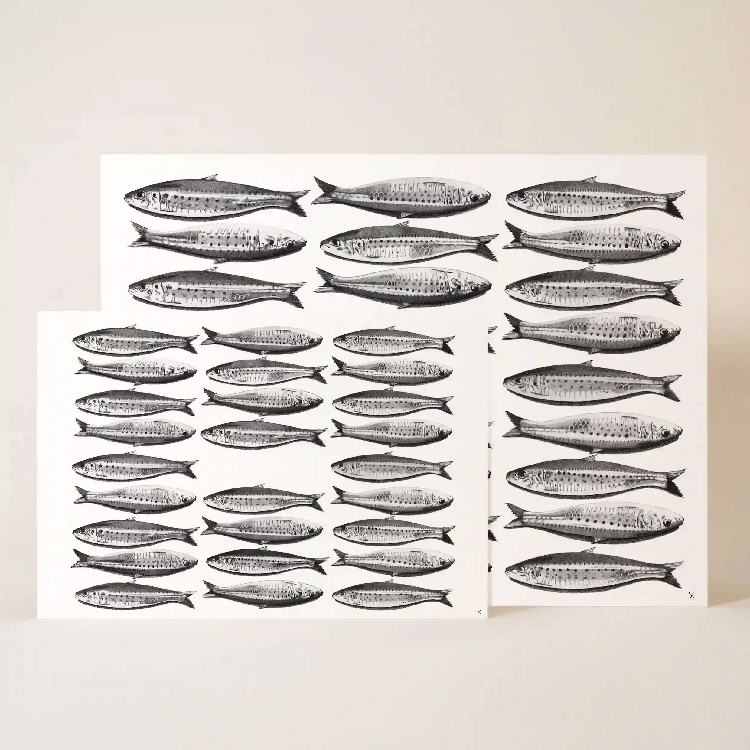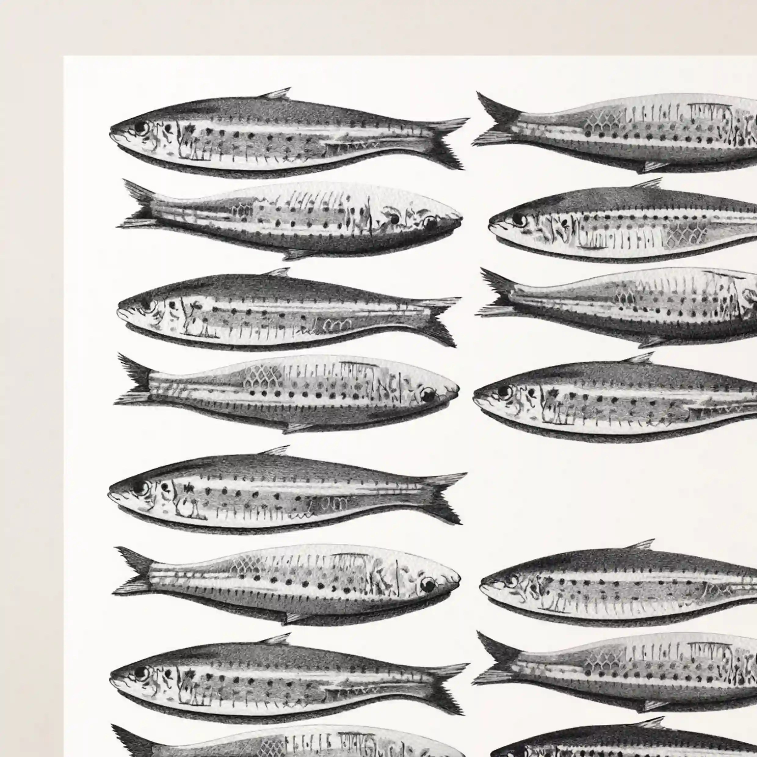 Cette affiche mer est une véritable immersion dans l’univers maritime. Les sardines, dessinées avec une grande précision, sont alignées dans un arrangement structuré qui évoque la synchronisation parfaite des bancs de poissons nageant ensemble. Chaque détail est soigneusement travaillé, des écailles miroitantes aux nageoires délicates, rendant cette œuvre à la fois minimaliste et riche en textures.