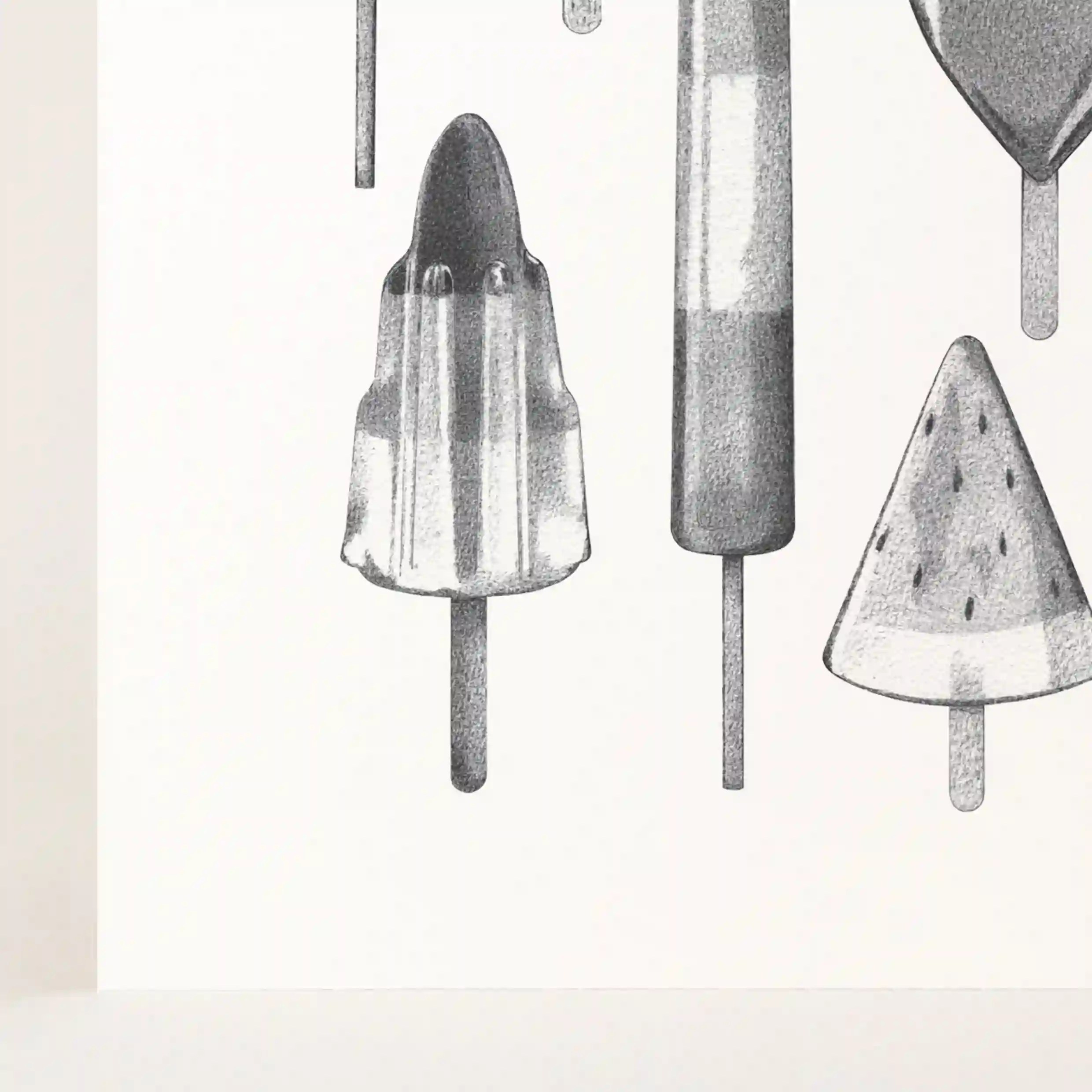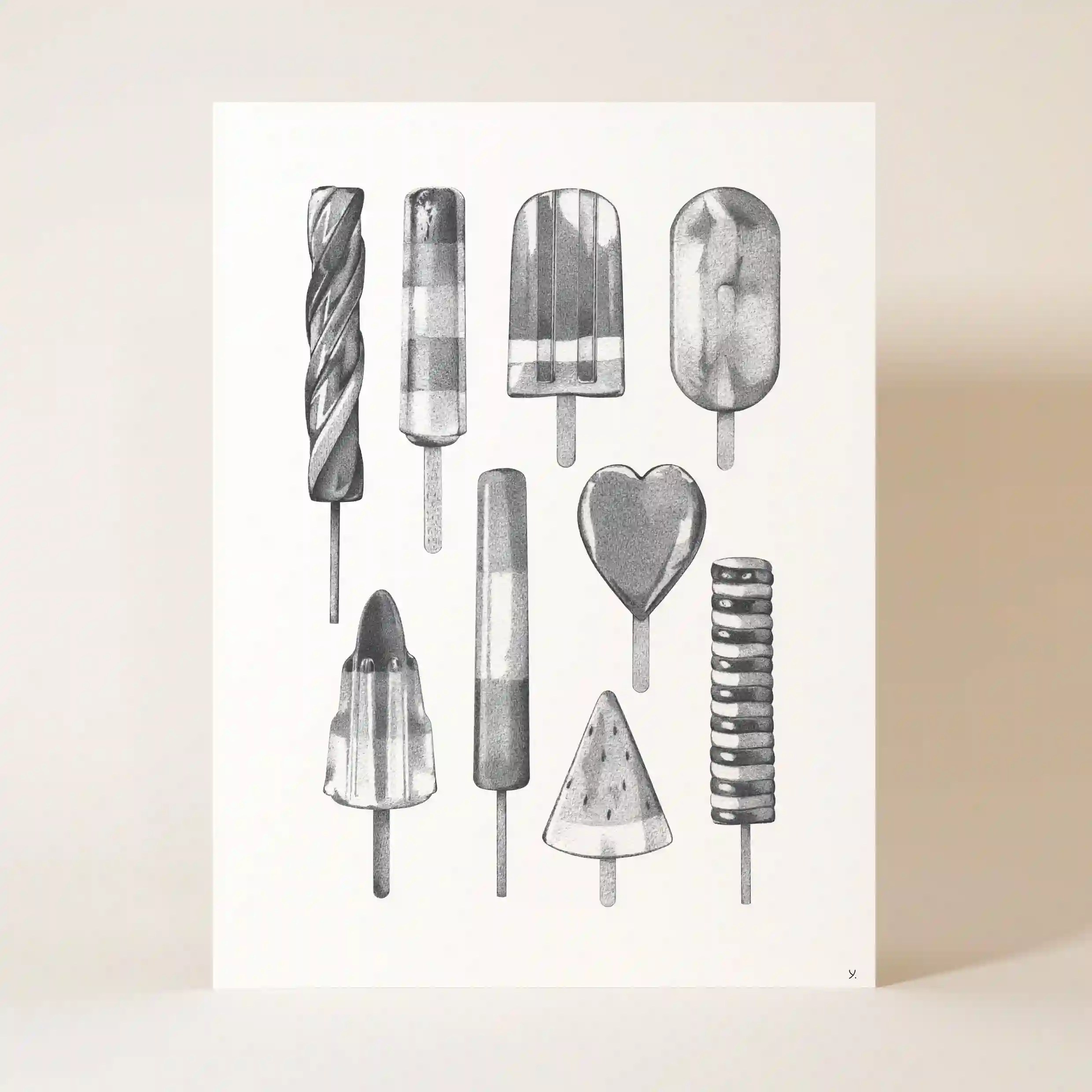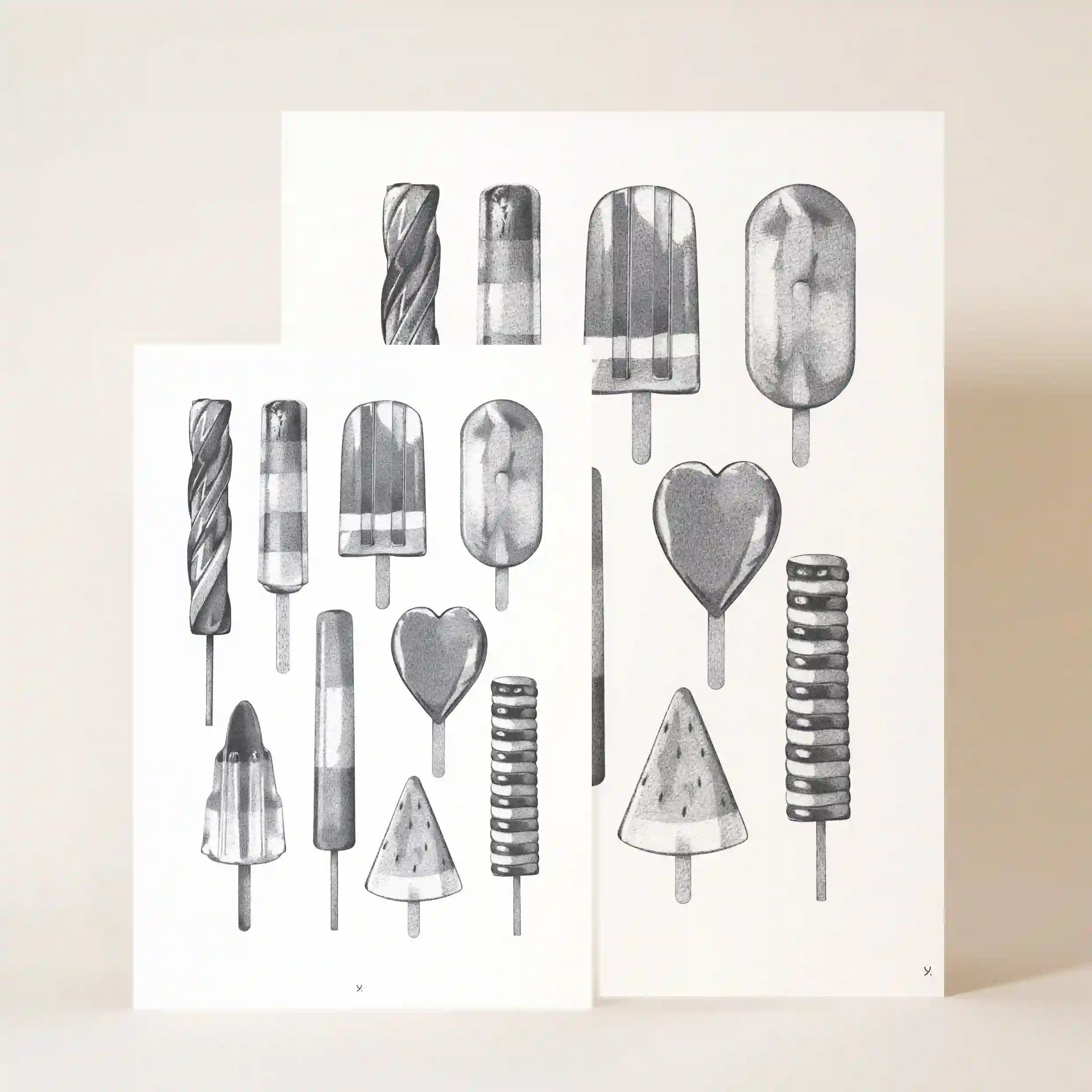 Cette illustration en noir et blanc capture avec finesse la diversité des bâtonnets glacés : torsadés, en forme de cœur, rayés ou encore en pointe de pastèque, chaque glace est représentée avec un niveau de détail impressionnant. Le réalisme du dessin, allié à une touche d’humour et de tendresse, évoque immédiatement des souvenirs d’été, de plage et d’insouciance.