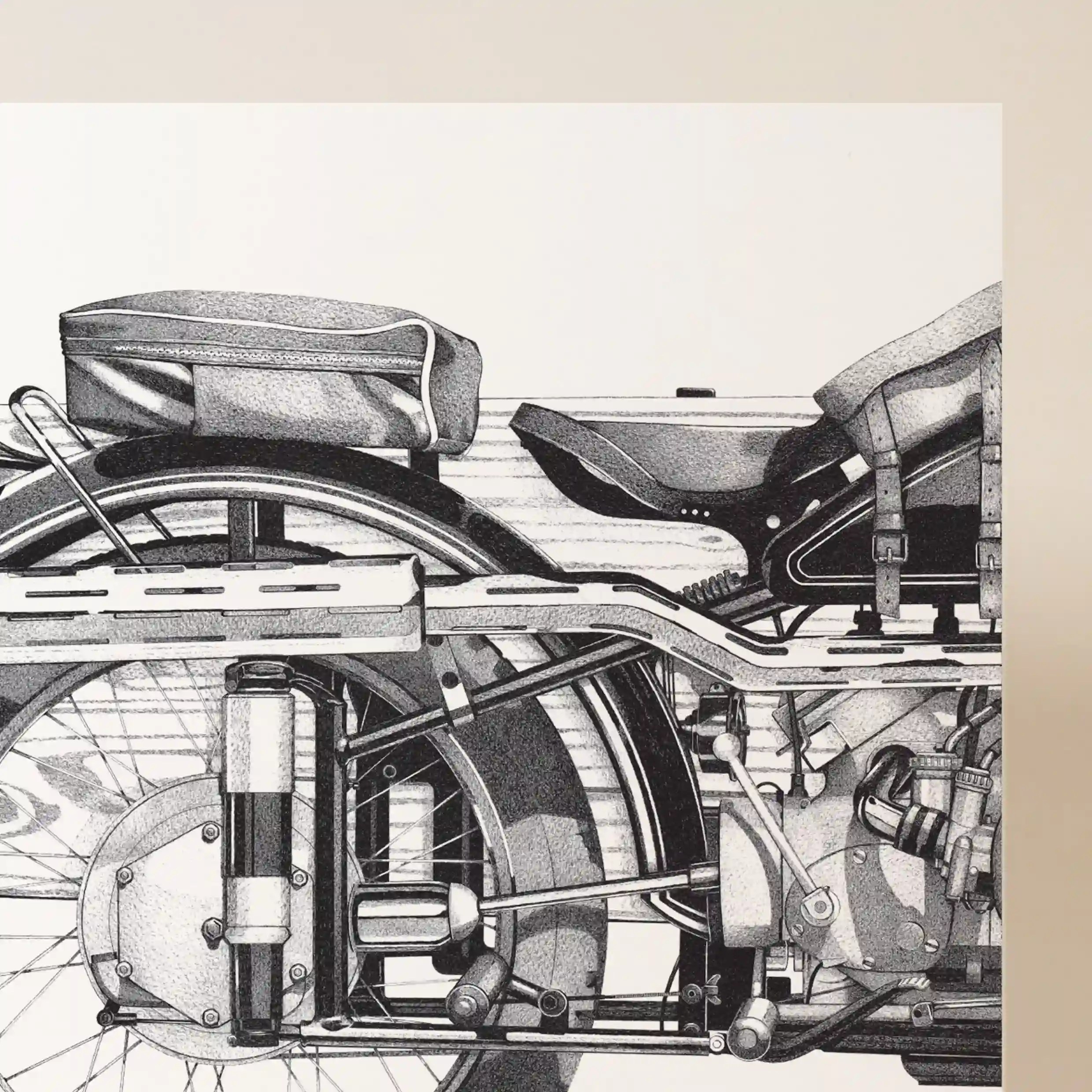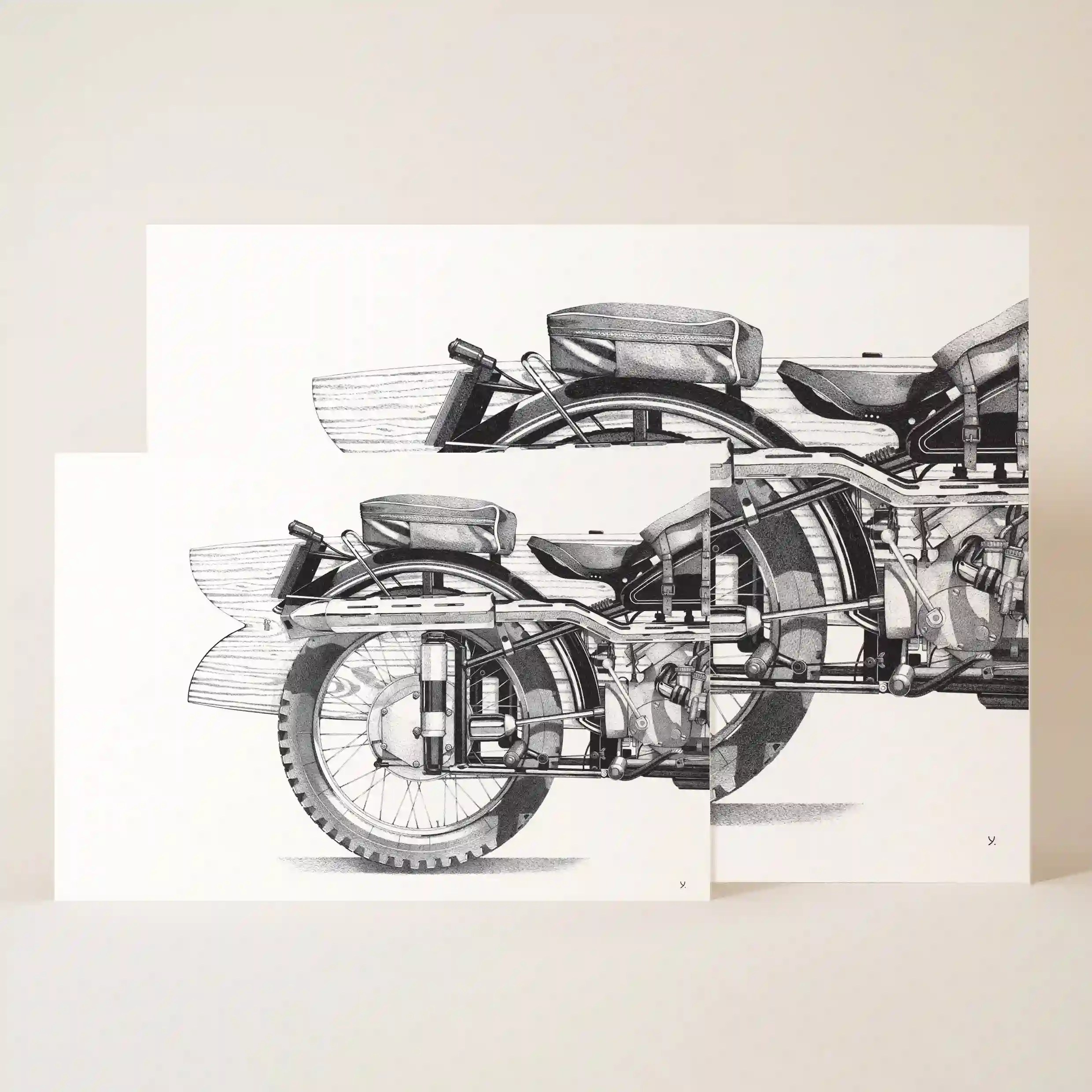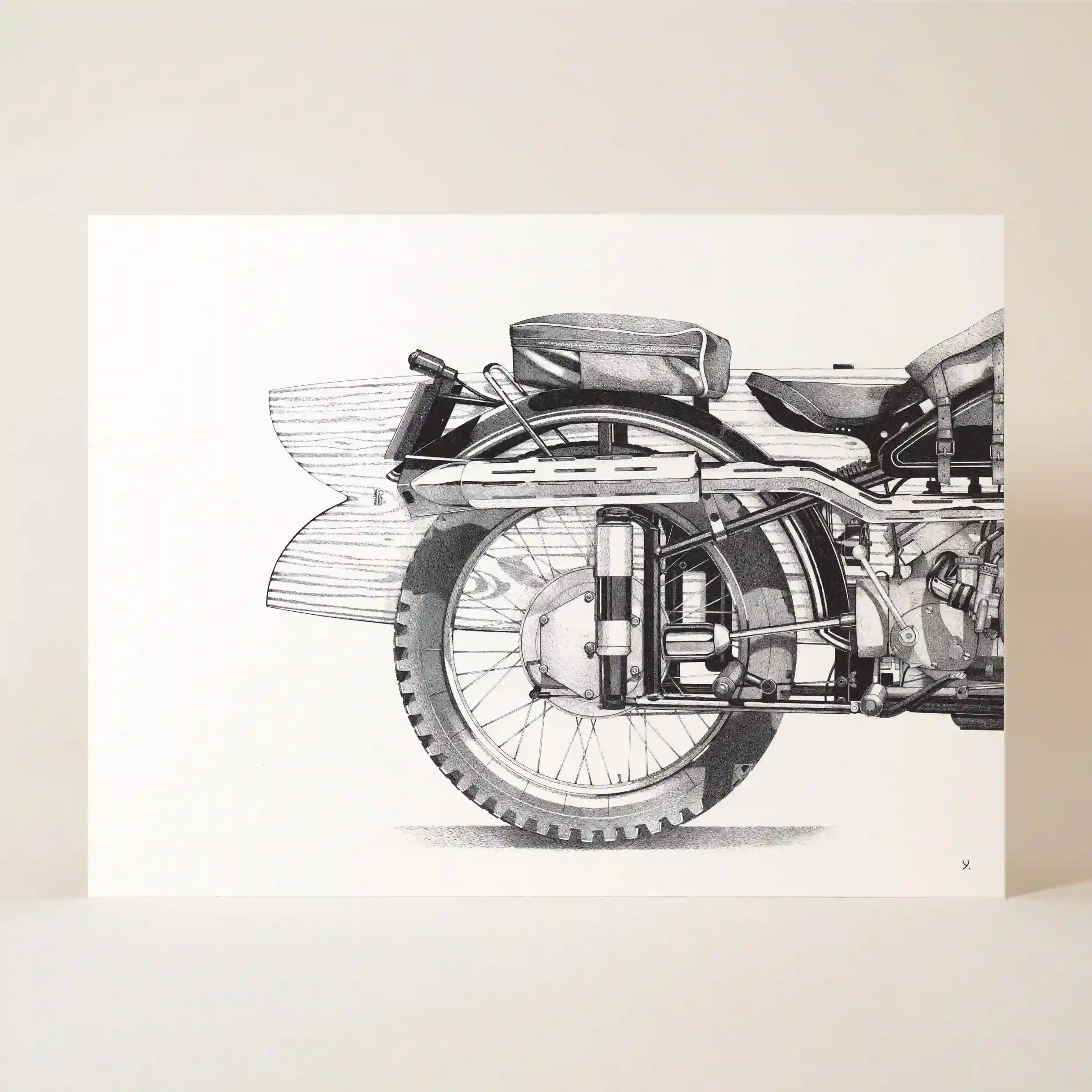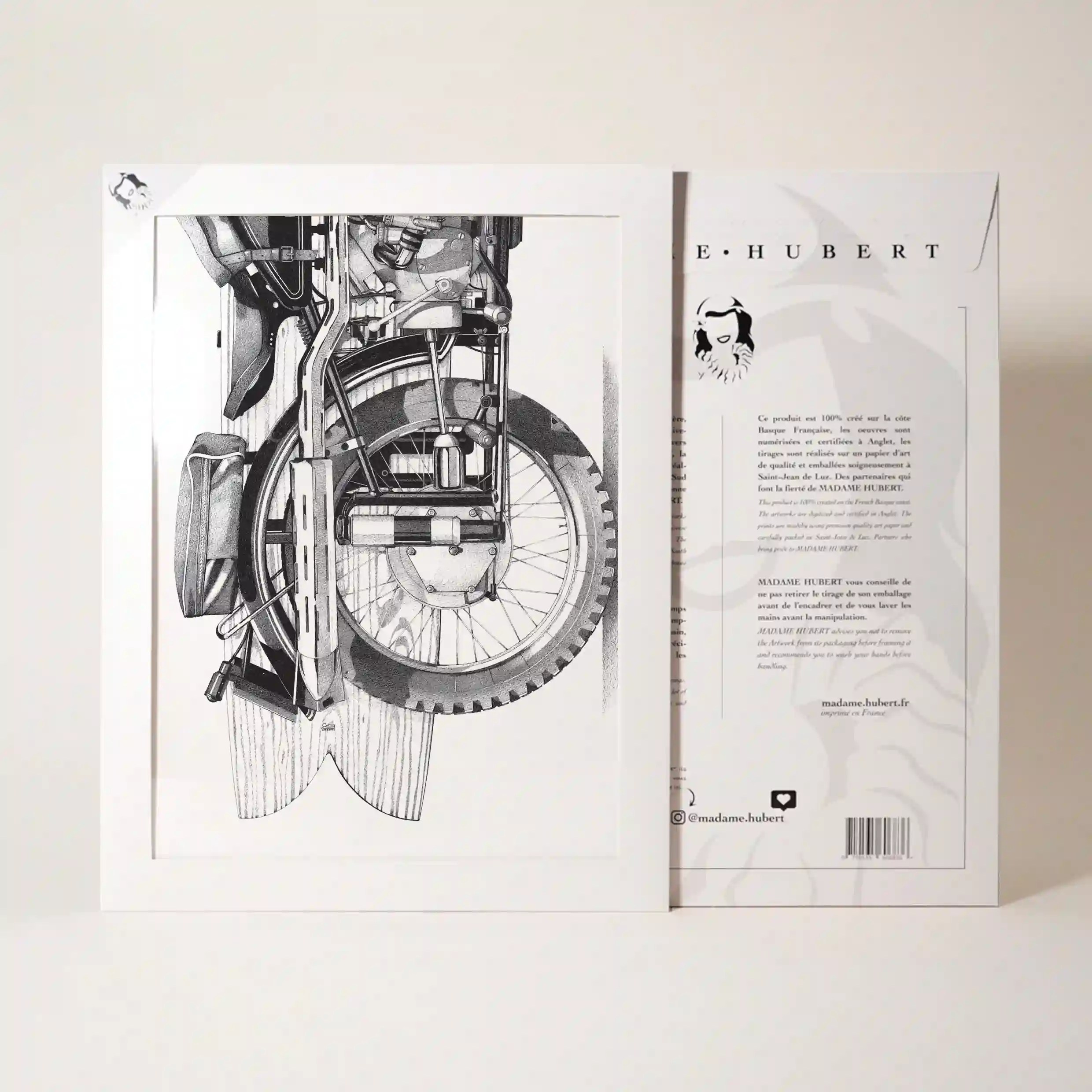 Le choix du noir et blanc donne une dimension intemporelle à cette affiche originale, mettant en valeur chaque détail de l’illustration : la texture du bois, la précision des rayons de la roue et la mécanique complexe du moteur. L’ensemble crée un visuel puissant qui ne manquera pas d’attirer l’attention des amateurs de surf, de moto et d’art graphique.