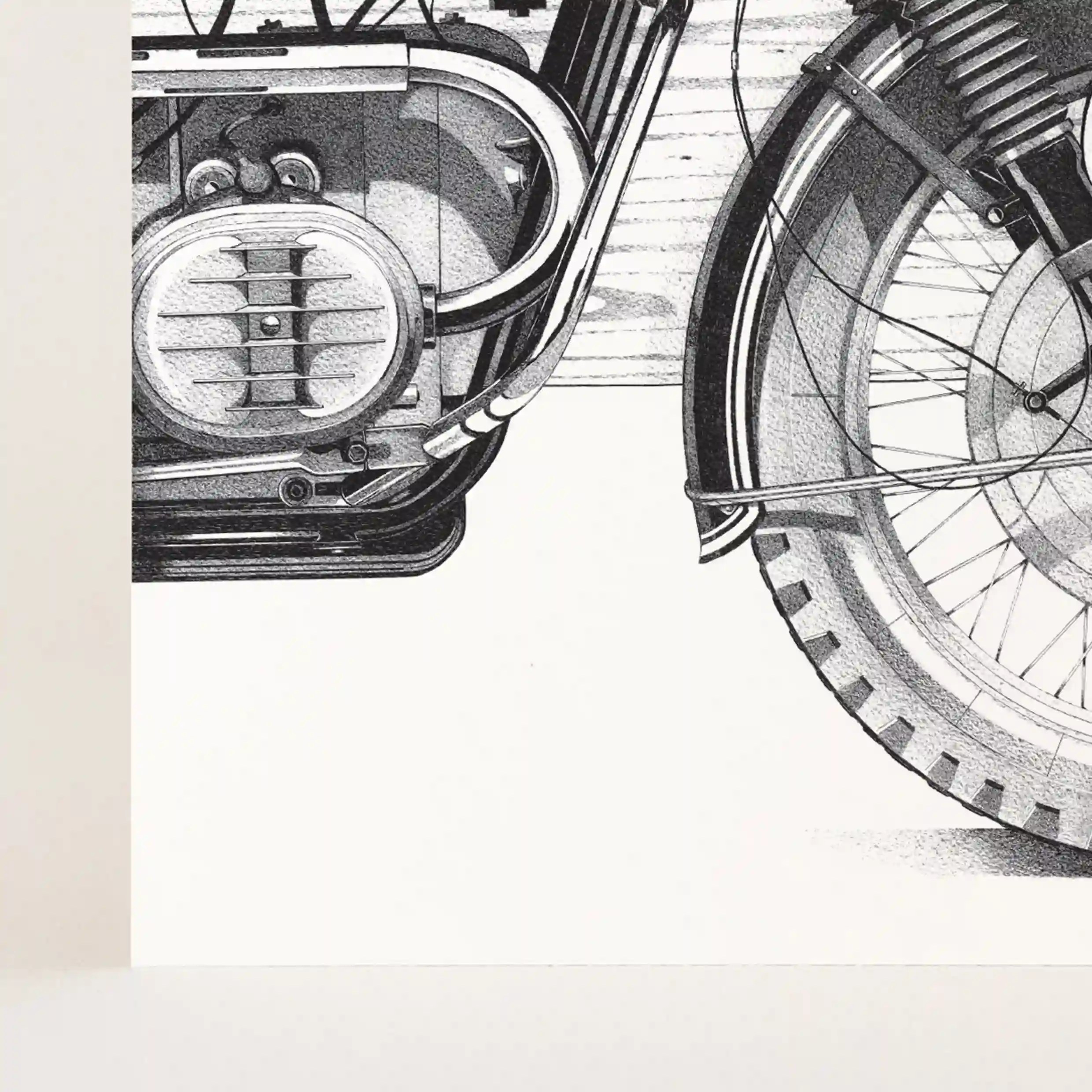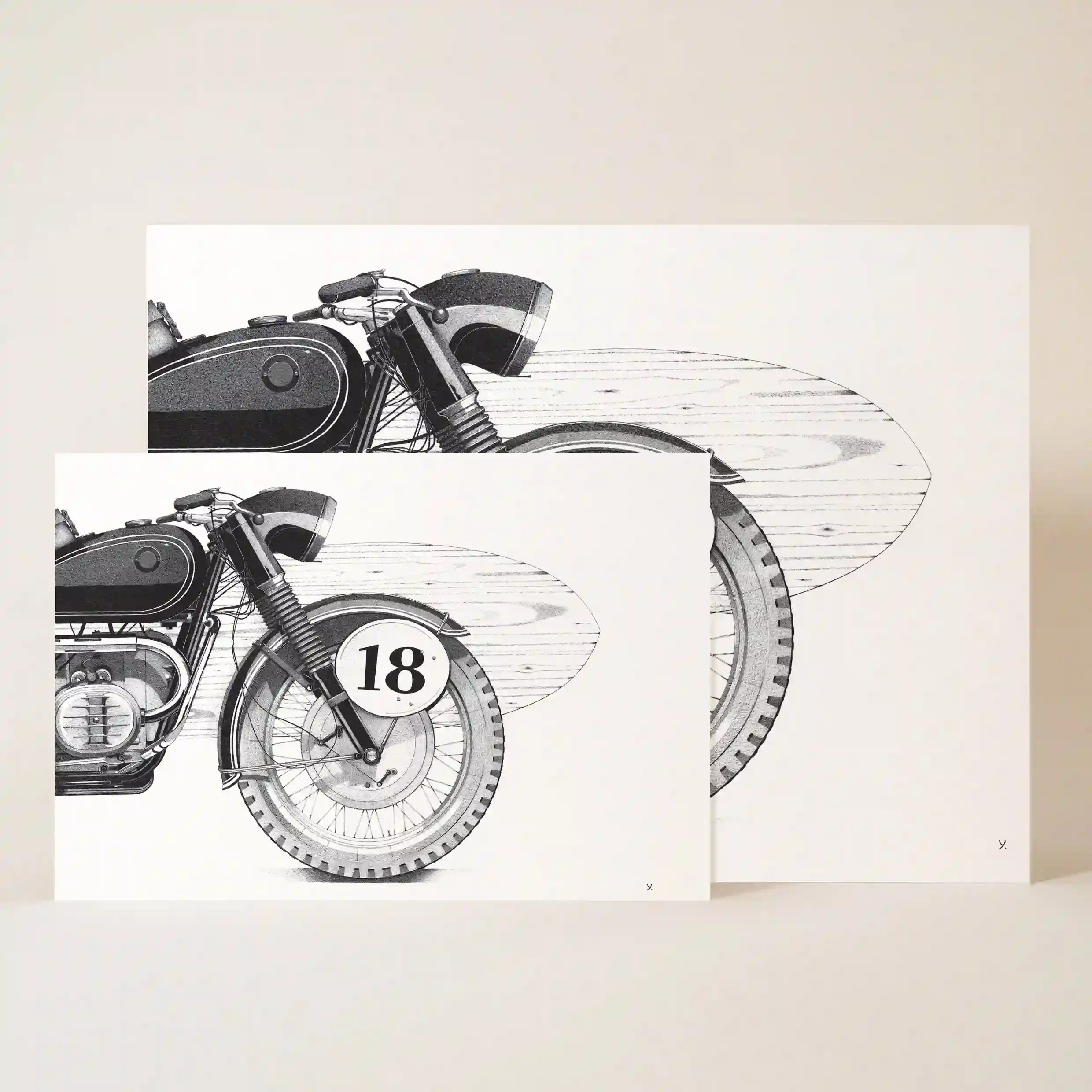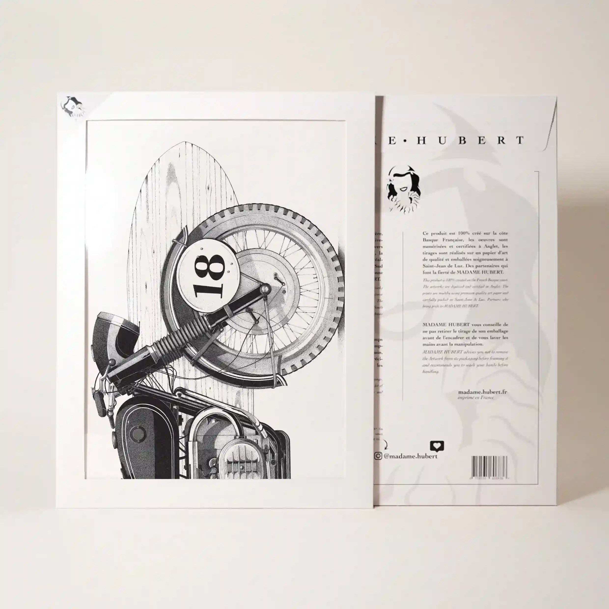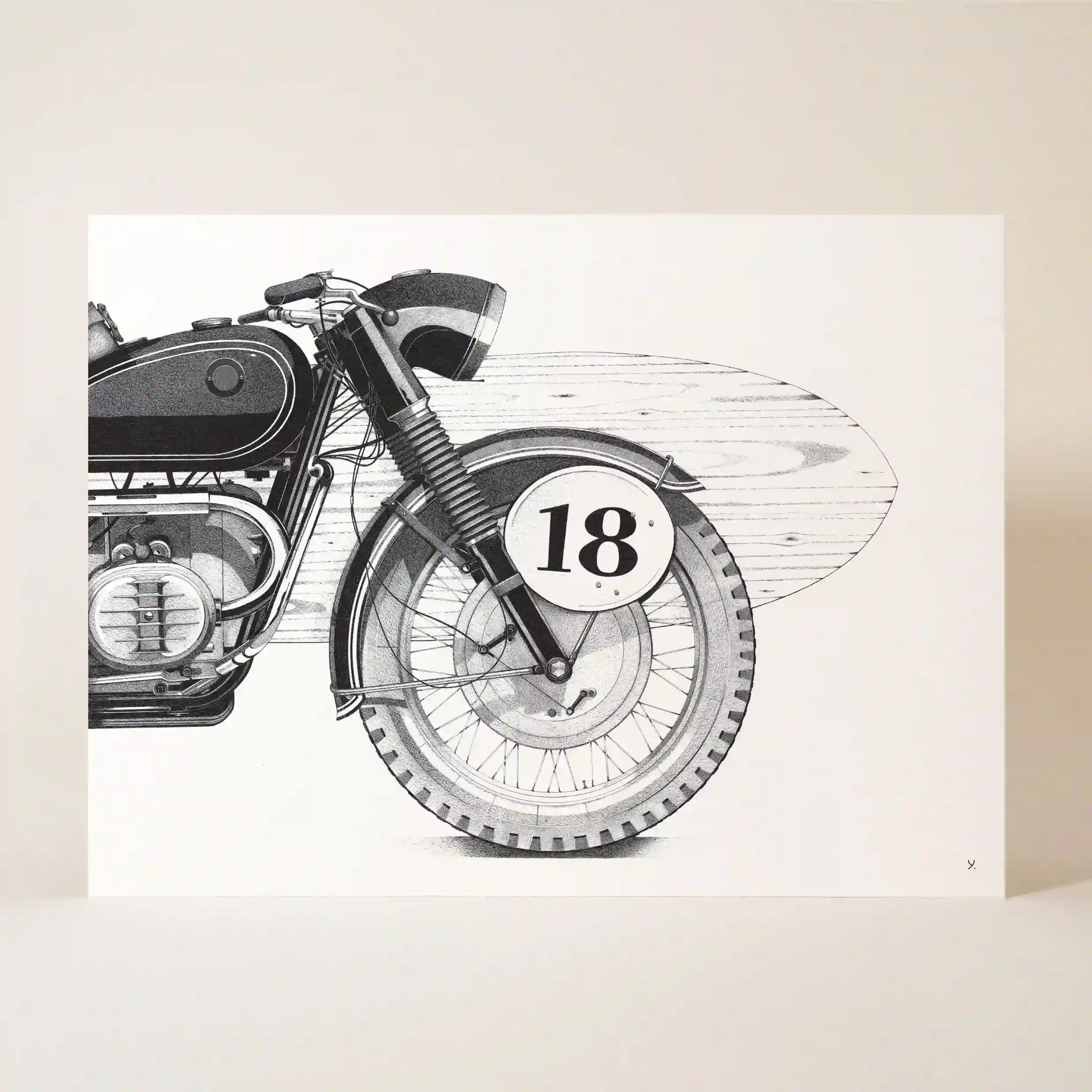 Réalisée avec une technique de pointillisme et de traits précis, cette affiche originale capture chaque détail avec un réalisme saisissant. La roue avant de la moto, ornée du numéro 18, évoque les compétitions et le goût du défi. L’ajout de la planche de surf en arrière-plan rappelle l’appel de l’océan, créant une alliance parfaite entre la vitesse et la glisse. Le contraste subtil entre les éléments mécaniques de la moto et le bois naturel du surf offre une esthétique à la fois brute et raffinée.