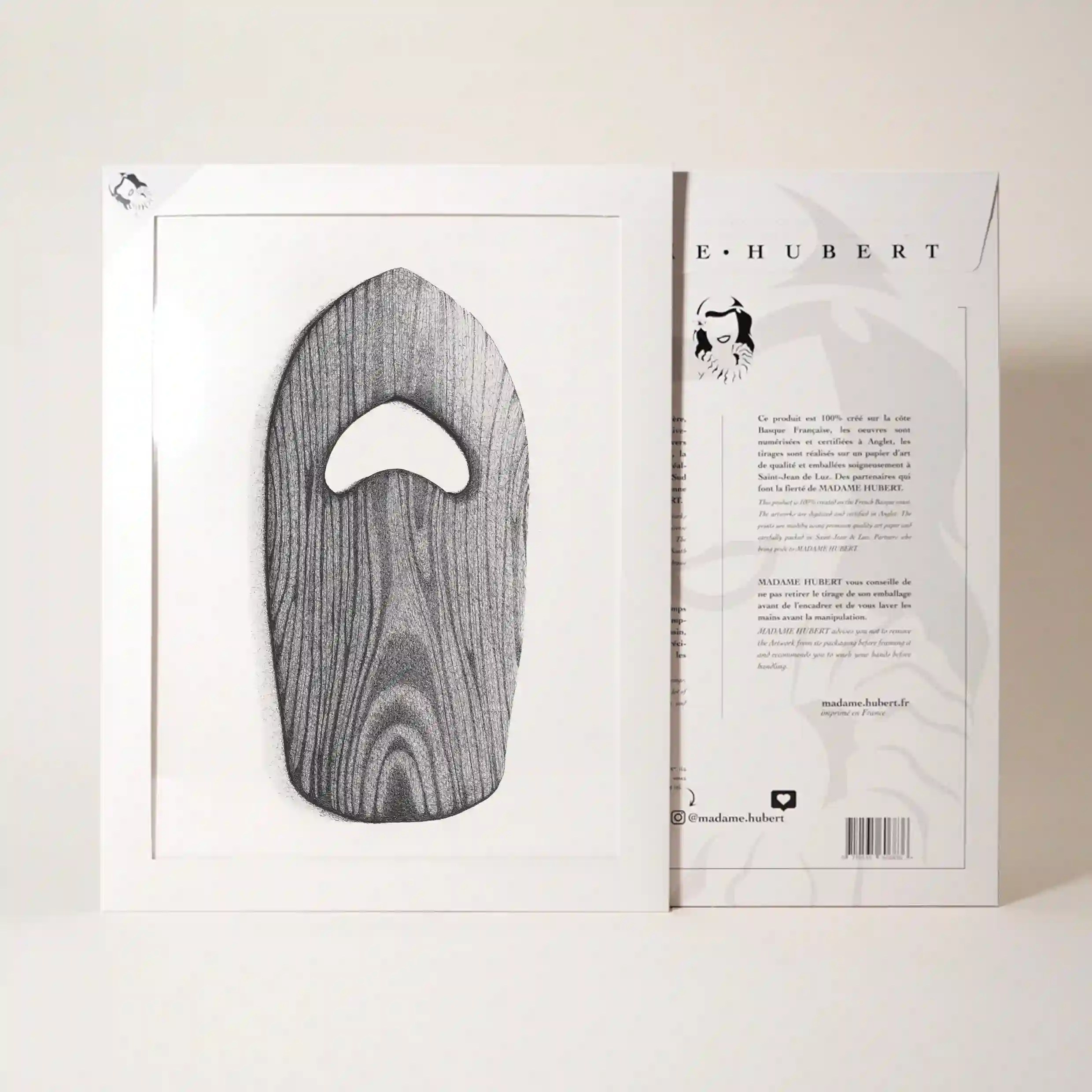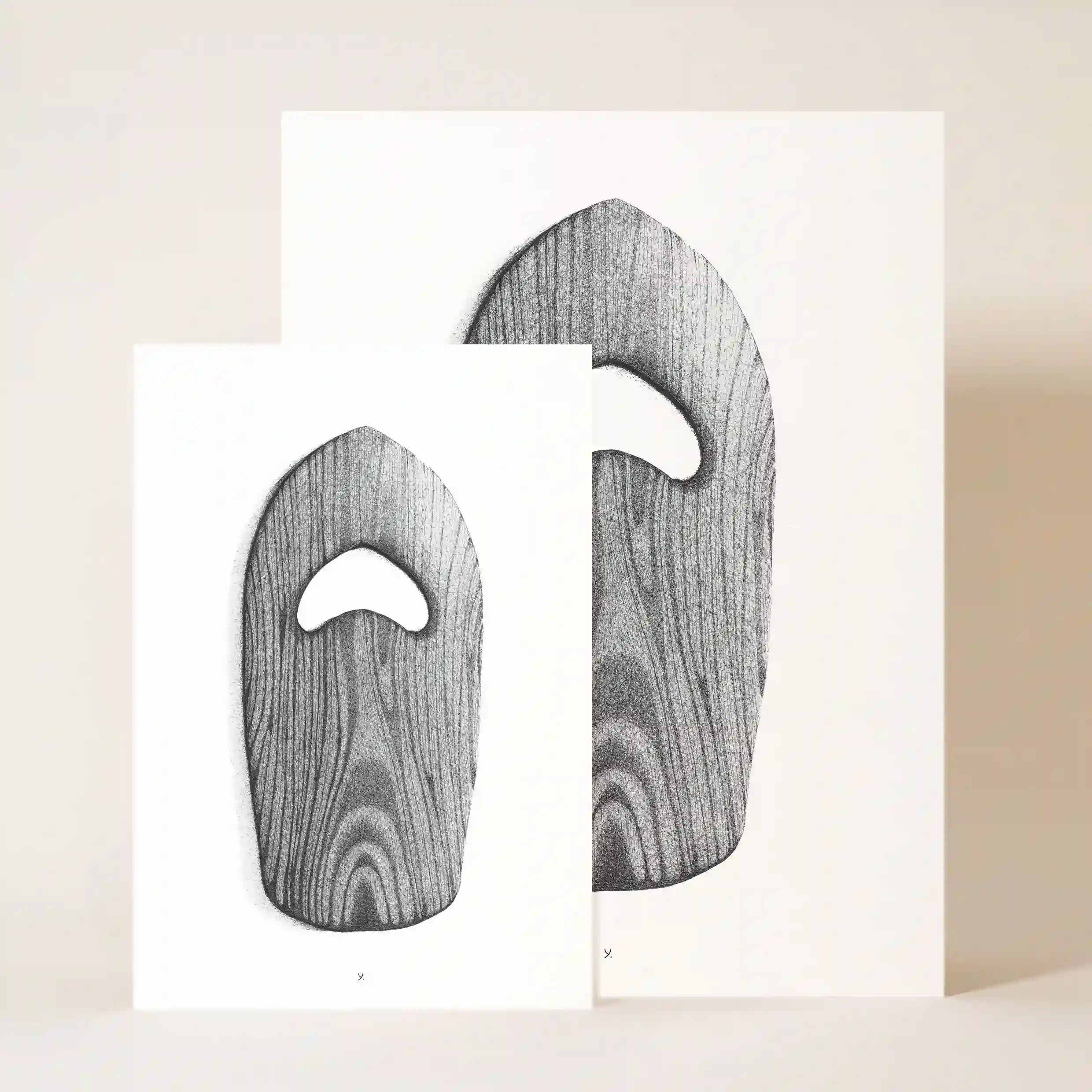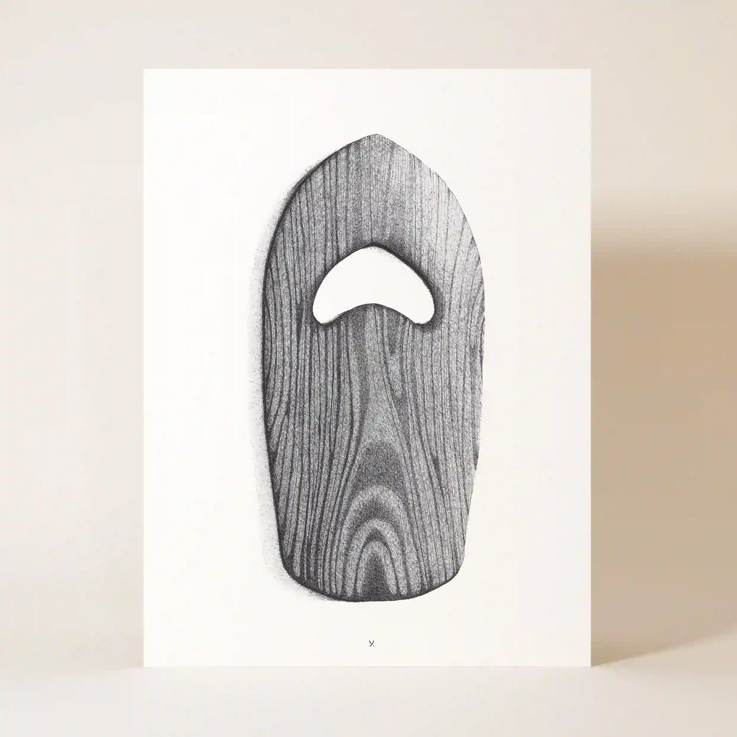 Le dessin met en avant une planche de main en bois sculpté, un outil précieux pour les adeptes du bodysurf. Son design minimaliste et naturel rappelle les premières planches utilisées par les pionniers du surf. Ce choix artistique met en lumière la beauté brute des matériaux et l’authenticité des objets faits à la main.