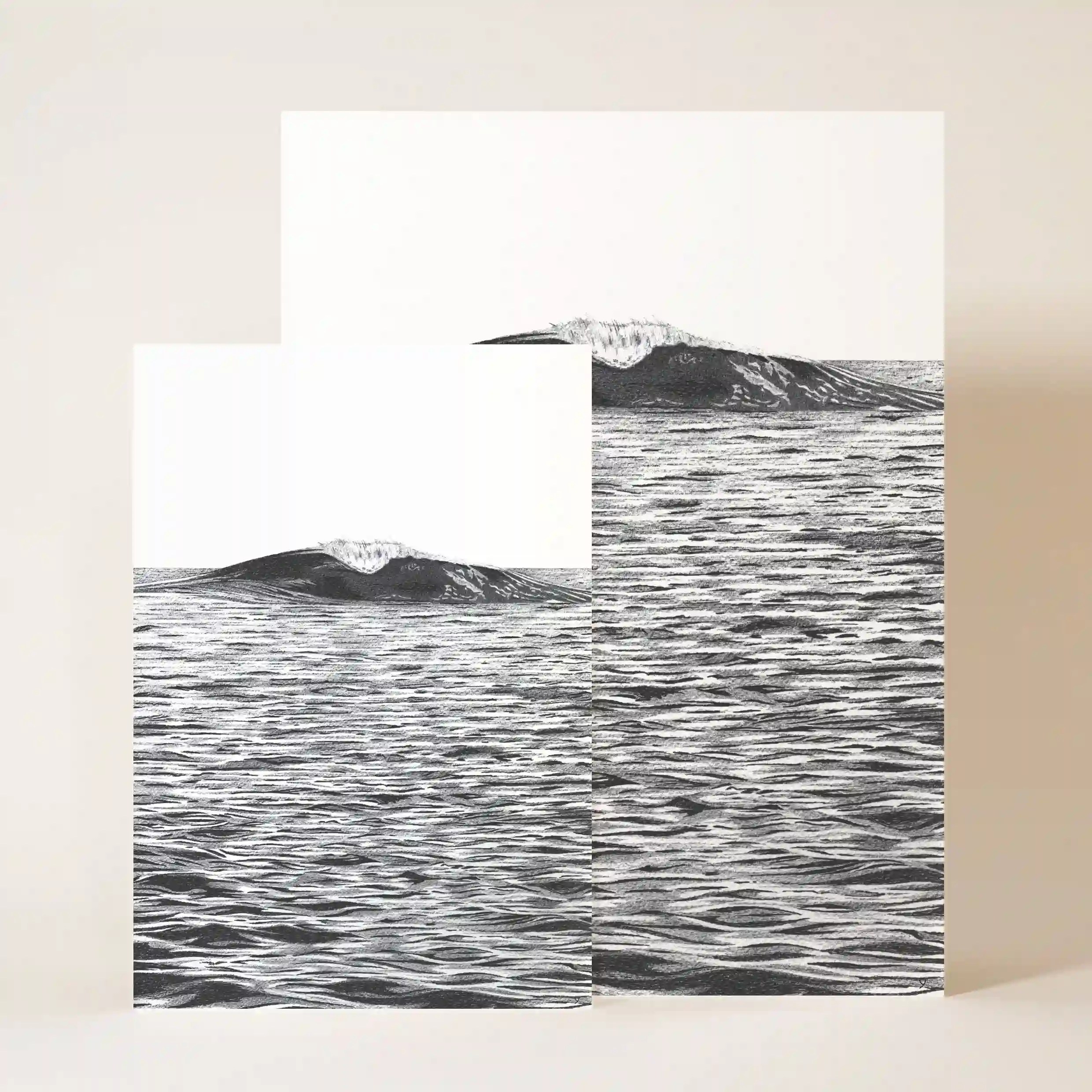 Ce dessin met en avant un élément essentiel du paysage marin : la mer dans toute son immensité. La surface de l’eau est travaillée avec précision, chaque reflet et chaque ondulation contribuant à retranscrire le mouvement naturel de l’océan. À l’horizon, une vague isolée se forme, ajoutant un point focal à cette composition artistique.