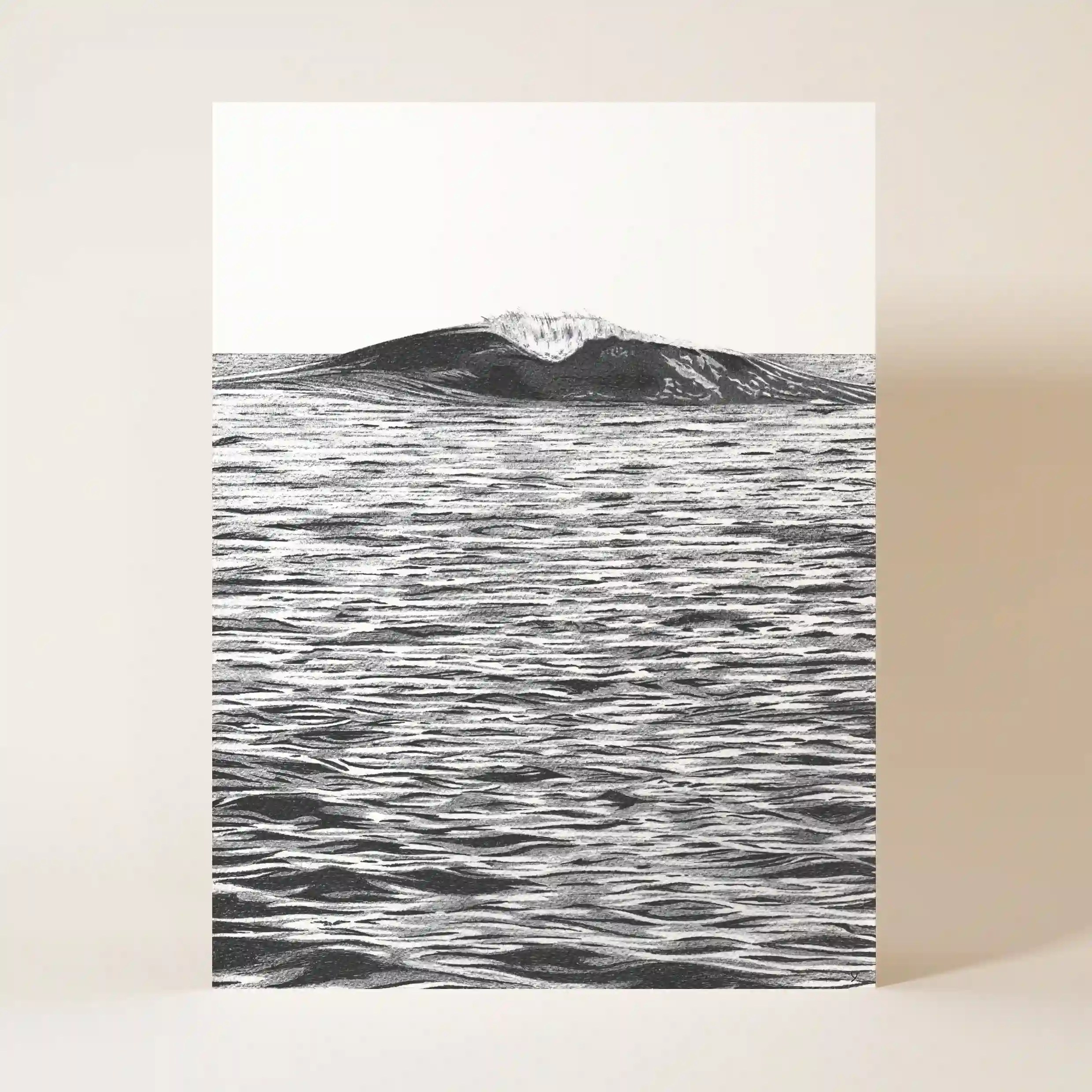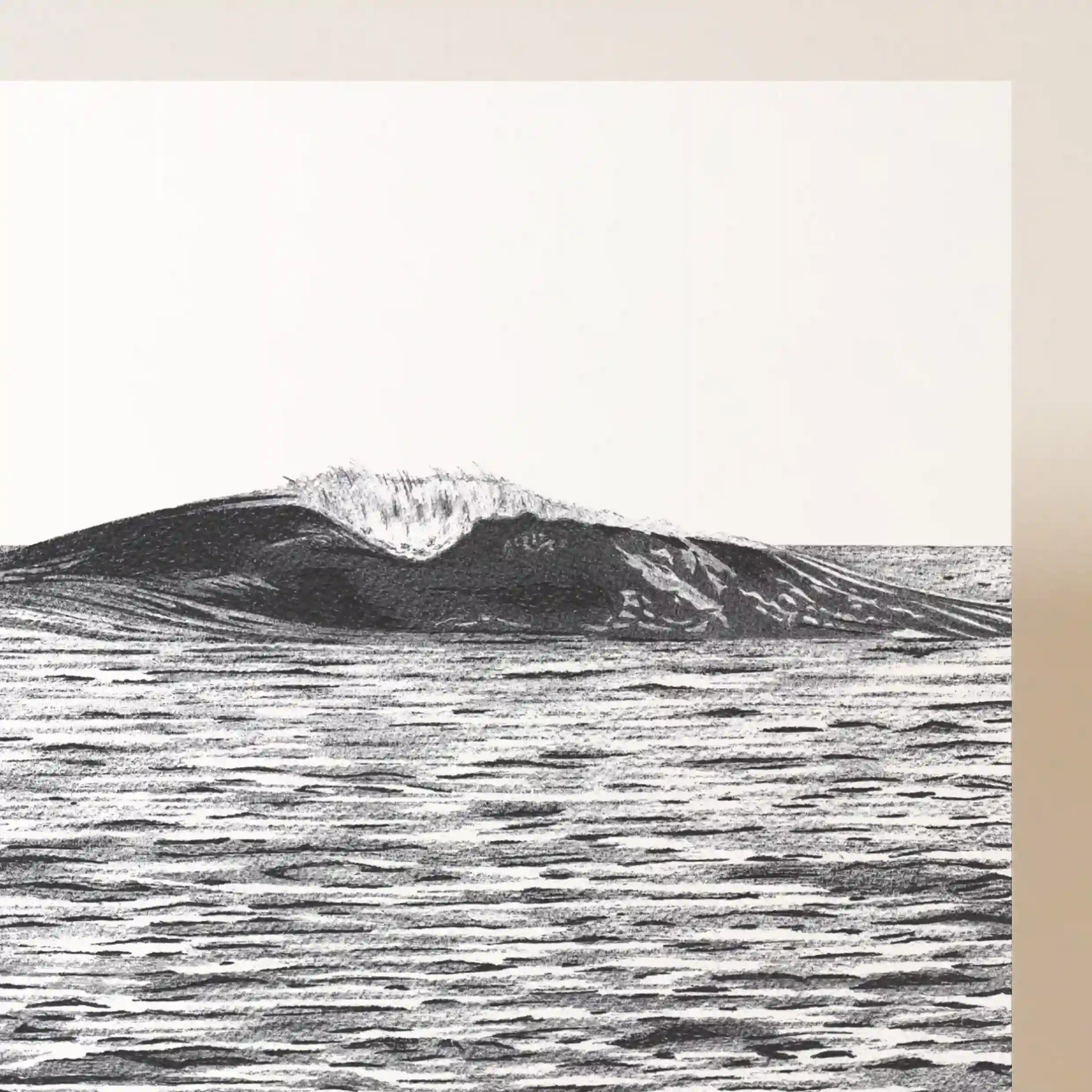 Ce contraste entre l’immensité calme de l’eau et l’énergie de la vague crée une tension visuelle captivante. L’illustration semble presque vivante, comme si elle attendait l’instant où l’écume viendra embrasser la surface de l’eau.