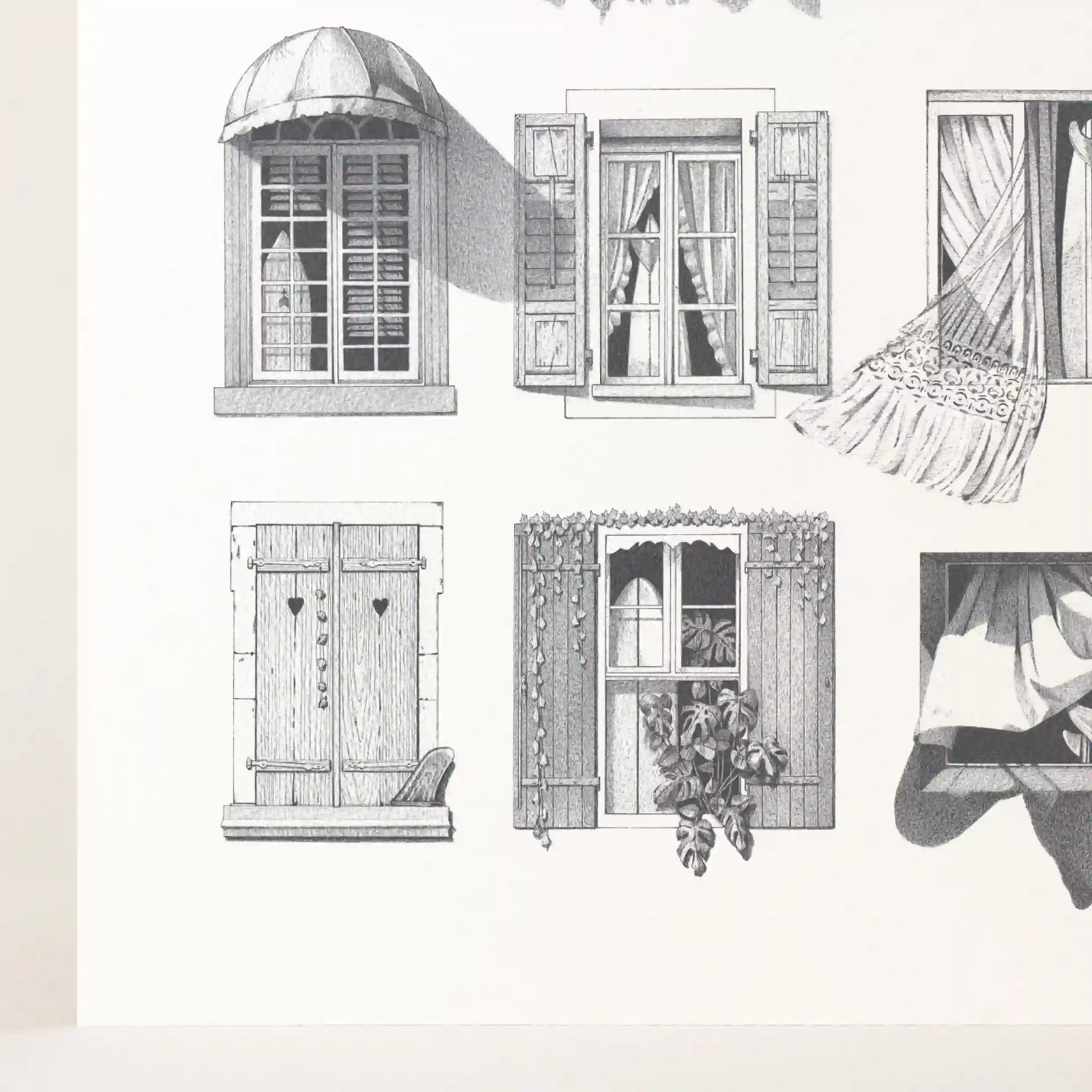 Réalisée dans un style en noir et blanc, cette affiche originale séduit par son jeu de textures et d’ombres délicates. Chaque fenêtre dévoile un élément du quotidien marin : une serviette qui sèche après une session de surf, une planche de bois prête à glisser sur l’eau ou encore un hamac invitant à la détente. Cette illustration joue sur l’imaginaire et offre un contraste harmonieux entre l’architecture et la nature. L’équilibre entre détails réalistes et touches minimalistes donne à cette œuvre une élégance intemporelle.