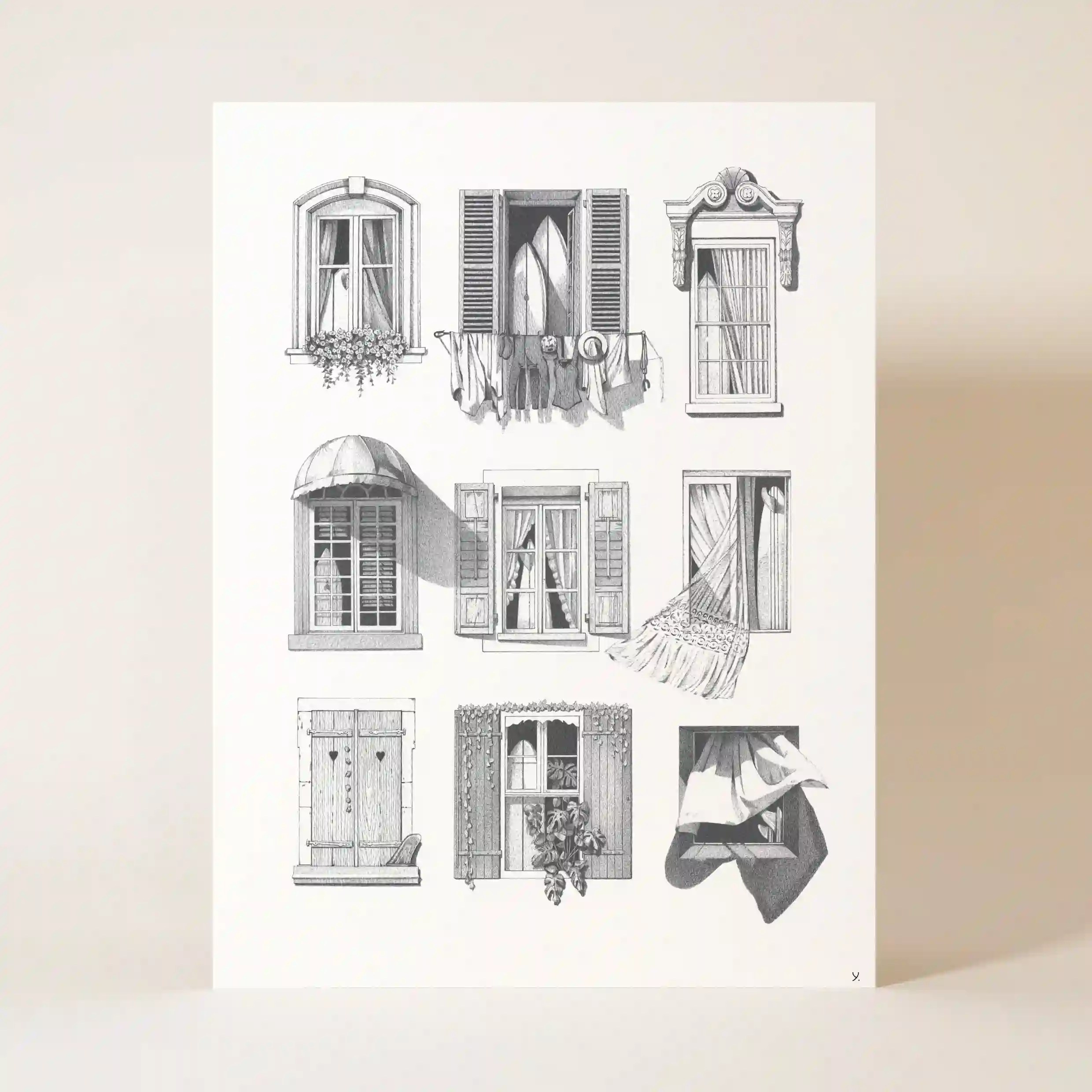 Cette affiche mer unique invite à l’évasion avec une composition fascinante de différentes fenêtres, chacune racontant une histoire. Entre volets ouverts sur des planches de surf prêtes à affronter les vagues, rideaux flottants au vent marin et volets rustiques baignés de soleil, ce dessin est un véritable hymne aux paysages côtiers. L’artiste capture avec finesse l’ambiance des maisons de bord de mer, où le temps semble suspendu et où chaque fenêtre offre une vue imprenable sur l’horizon.