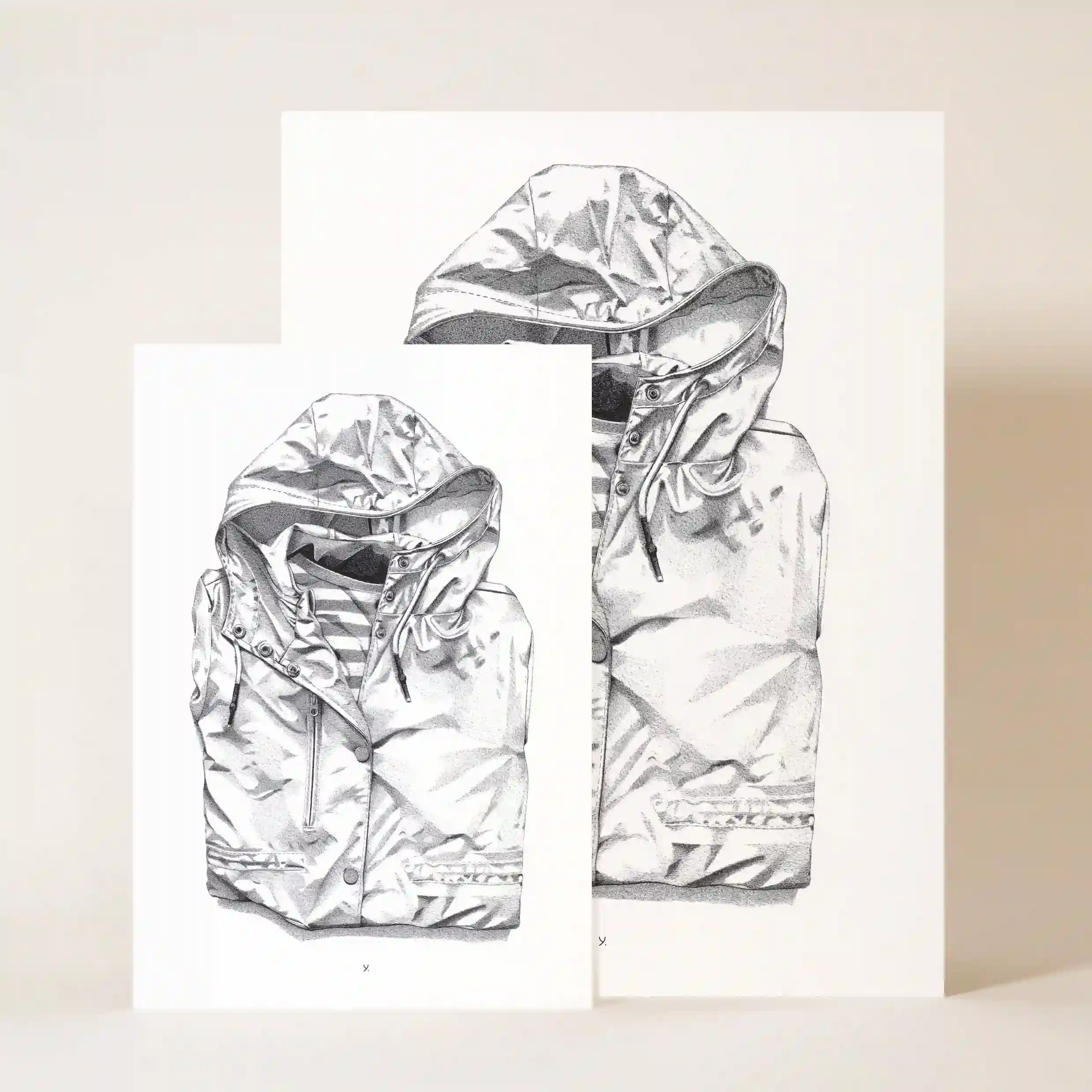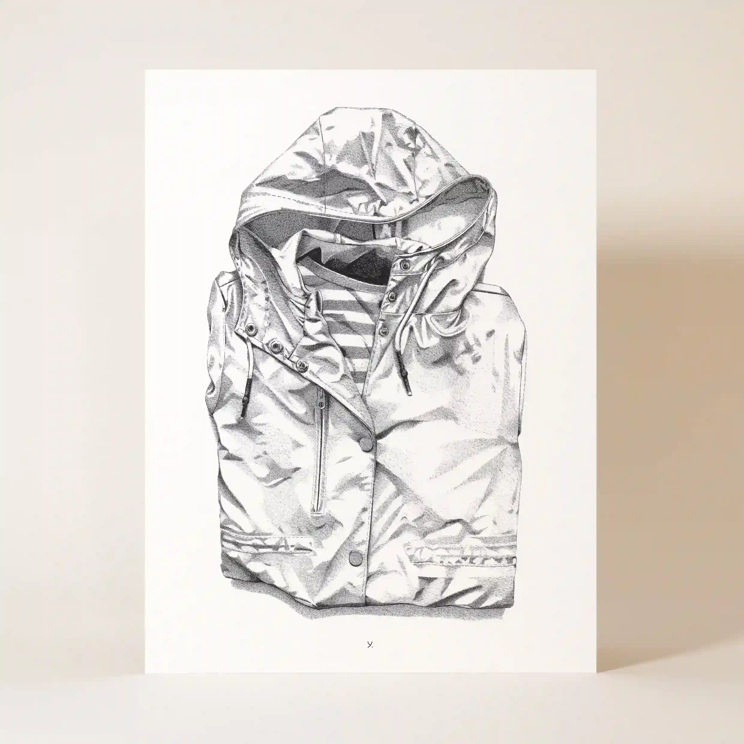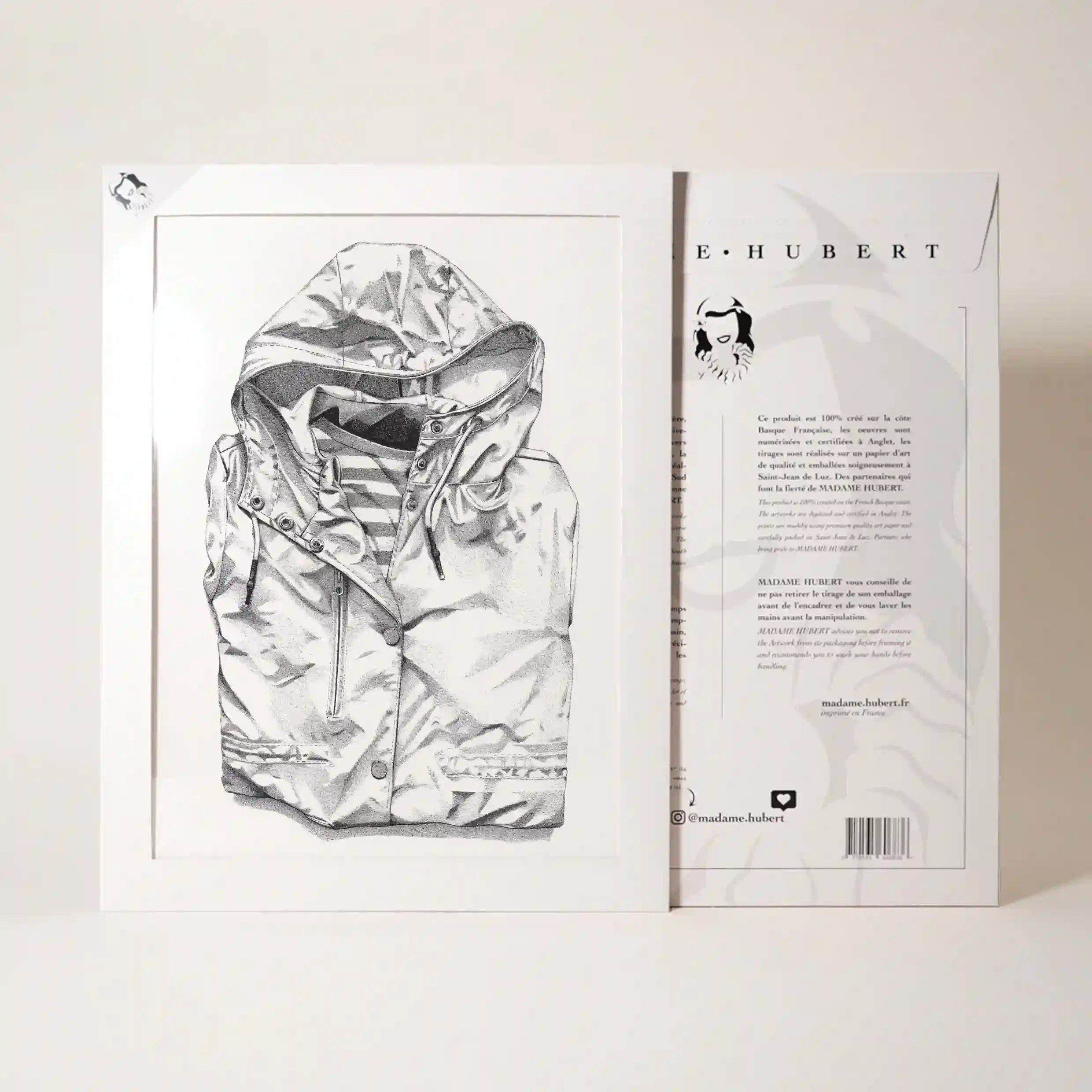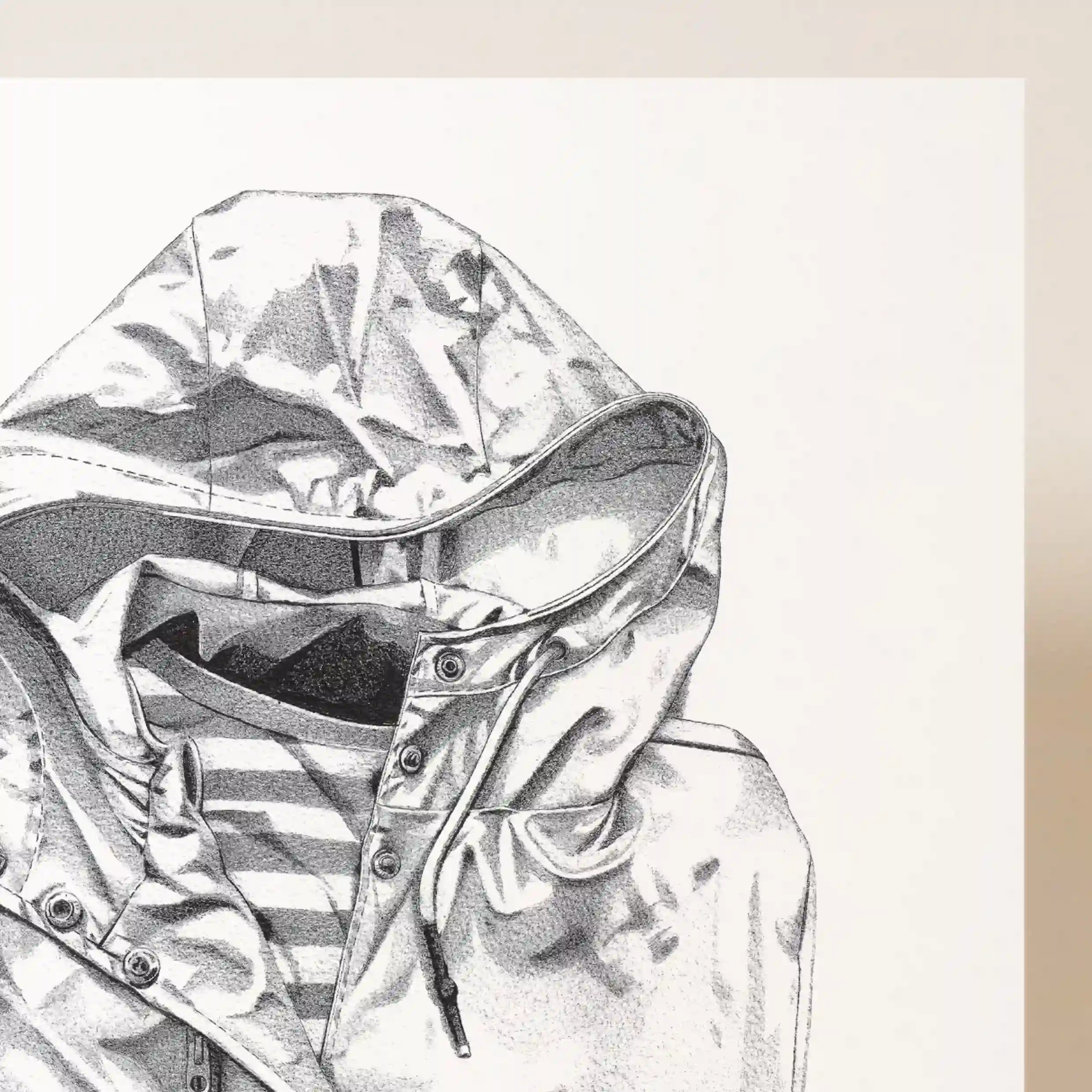 Réalisée avec une précision graphique remarquable, cette illustration en noir et blanc joue sur les contrastes pour faire ressortir chaque pli du tissu, la brillance de la matière imperméable et la douceur du coton rayé de la marinière. Chaque détail est capté avec minutie, donnant une impression de texture et de réalisme saisissante. L’ensemble de l’image inspire une sensation de confort, de protection et de nostalgie, rappelant les journées passées en bord de mer, les balades sur les quais ou encore les averses typiques du littoral.