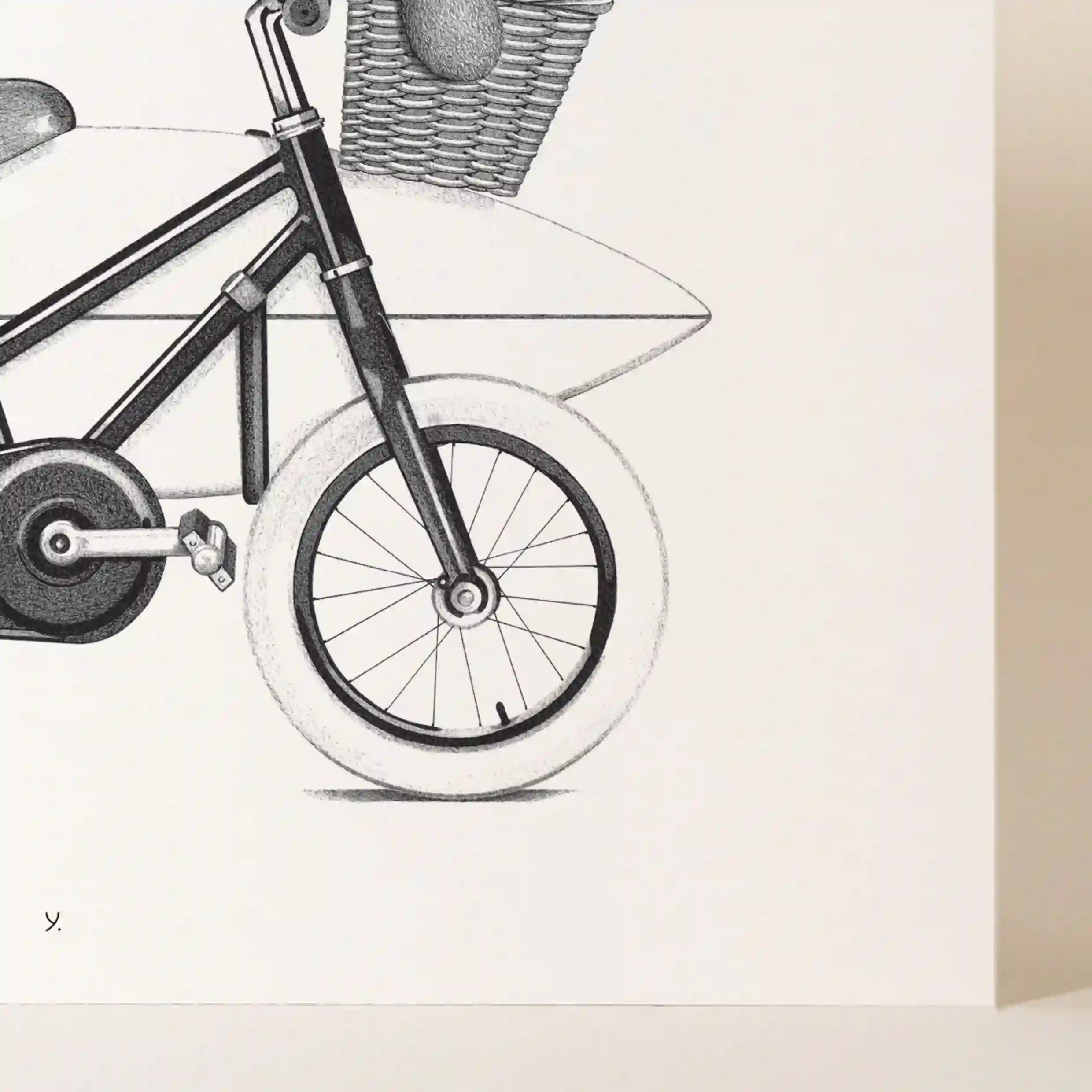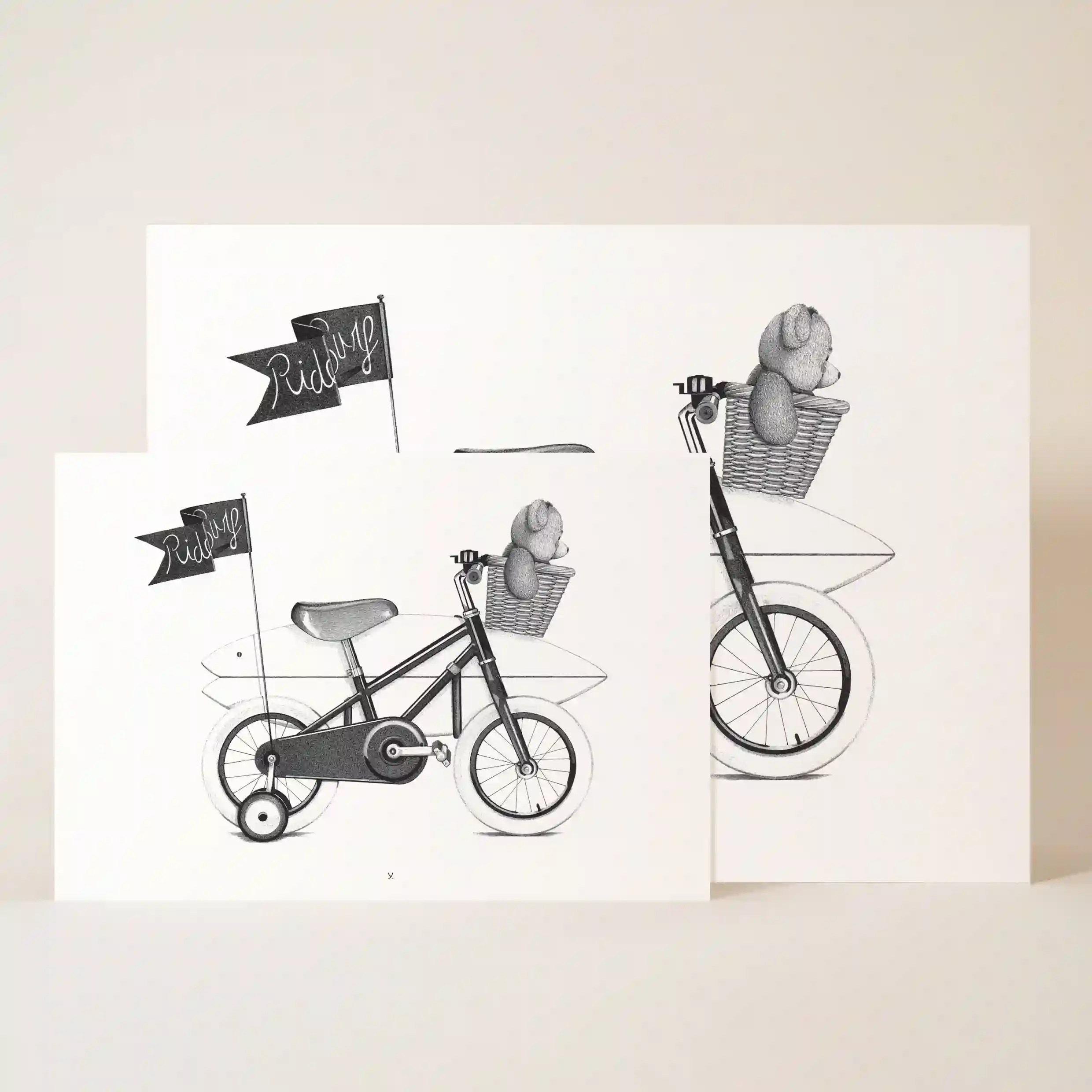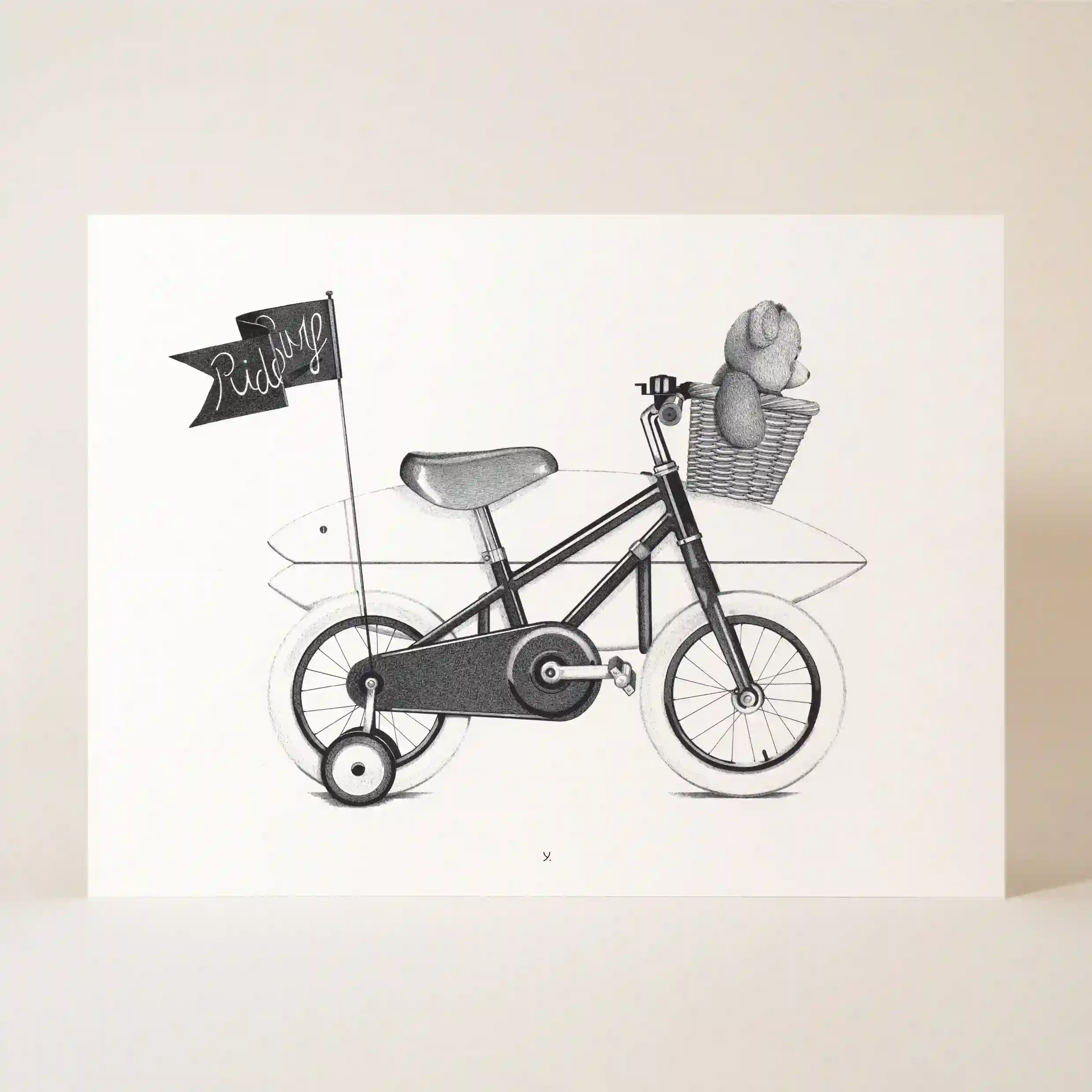 Ce dessin en noir et blanc est une ode aux souvenirs d’enfance. Il évoque ces premières balades à vélo, l’excitation d’explorer de nouveaux horizons, et la simplicité du bonheur enfantin. L’ours en peluche, fidèle compagnon d’innombrables aventures, rappelle le lien fort entre l’enfant et son imaginaire.