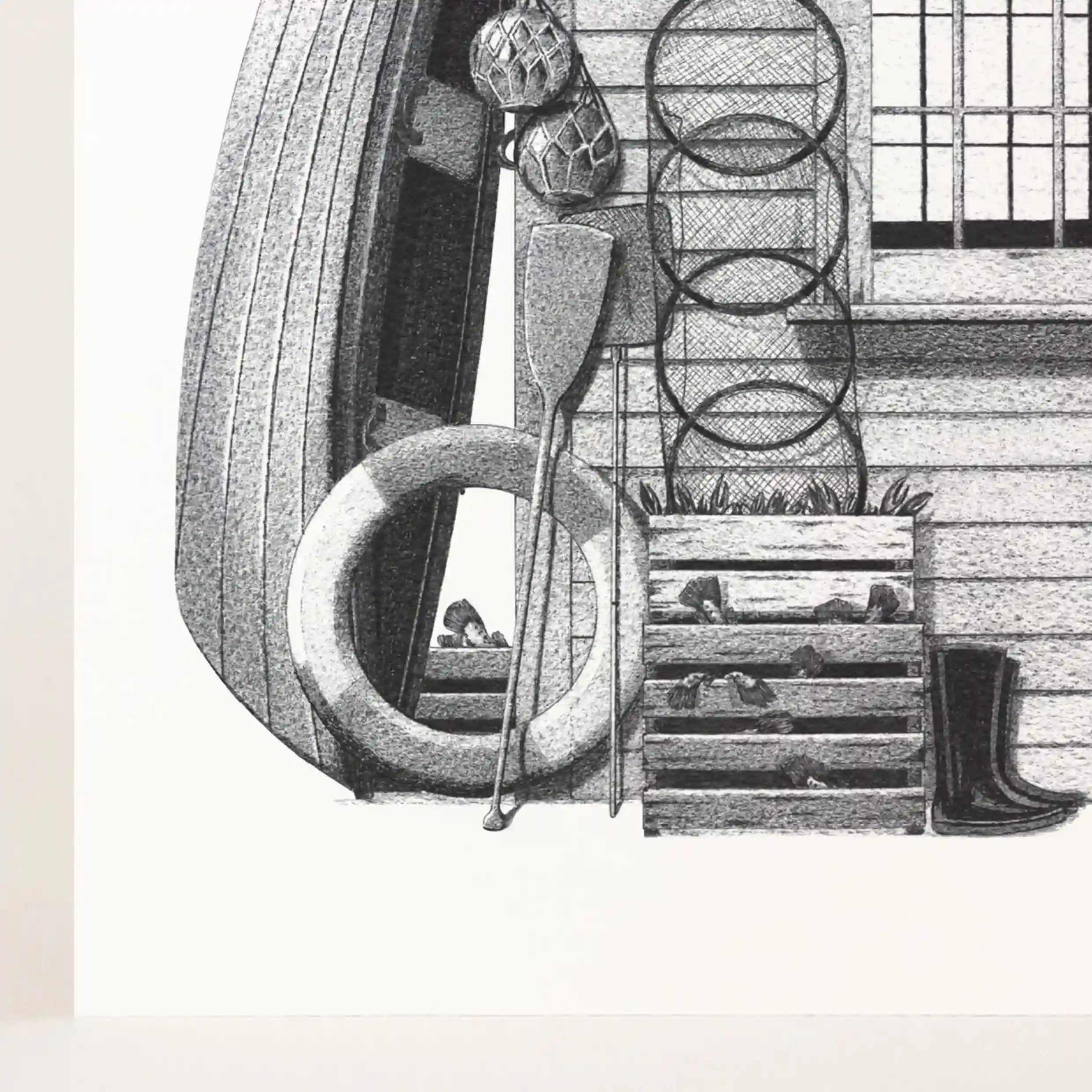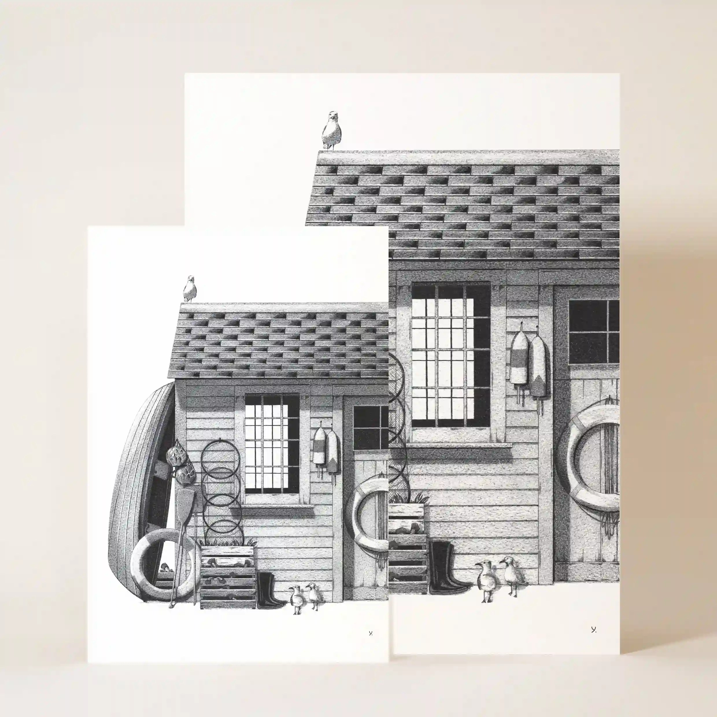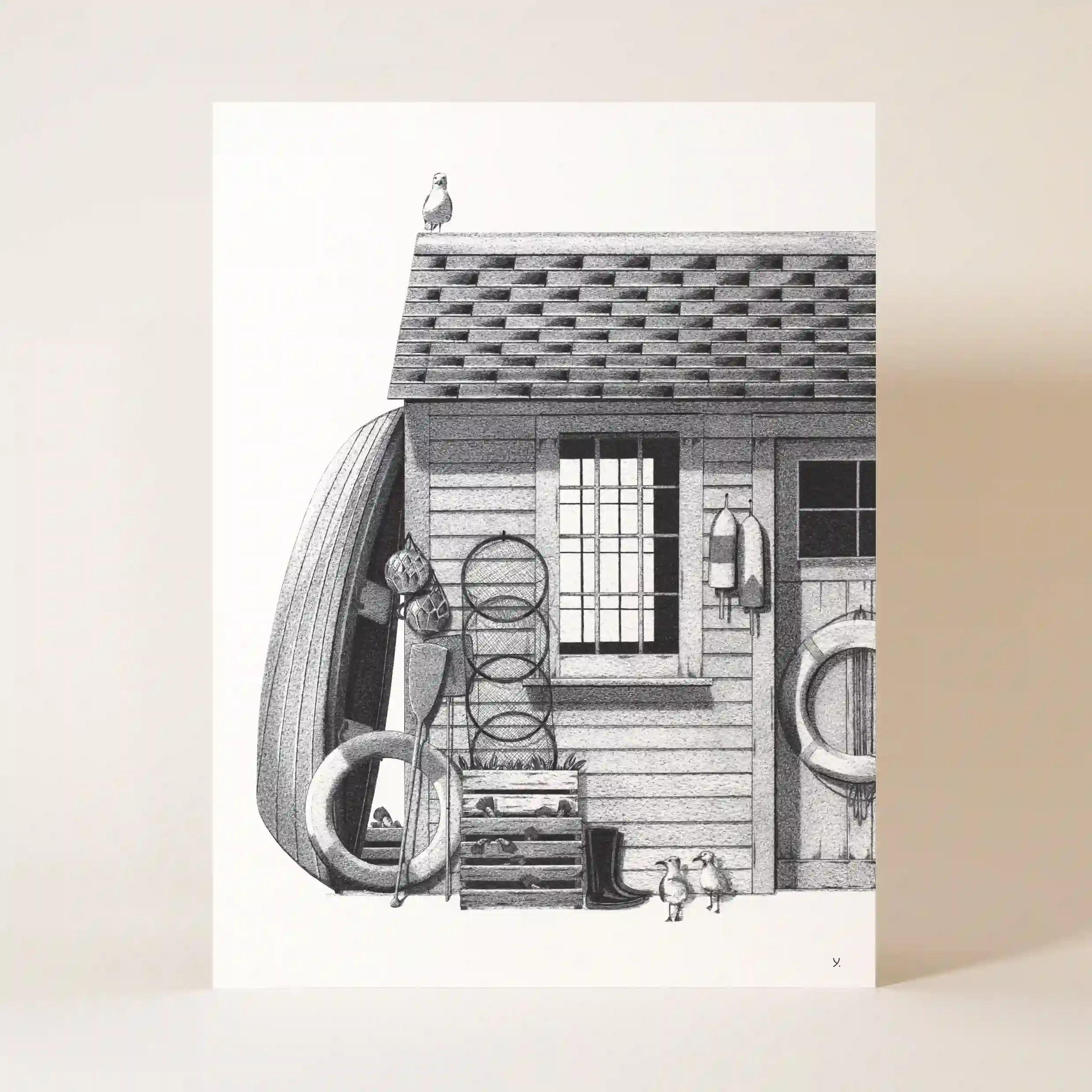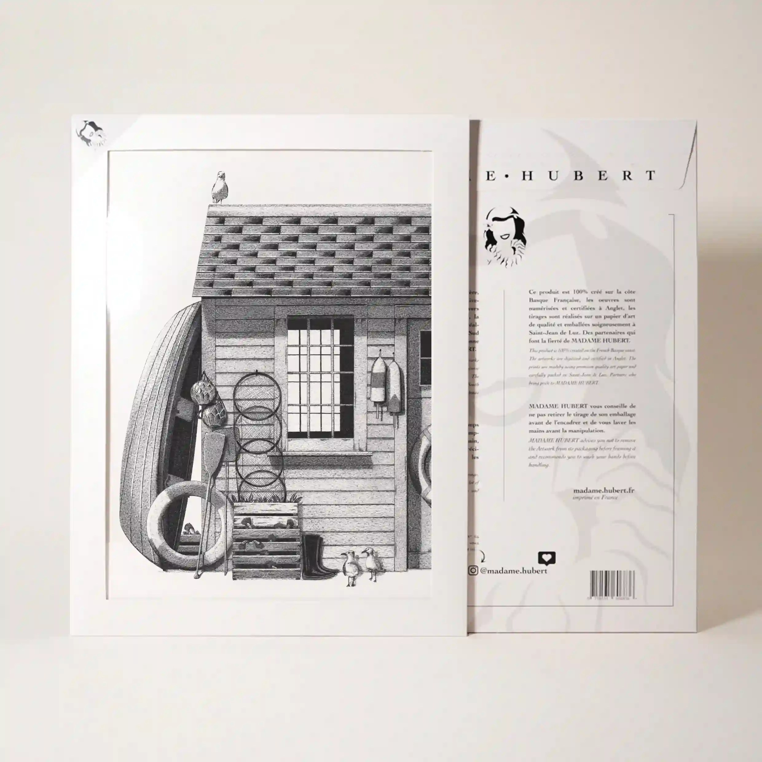 Cette affiche originale illustre avec une précision remarquable une cabane en bois, typique des côtes bretonnes et normandes. Ses planches patinées par le temps, ses équipements marins et ses accessoires de pêche racontent l’histoire de ceux qui vivent au rythme des marées. On y retrouve une barque retournée appuyée contre la façade, des filets de pêche soigneusement suspendus, une bouée de sauvetage et quelques mouettes perchées, apportant une touche de réalisme saisissante. Chaque élément du dessin est travaillé avec finesse, offrant un rendu presque photographique qui attire le regard et invite à l’évasion.