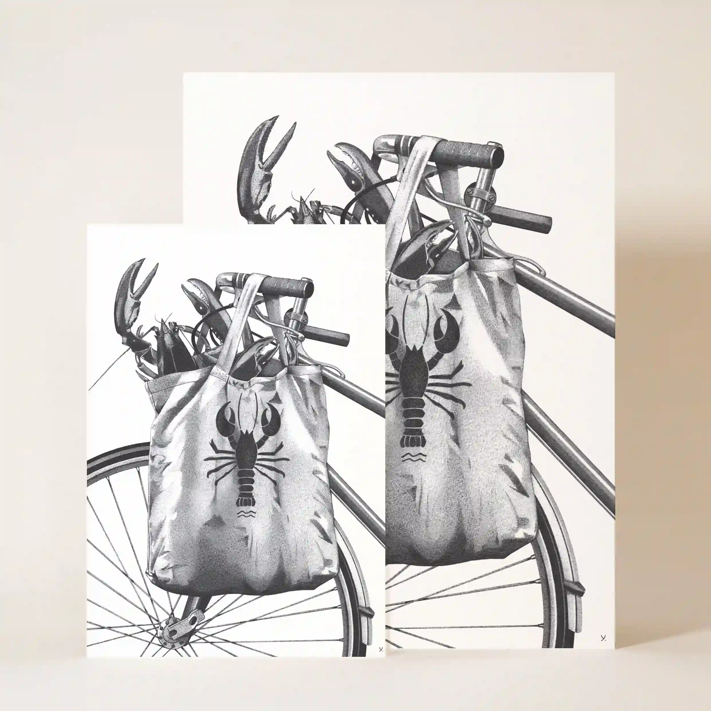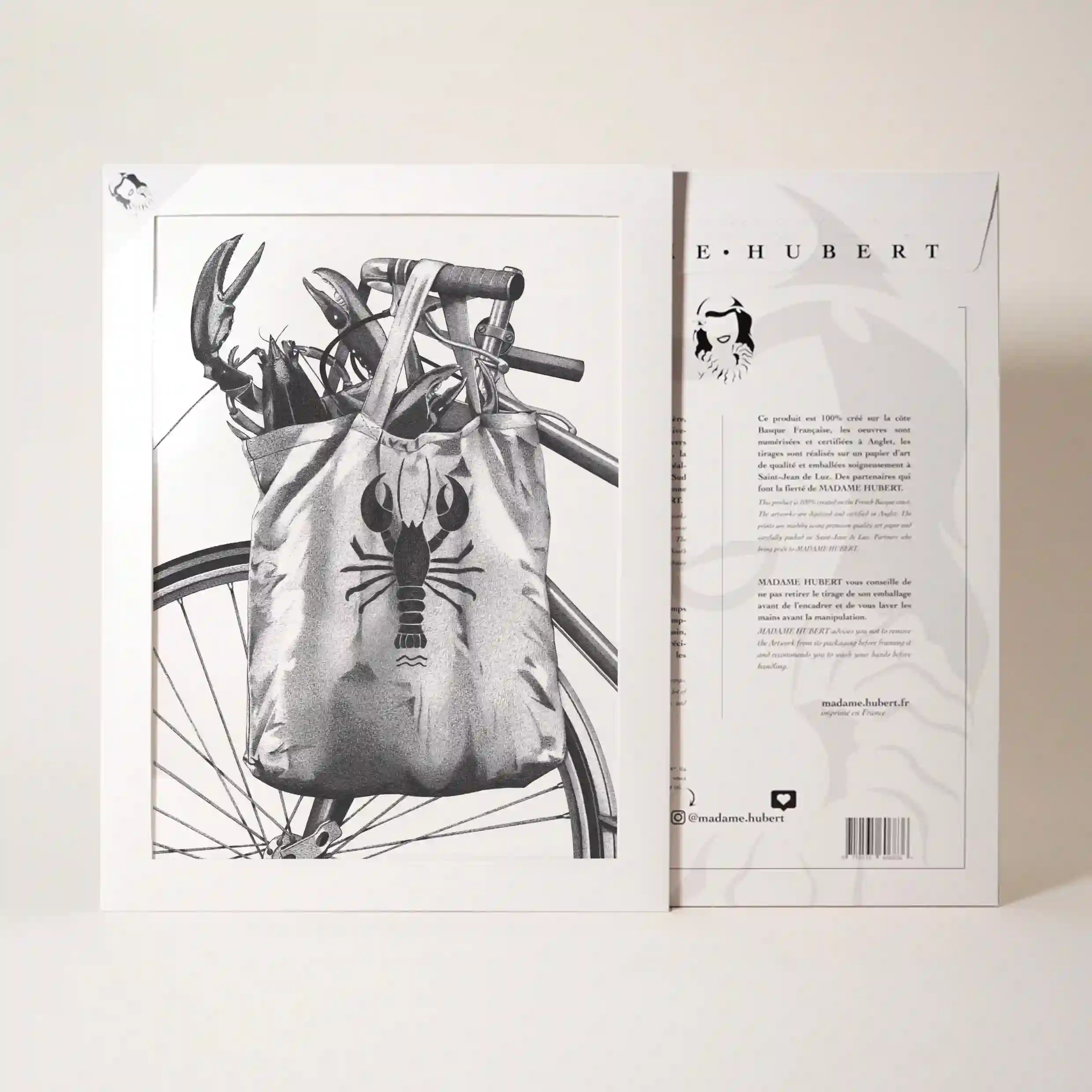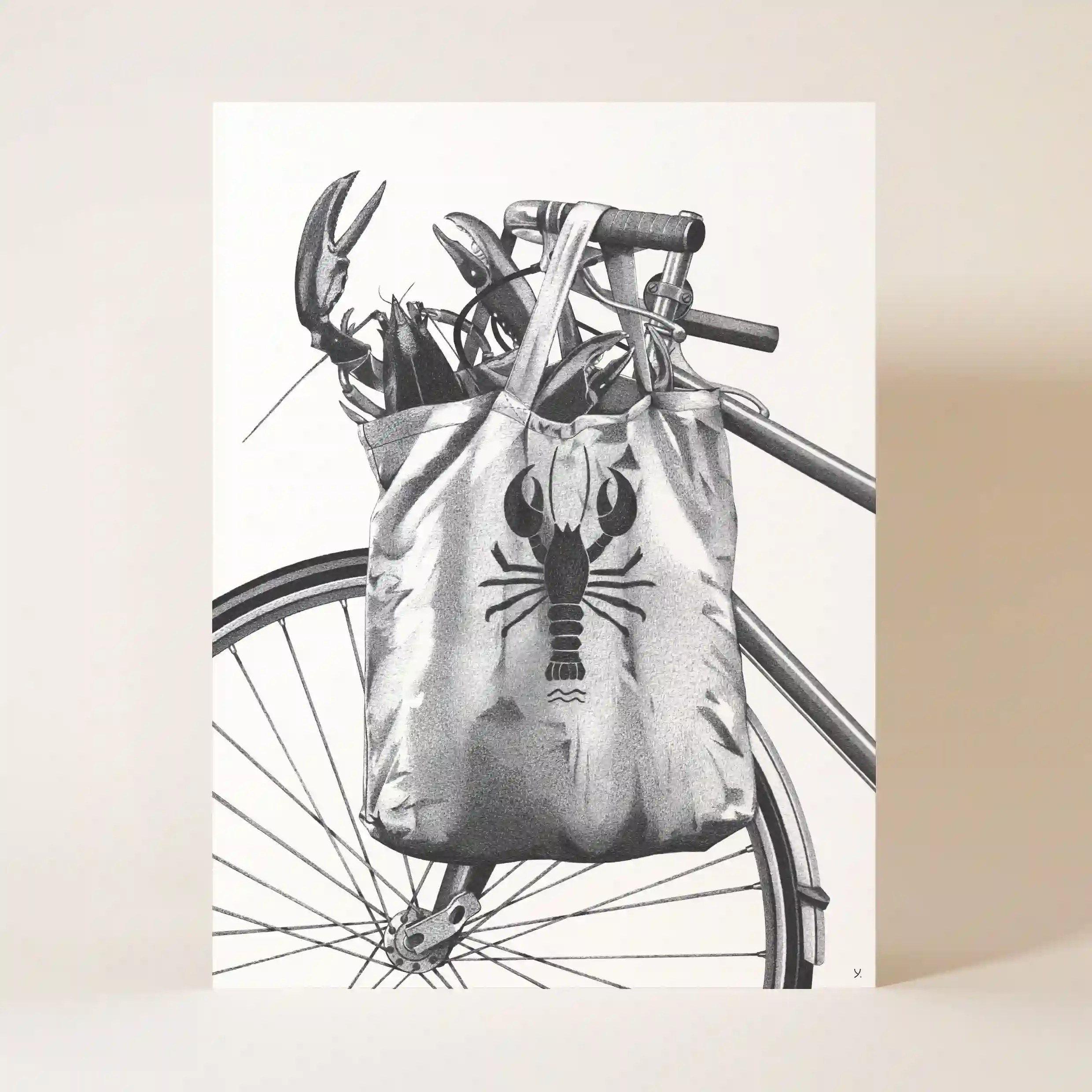 Le réalisme du dessin en noir et blanc confère à cette affiche originale une élégance intemporelle. Chaque détail est minutieusement travaillé : le tissu du sac légèrement froissé, l’emblématique illustration du homard imprimée dessus, la texture des langoustines et leur agencement chaotique qui trahit une pêche généreuse et spontanée. La roue du vélo, partiellement visible, évoque le mouvement et l’aventure, renforçant l’impression de liberté que dégage cette scène.