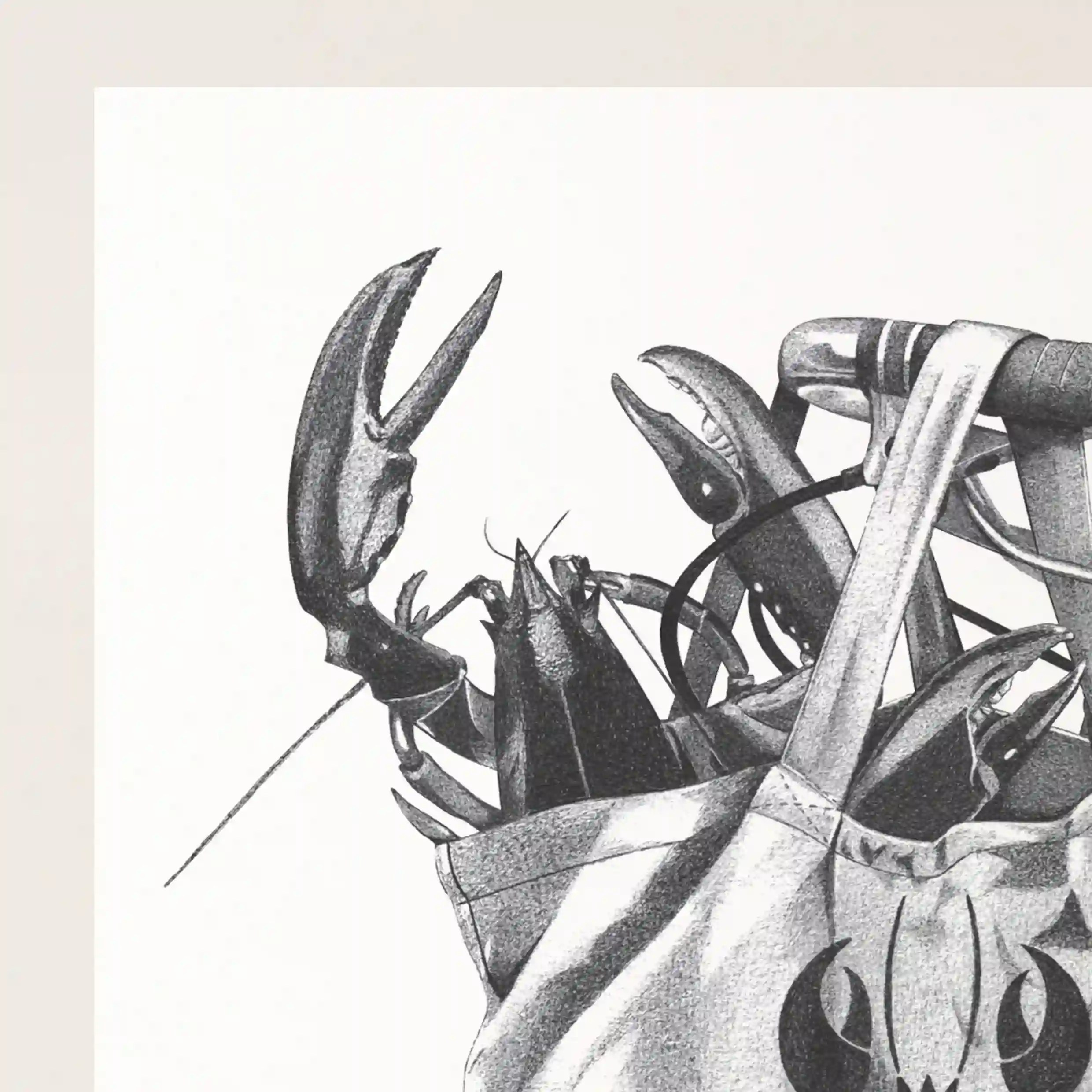 Cette affiche originale séduit par son trait précis et son jeu subtil de contrastes. Son design monochrome met en valeur les textures et les ombres, créant une profondeur captivante. Chaque élément – des pinces des langoustines au métal du guidon – est retranscrit avec un souci du détail impressionnant.