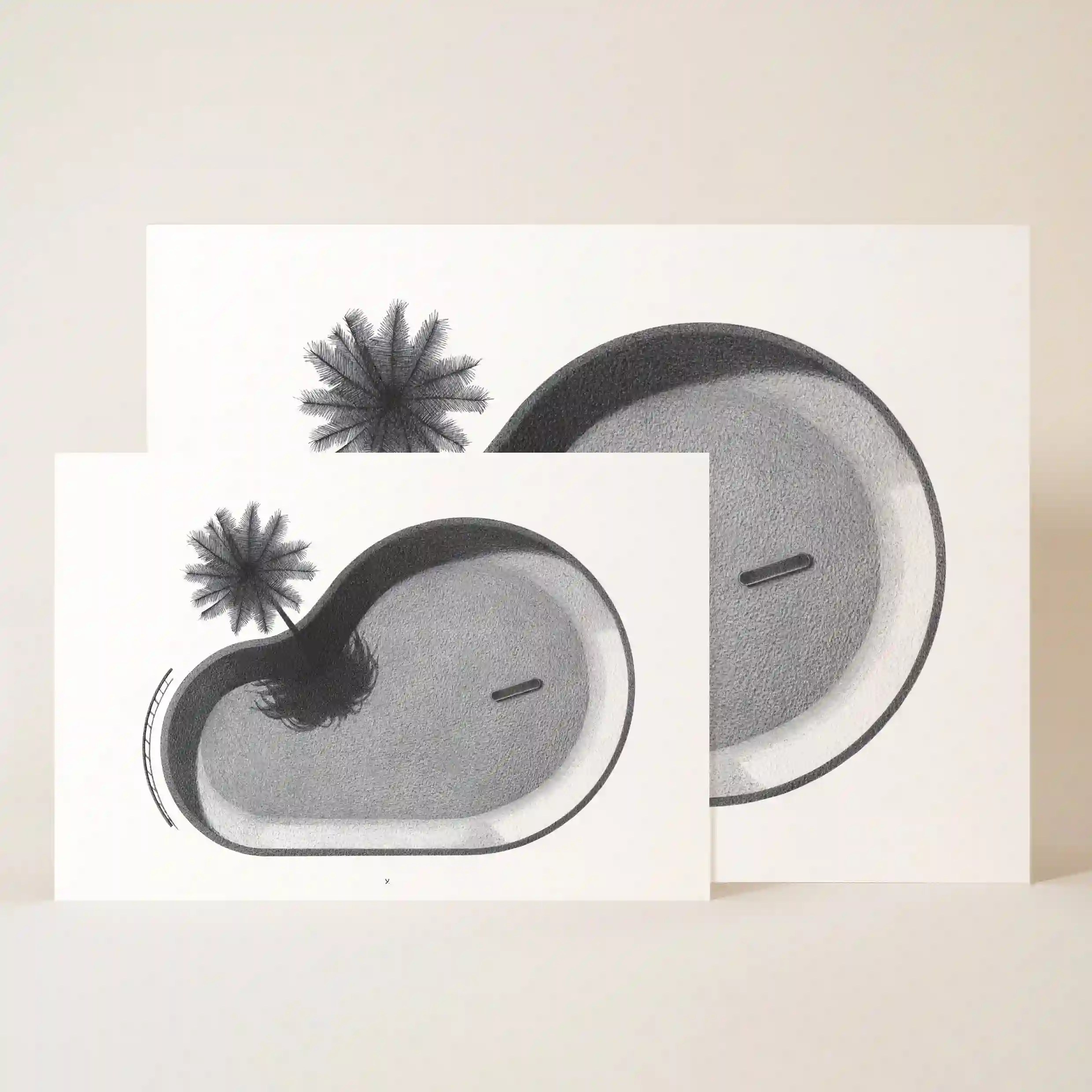 L’illustration capture avec précision l’essence du skate : une planche solitaire repose au fond de la piscine, évoquant l’attente d’un rider prêt à défier la gravité et à enchaîner les figures. L’ombre du palmier vient épouser les courbes du bowl, accentuant le contraste entre la nature et l’urbanité du skate. Cette composition graphique sobre et percutante donne une impression de sérénité, tout en mettant en lumière l’esprit libre et indépendant des skateurs.