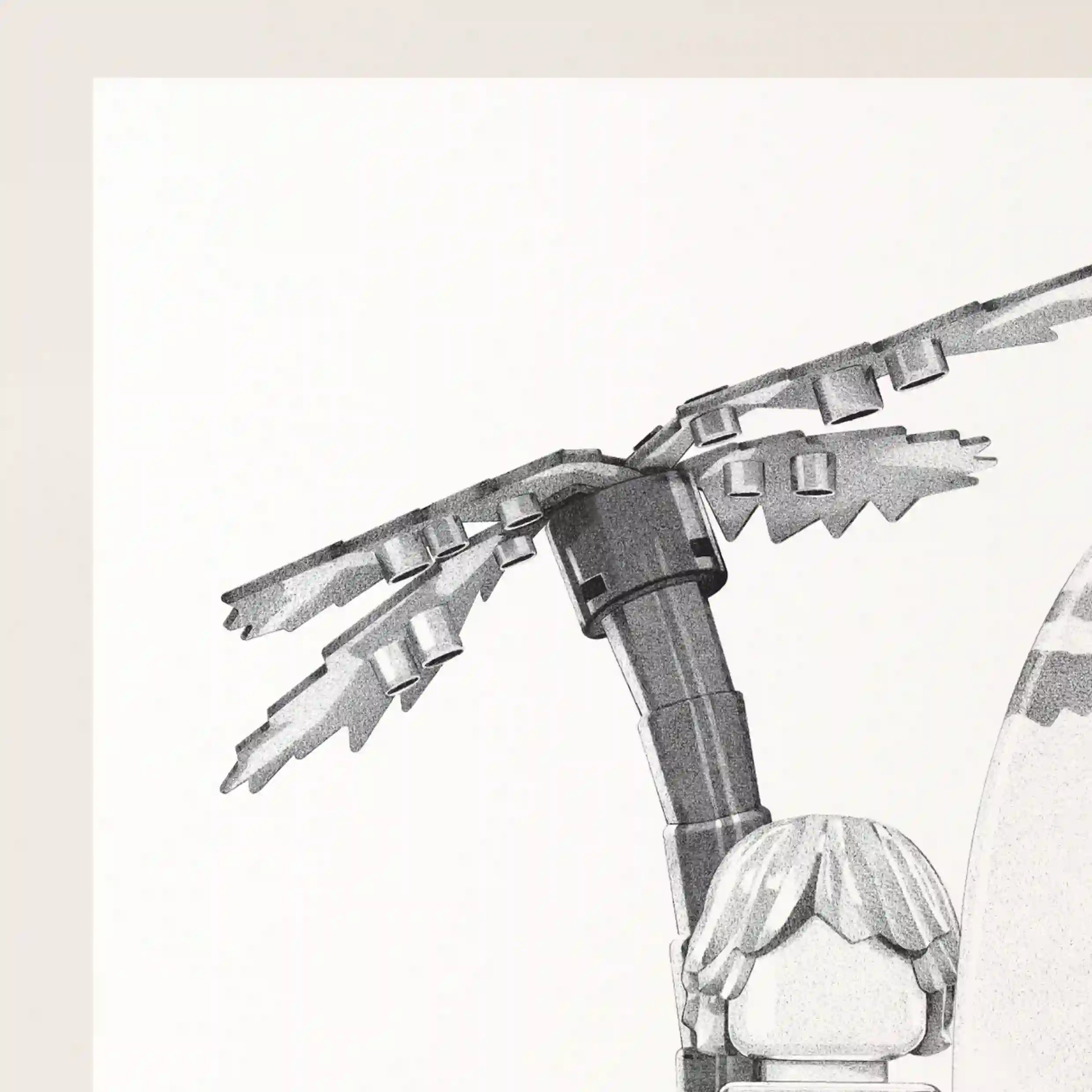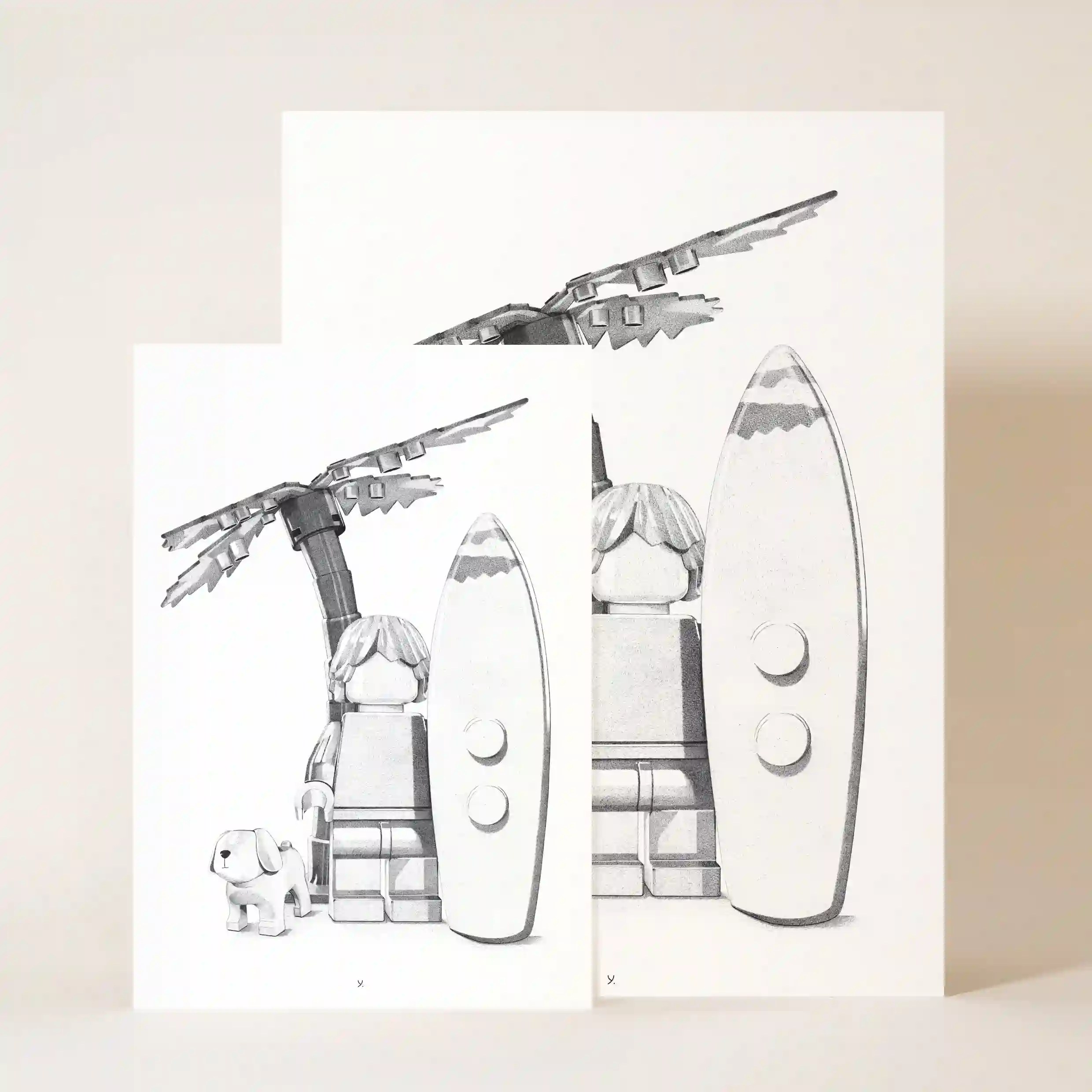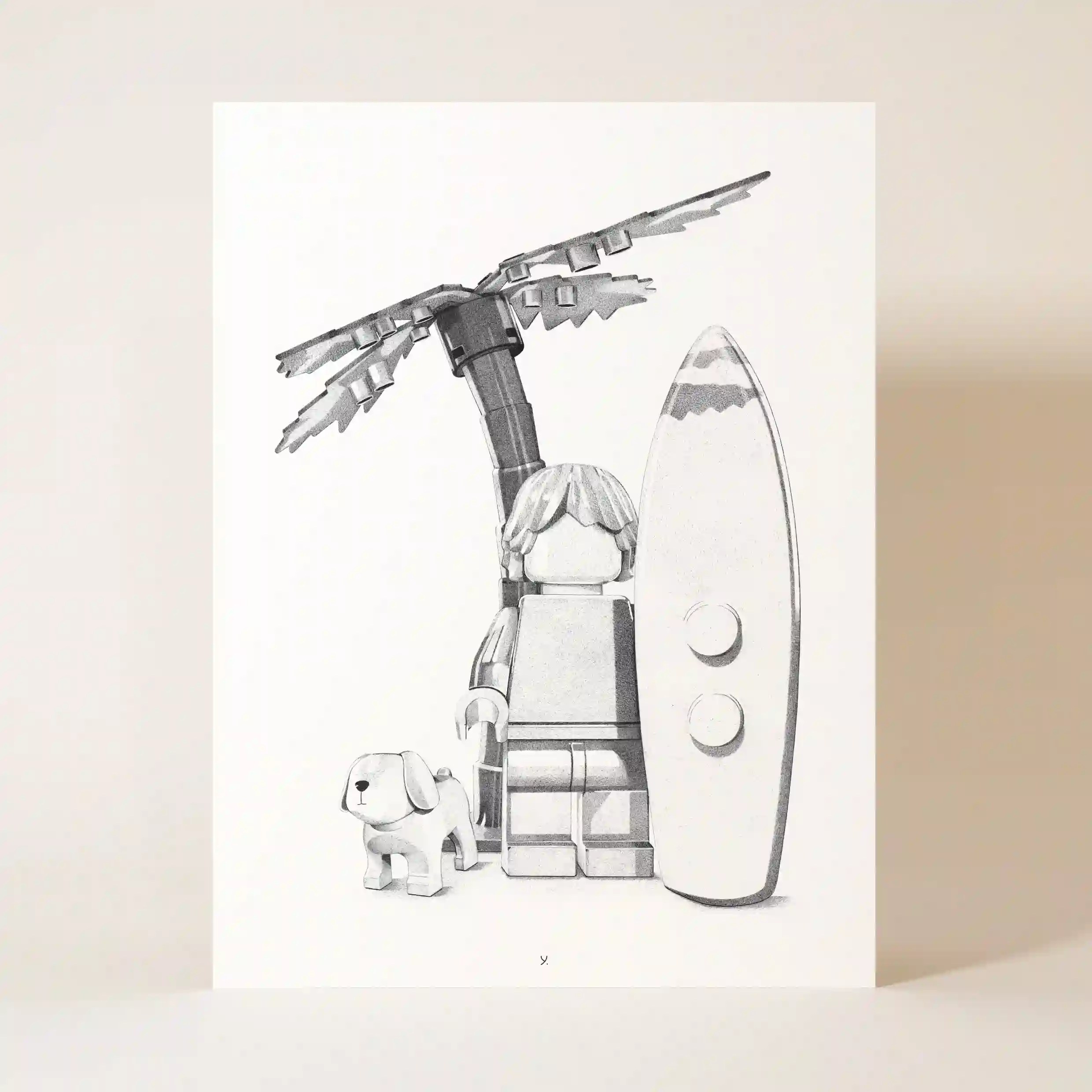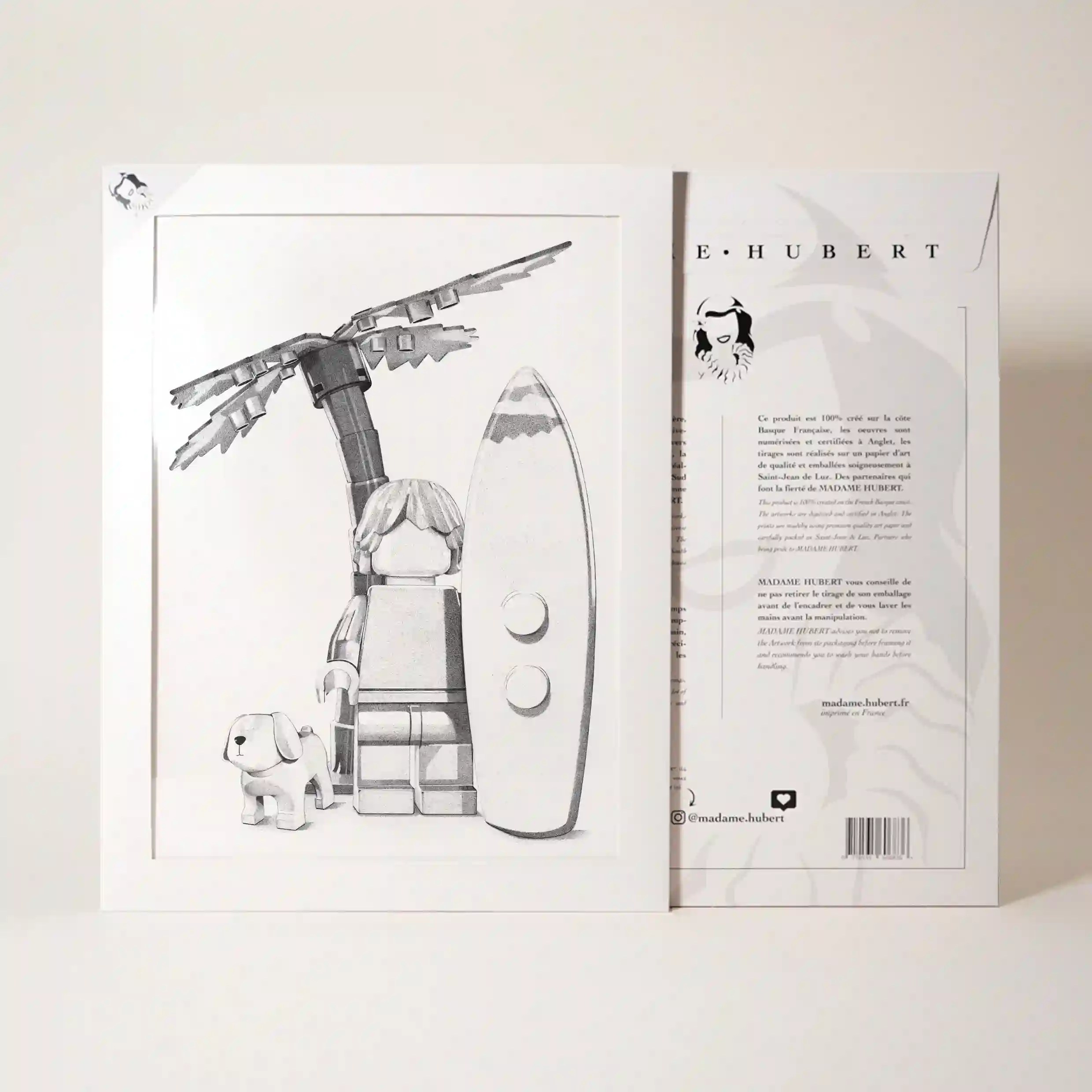 Cette affiche originale joue avec les codes du jouet emblématique pour créer une composition artistique aussi amusante qu’élégante. Le personnage au style minimaliste, aux lignes épurées et aux textures rappelant le bois, évoque à la fois l’univers des jeux de construction et l’esprit de liberté du surf. Son chien, fidèle compagnon d’aventure, ajoute une touche attachante et chaleureuse à l’ensemble.