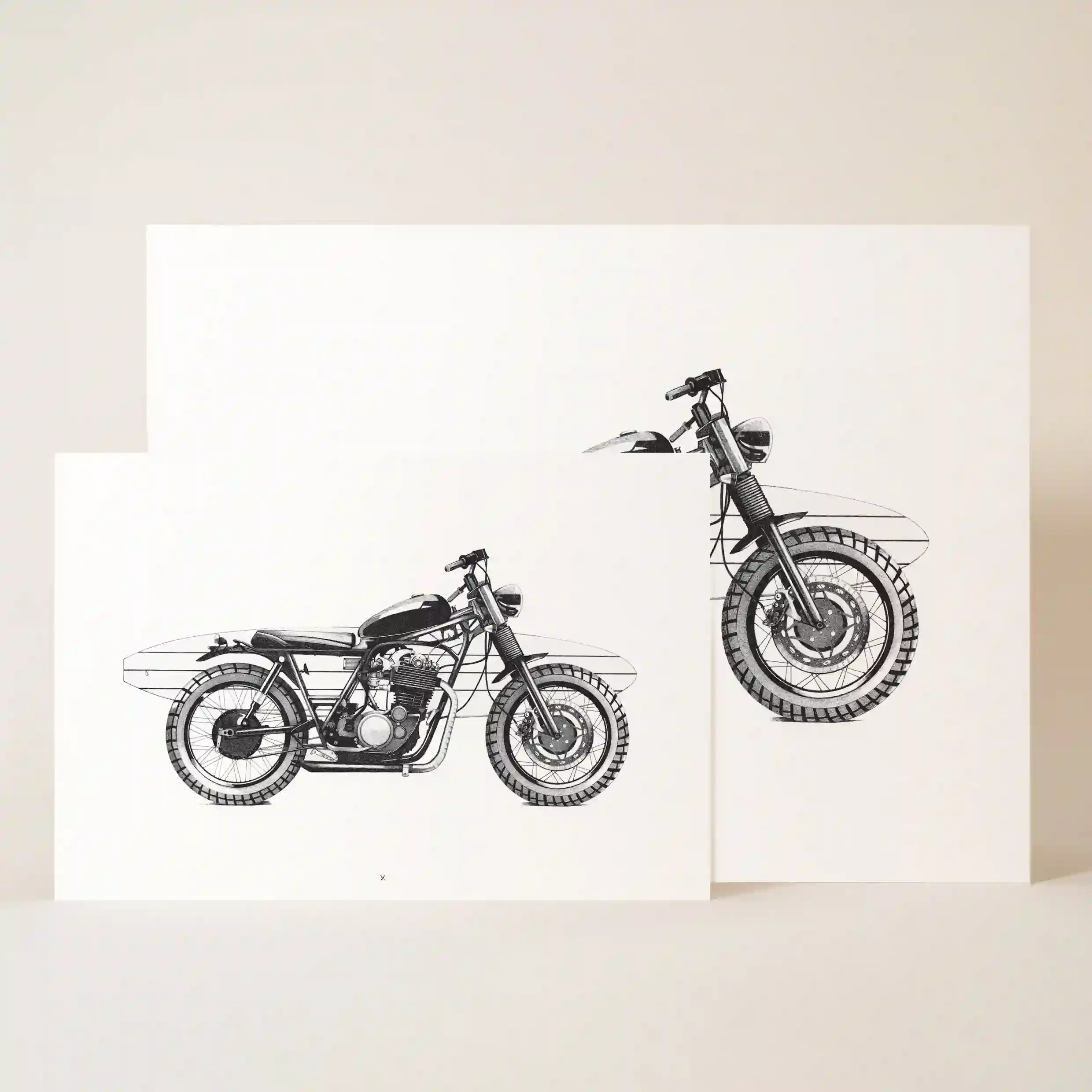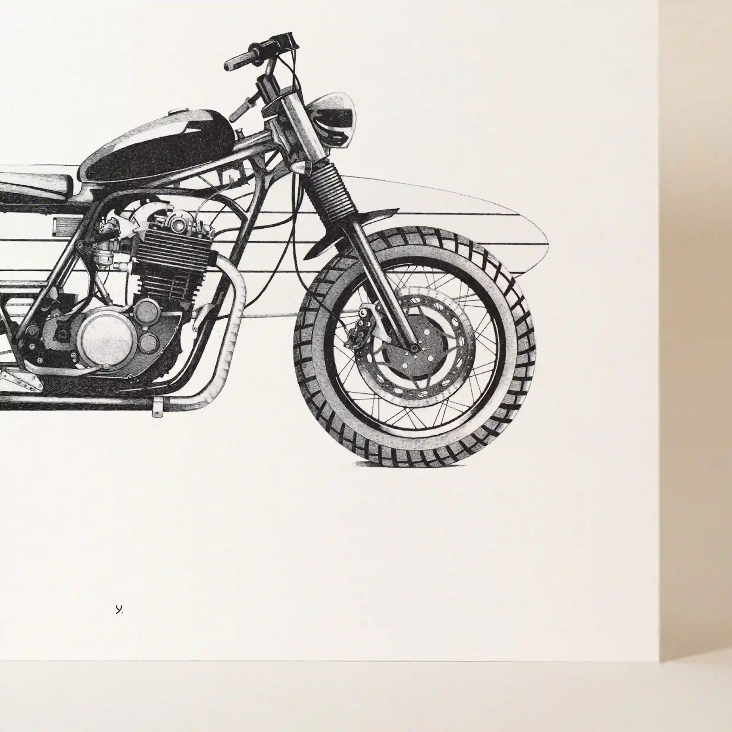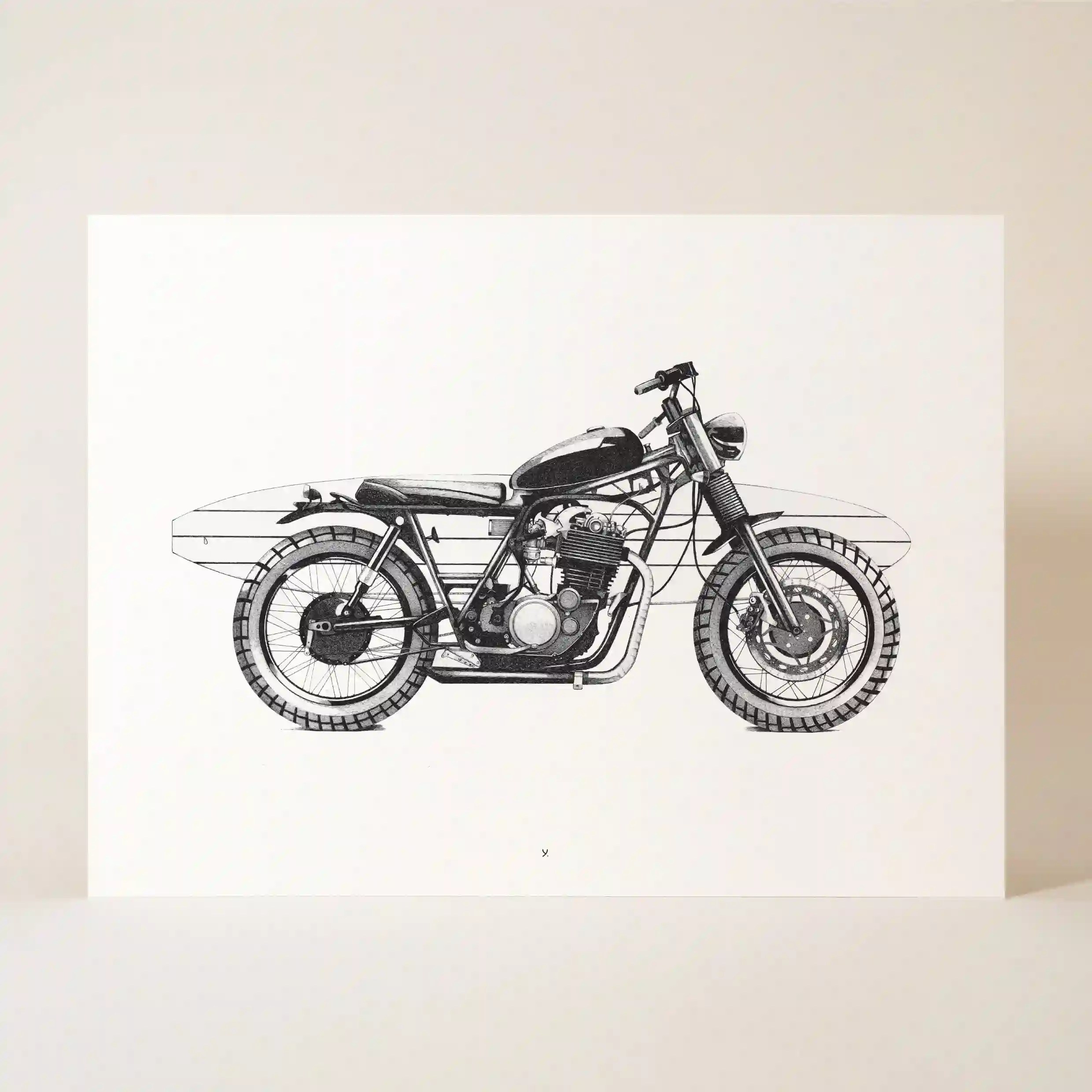 Ce dessin en noir et blanc représente une moto de style scrambler, robuste et minimaliste, associée à une planche de surf solidement attachée sur le côté. Ce contraste entre l’acier mécanique et la fluidité du surf incarne à la perfection l’âme des riders et surfeurs en quête d’aventure.