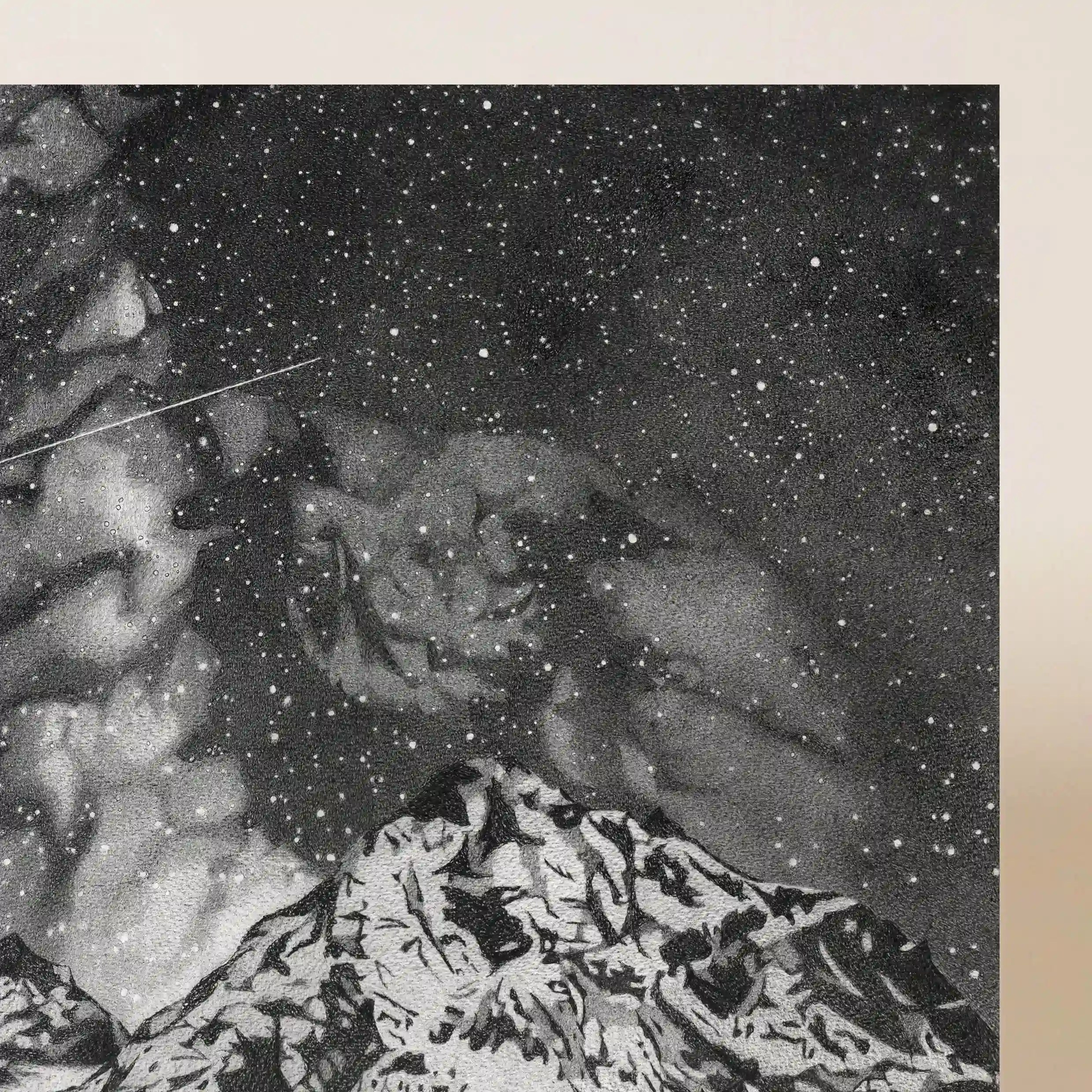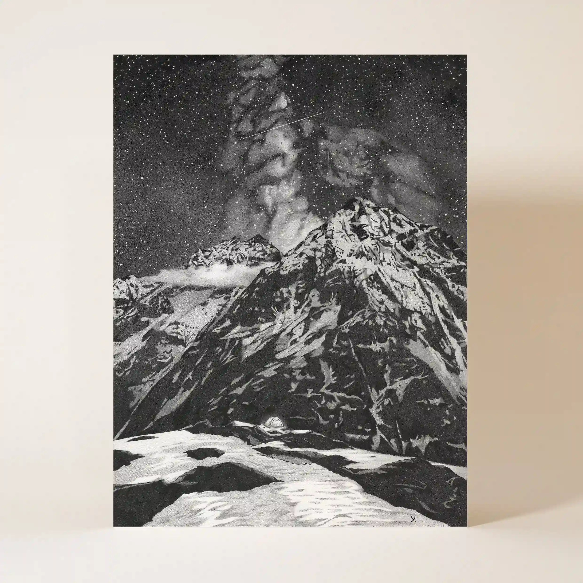 Plongez dans un univers fascinant où les sommets enneigés rencontrent l’immensité du cosmos avec cette affiche montagne. Ce dessin en noir et blanc transporte l’observateur au cœur d’une nuit étoilée en altitude, où le ciel, profond et mystérieux, semble se fondre dans les reliefs majestueux. Une composition poétique qui joue avec les contrastes entre l’ombre des montagnes et la lueur des étoiles, créant une atmosphère à la fois envoûtante et contemplative.