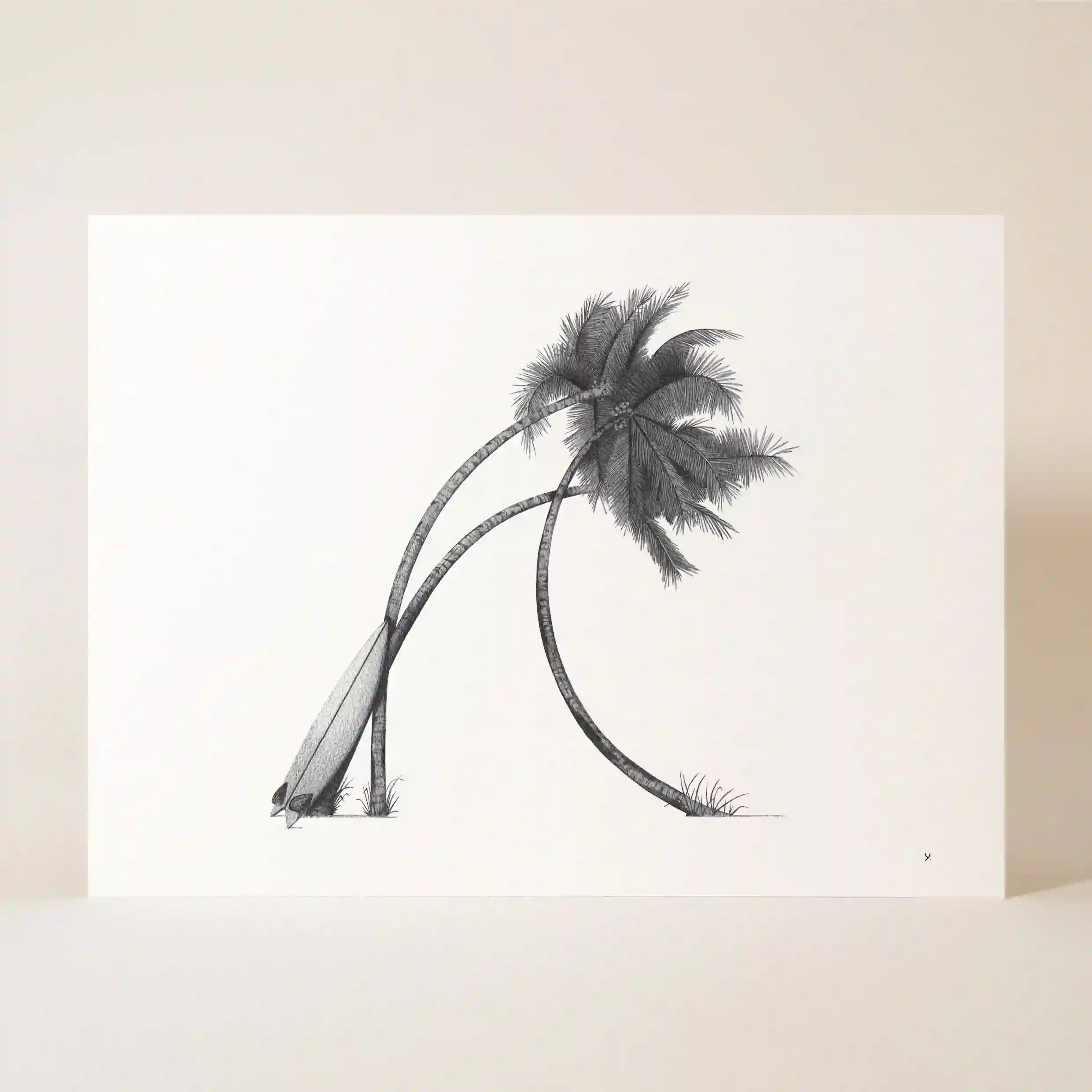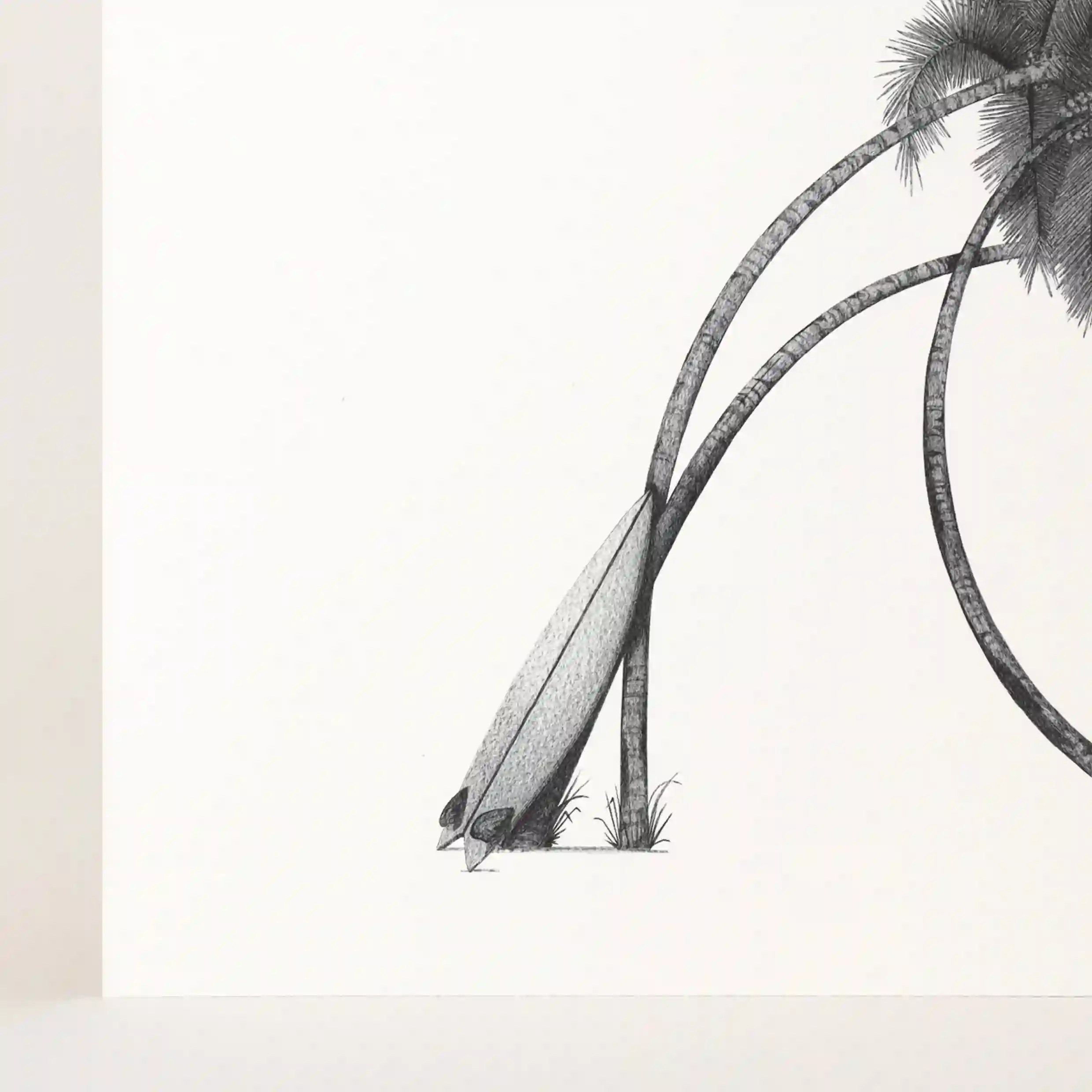 Cette affiche originale est réalisée avec une grande finesse de détails. Chaque feuille de palmier est finement illustrée, donnant une impression de mouvement léger sous l’effet du vent marin. La planche de surf, appuyée contre le palmier, ajoute une dimension dynamique à la composition, comme une invitation au voyage et à l’aventure.