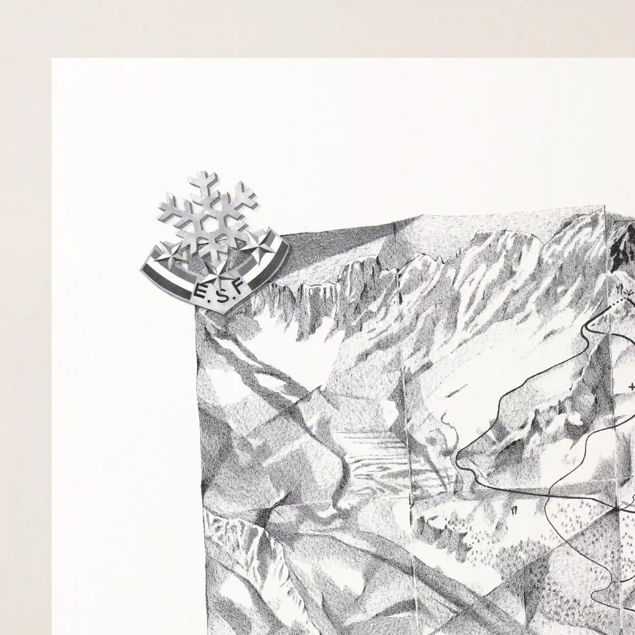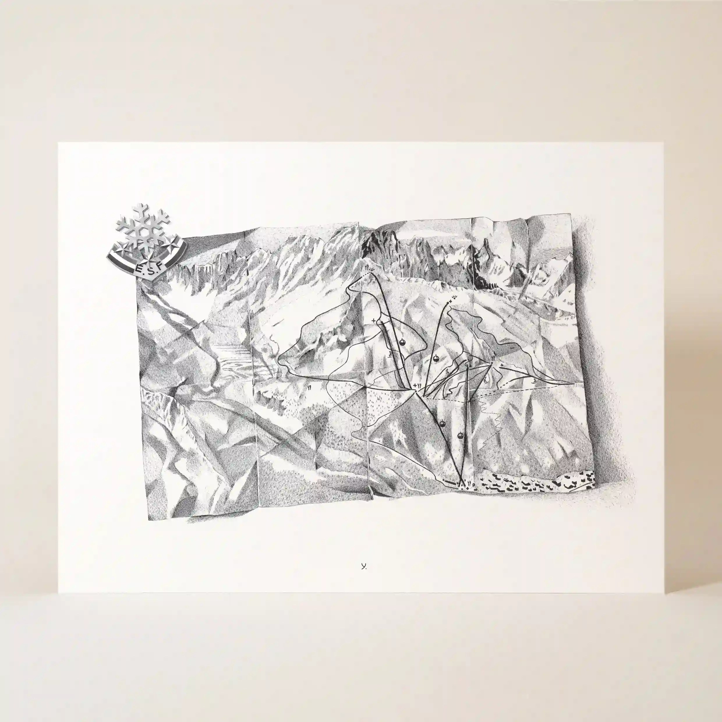 Découvrez une affiche montagne captivante qui évoque l’univers du ski et l’appel de l’aventure en altitude. Cette illustration en noir et blanc représente avec finesse un plan de domaine skiable soigneusement dessiné, où se croisent remontées mécaniques et pistes serpentant entre les reliefs enneigés. Chaque détail est finement esquissé pour donner vie à cette carte, comme si elle avait été dépliée juste avant une descente en ski.