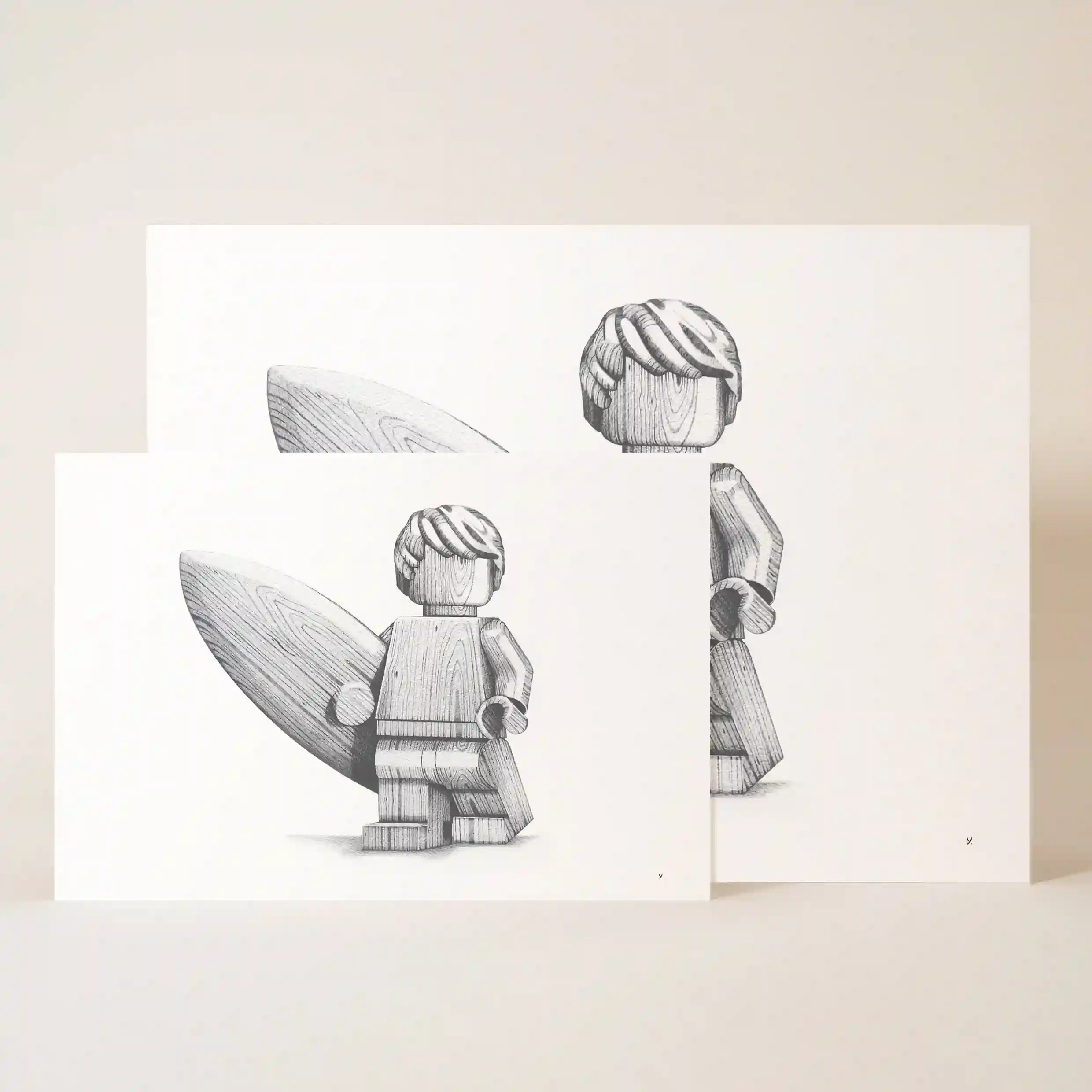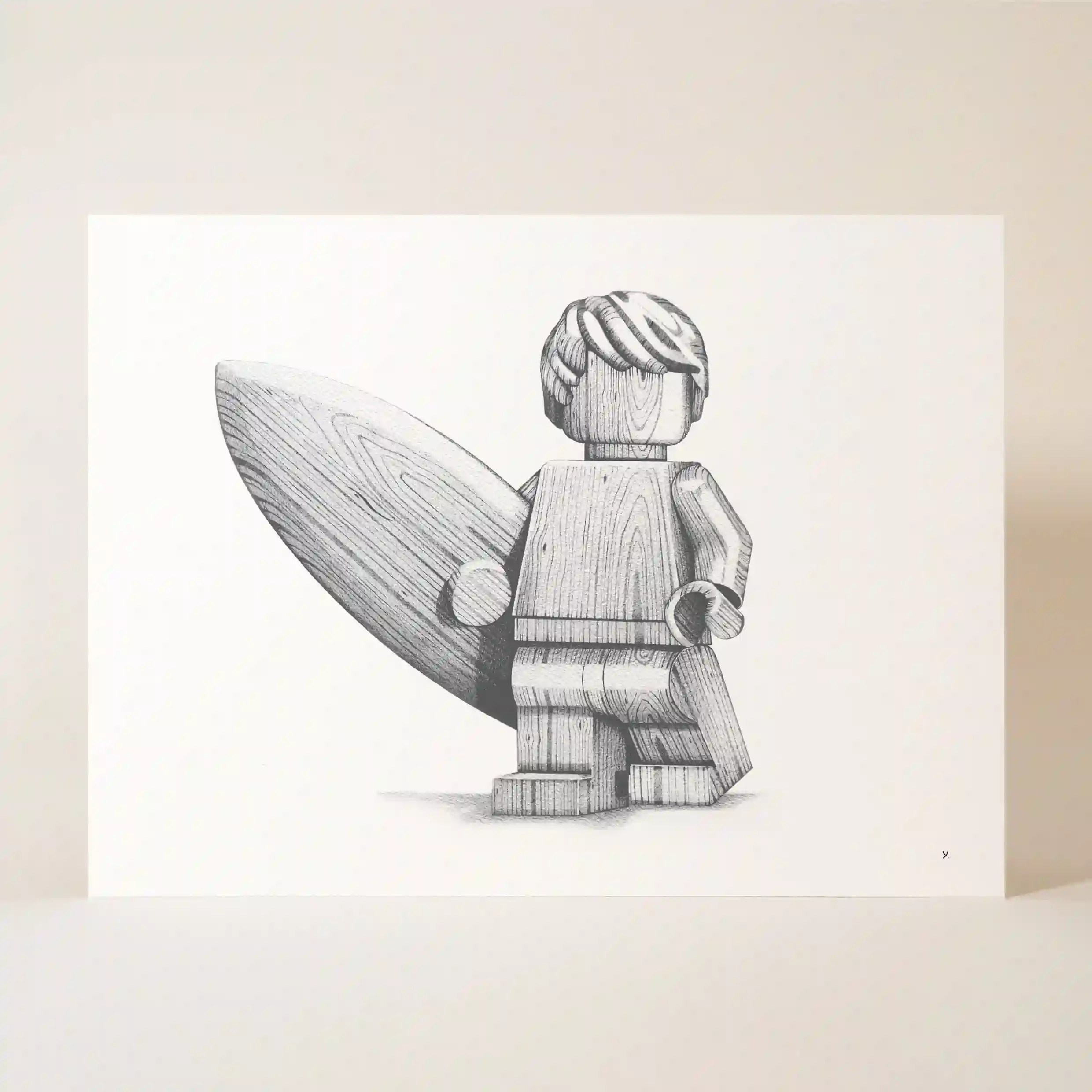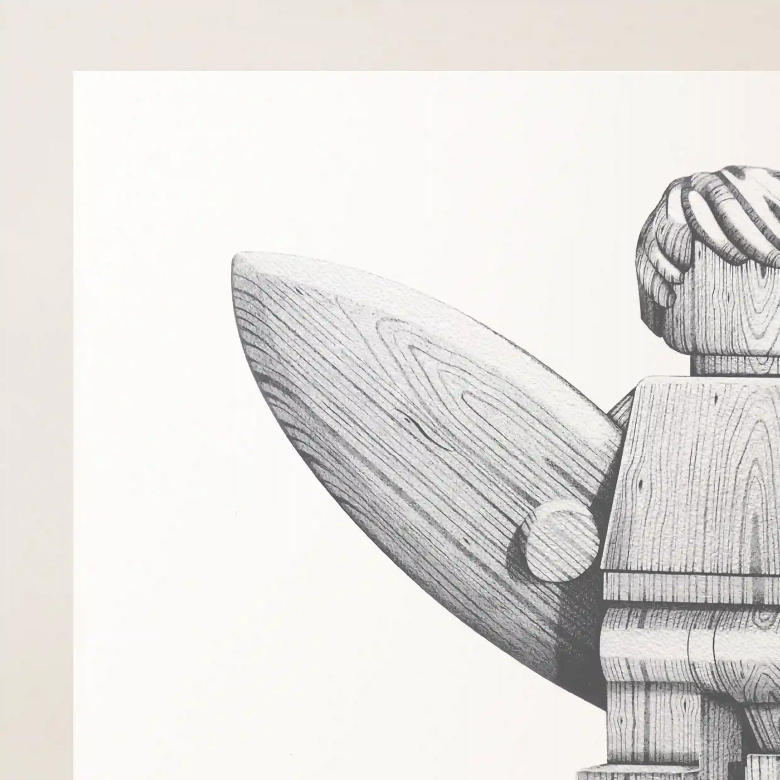 Cette illustration en noir et blanc se distingue par son style raffiné et minimaliste. Le travail du bois, finement gravé en dessin, donne une texture unique à la figurine, qui semble prendre vie sous nos yeux. L’effet de matière offre un rendu visuel impressionnant, jouant sur les contrastes et les ombres pour donner de la profondeur à l’image. Que ce soit pour un passionné de surf, un amateur de jouets iconiques ou simplement pour embellir une décoration, cette affiche est un choix idéal.