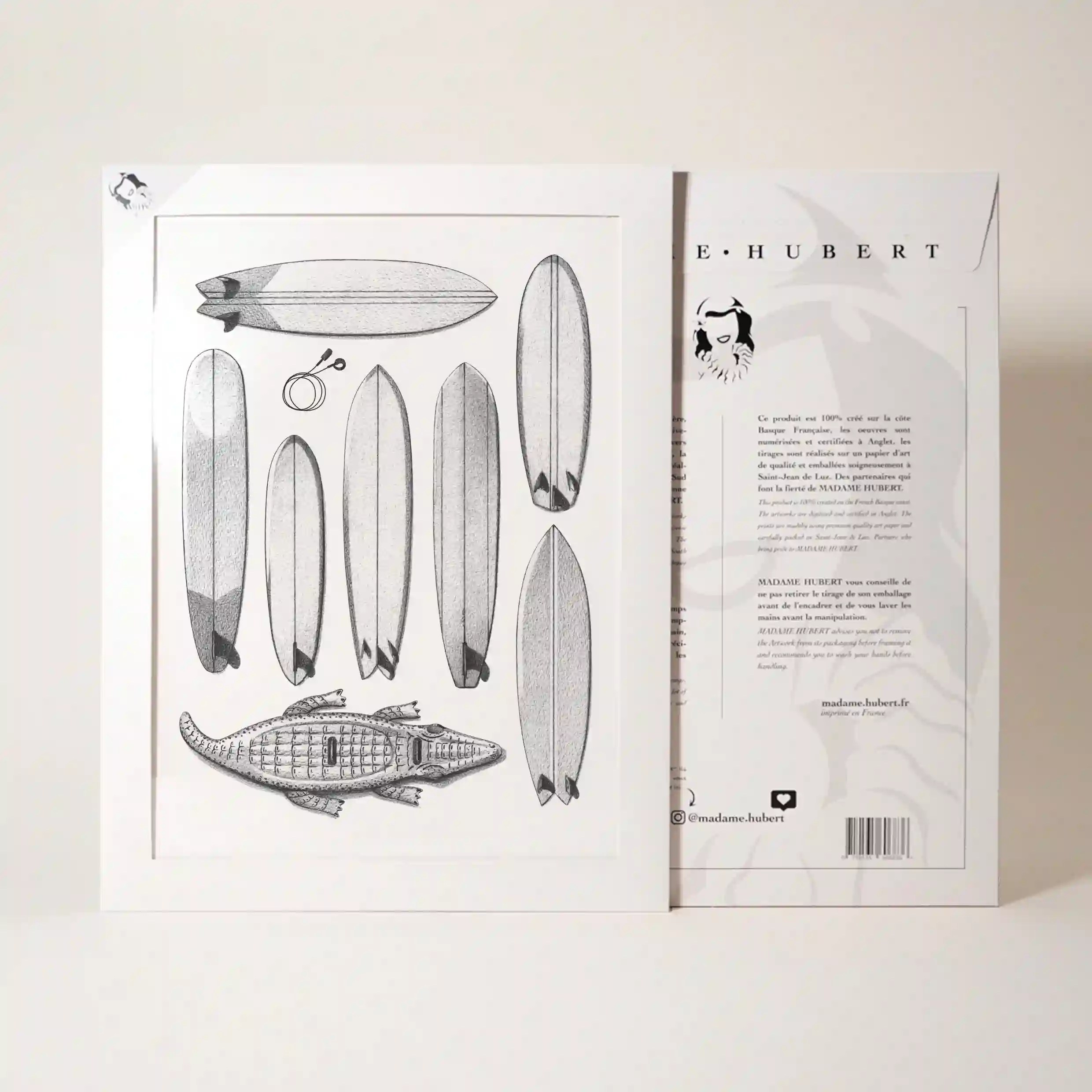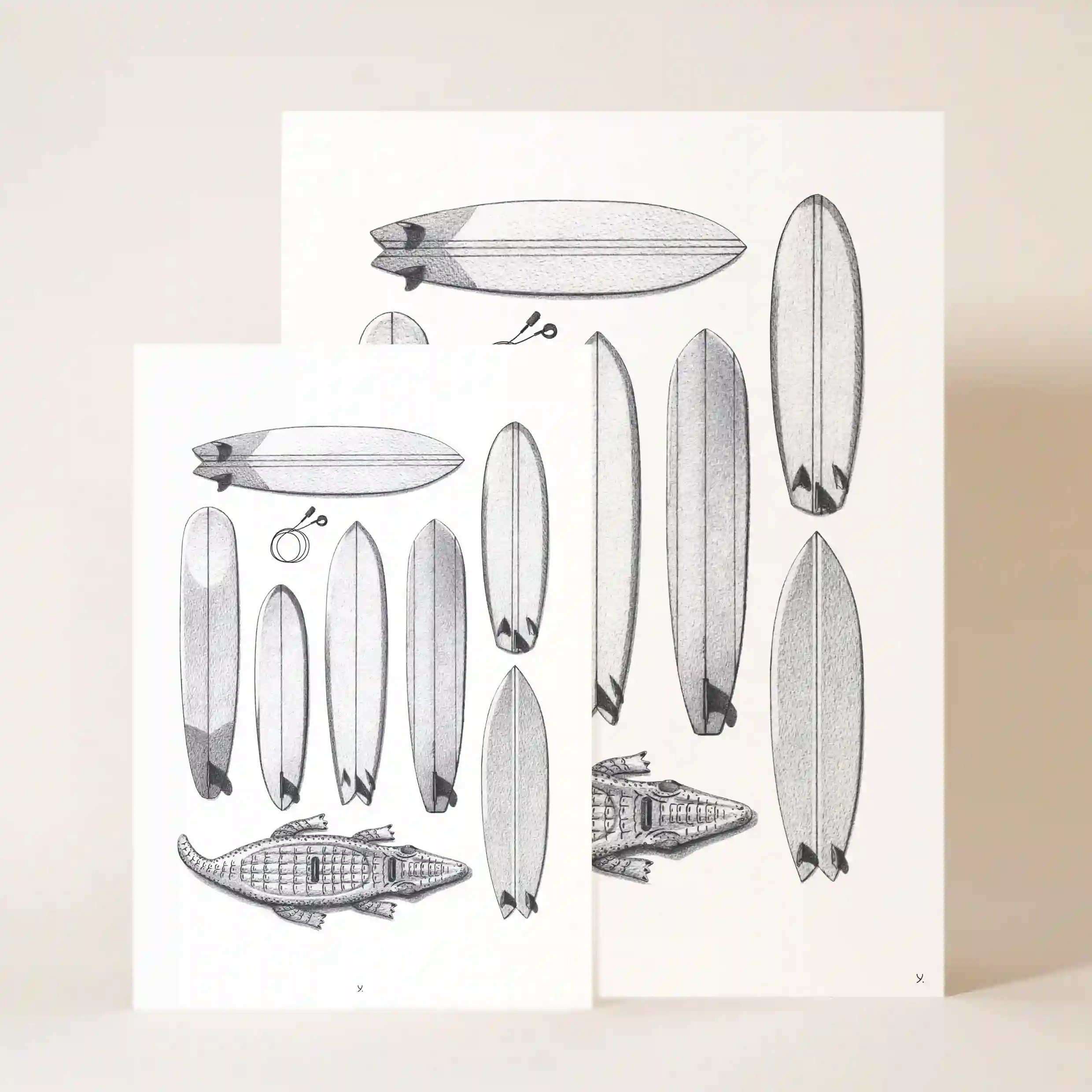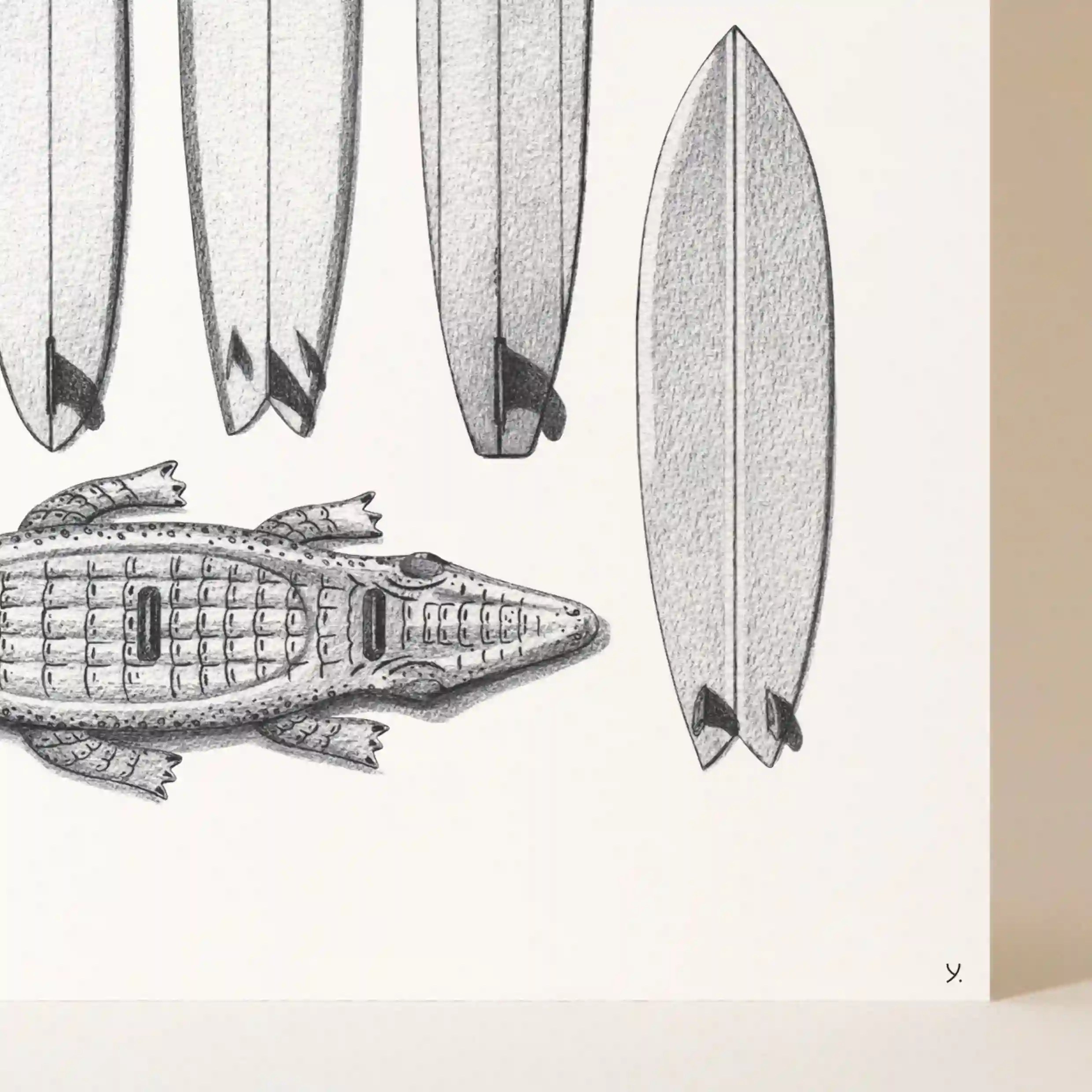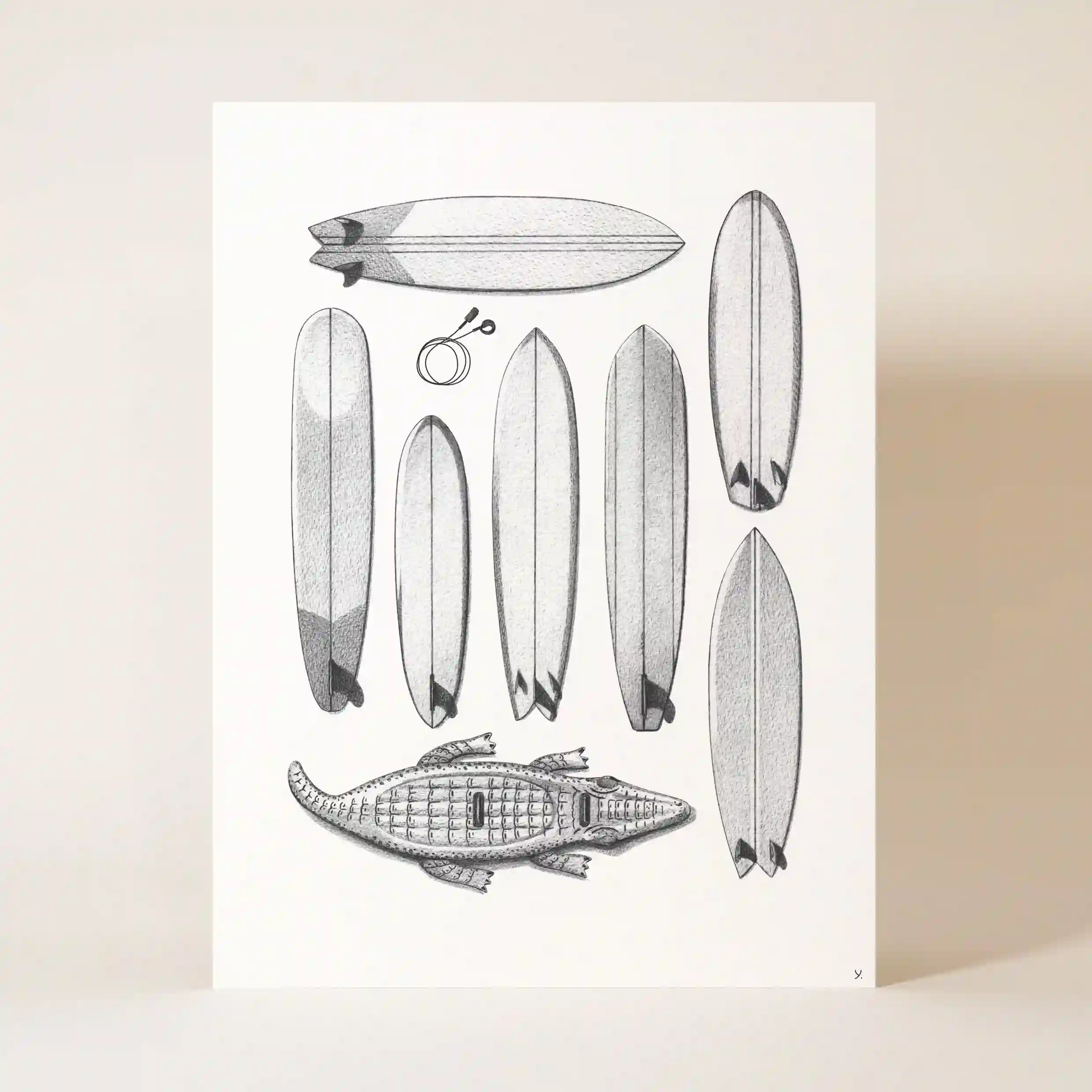 Cette affiche mer illustre avec précision différents types de planches de surf, allant des modèles classiques longboards aux fish, twin fins et autres designs modernes. Chaque élément est dessiné avec minutie, mettant en valeur les formes, les détails des dérives et l’esthétique minimaliste de chaque planche. Le crocodile, quant à lui, apporte une touche inattendue et symbolise à la fois l’adaptabilité et la force de la nature.