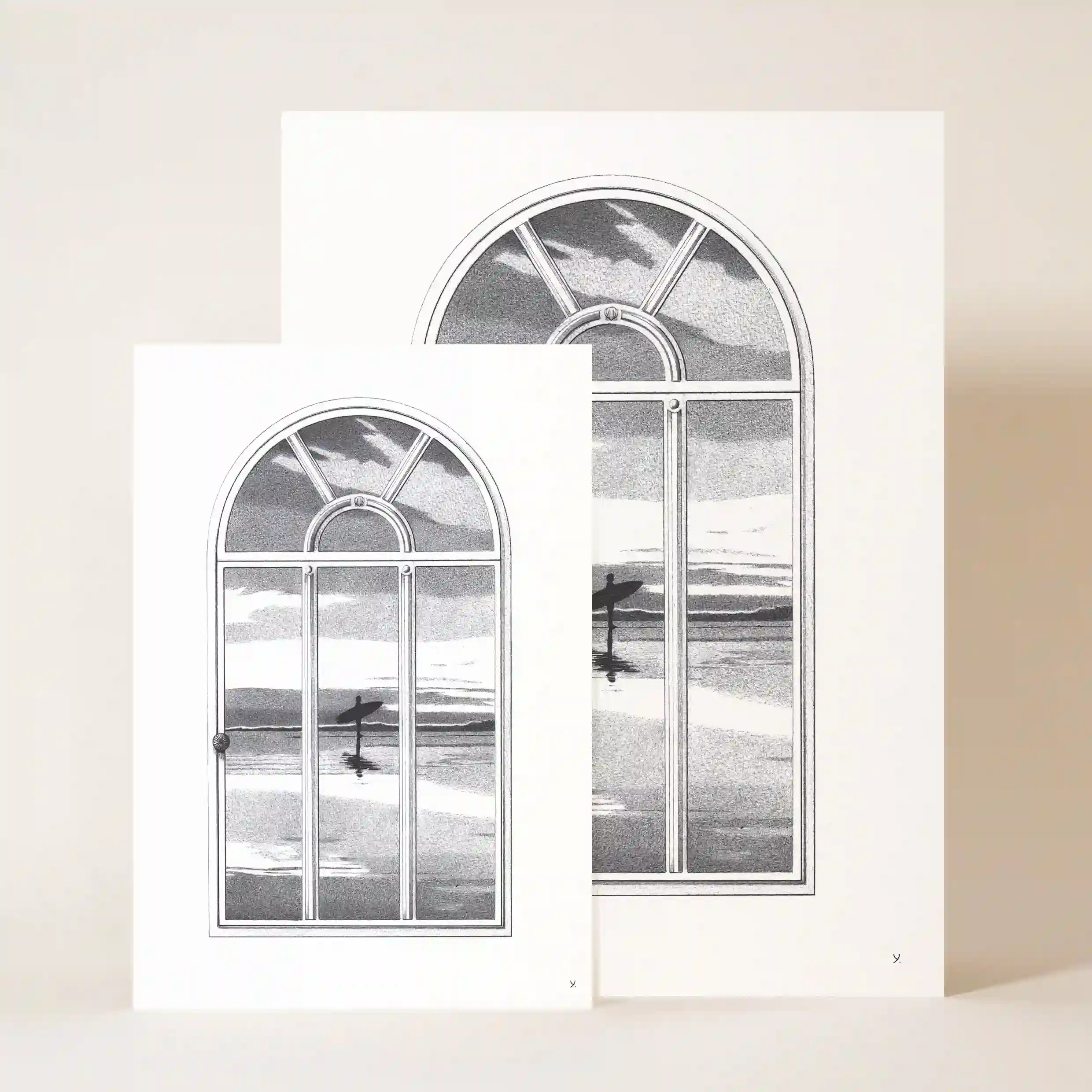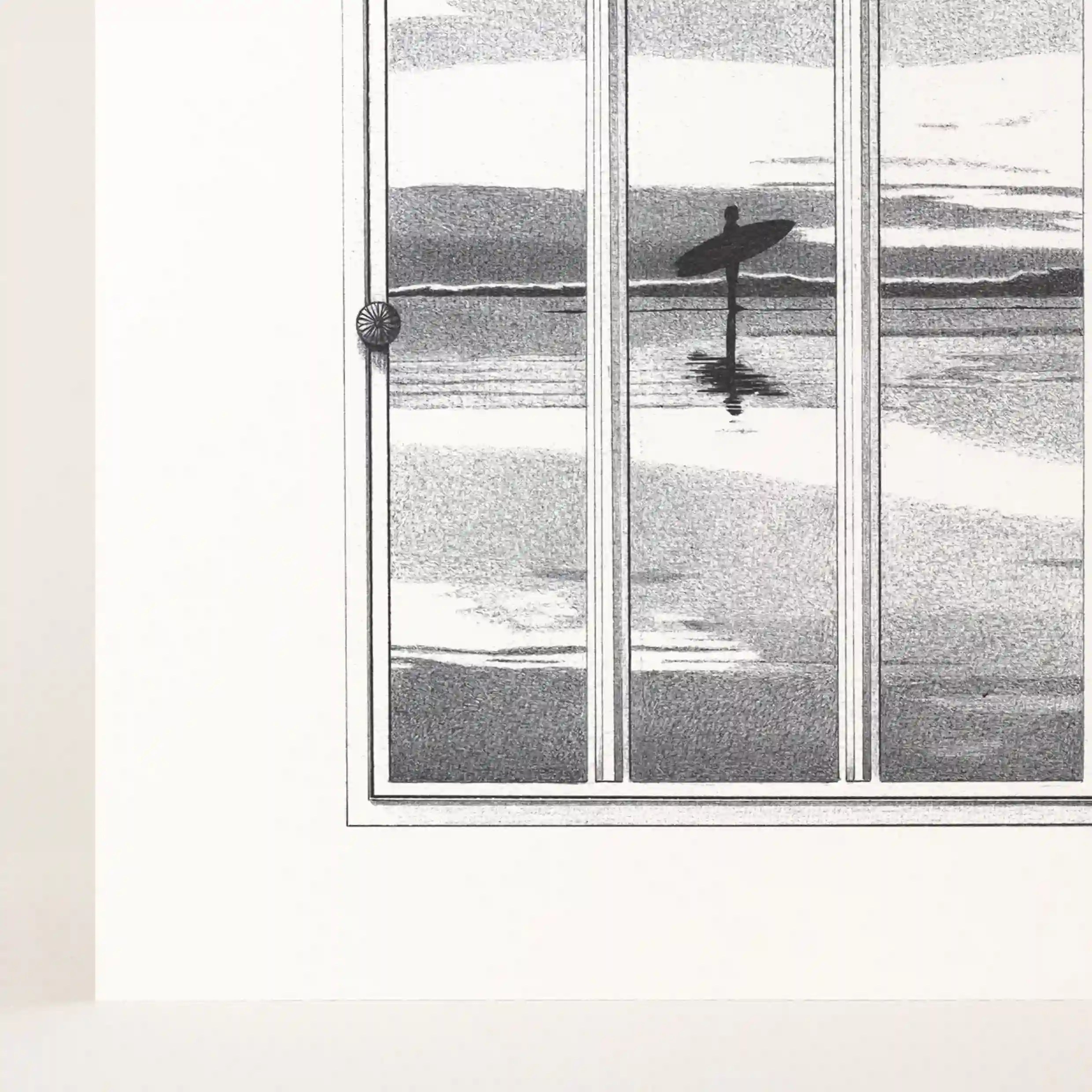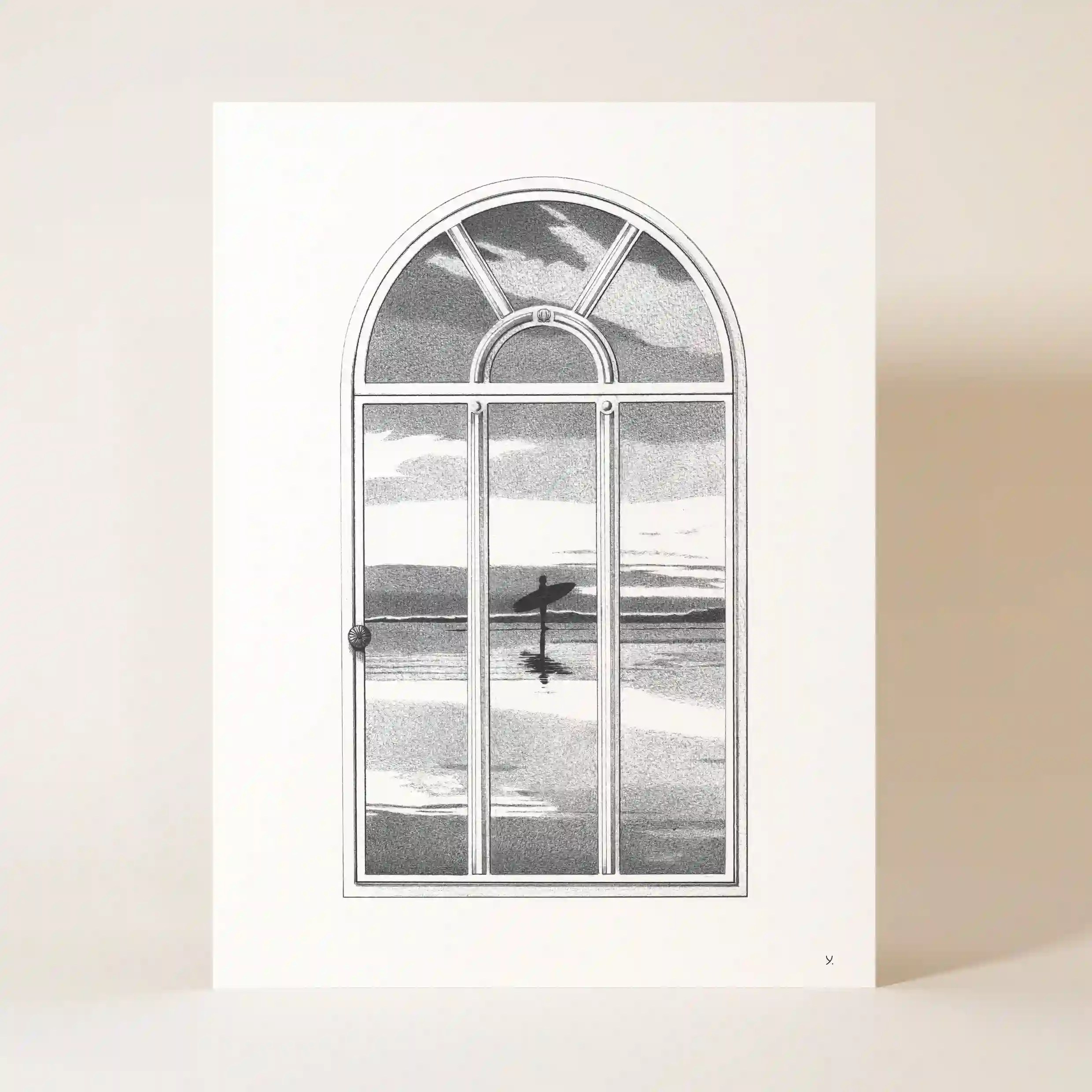 Plongez dans une atmosphère poétique et contemplative avec cette affiche mer, une œuvre unique qui capte l’essence de l’évasion et du rêve. Ce dessin illustre une grande fenêtre en arche à travers laquelle se dévoile un paysage marin d’une douceur infinie. Au loin, un surfeur solitaire, silhouette calme et immobile, attend sur sa planche, face à l’horizon, sous une lumière crépusculaire qui baigne la scène d’une ambiance apaisante et mélancolique.