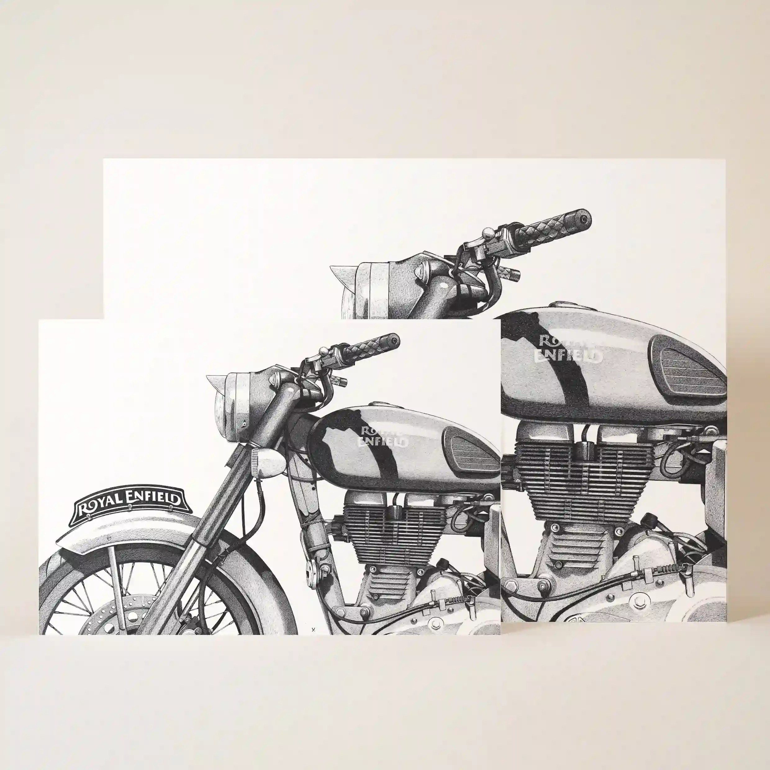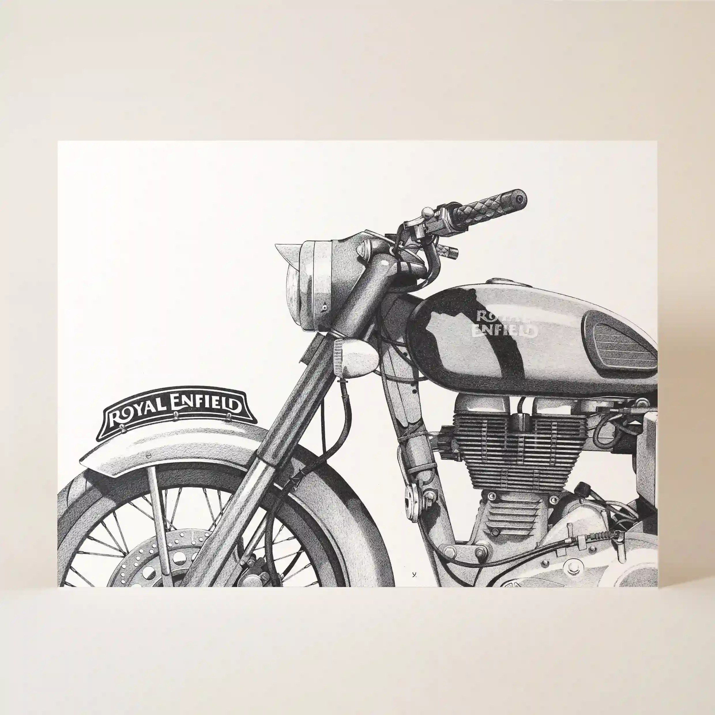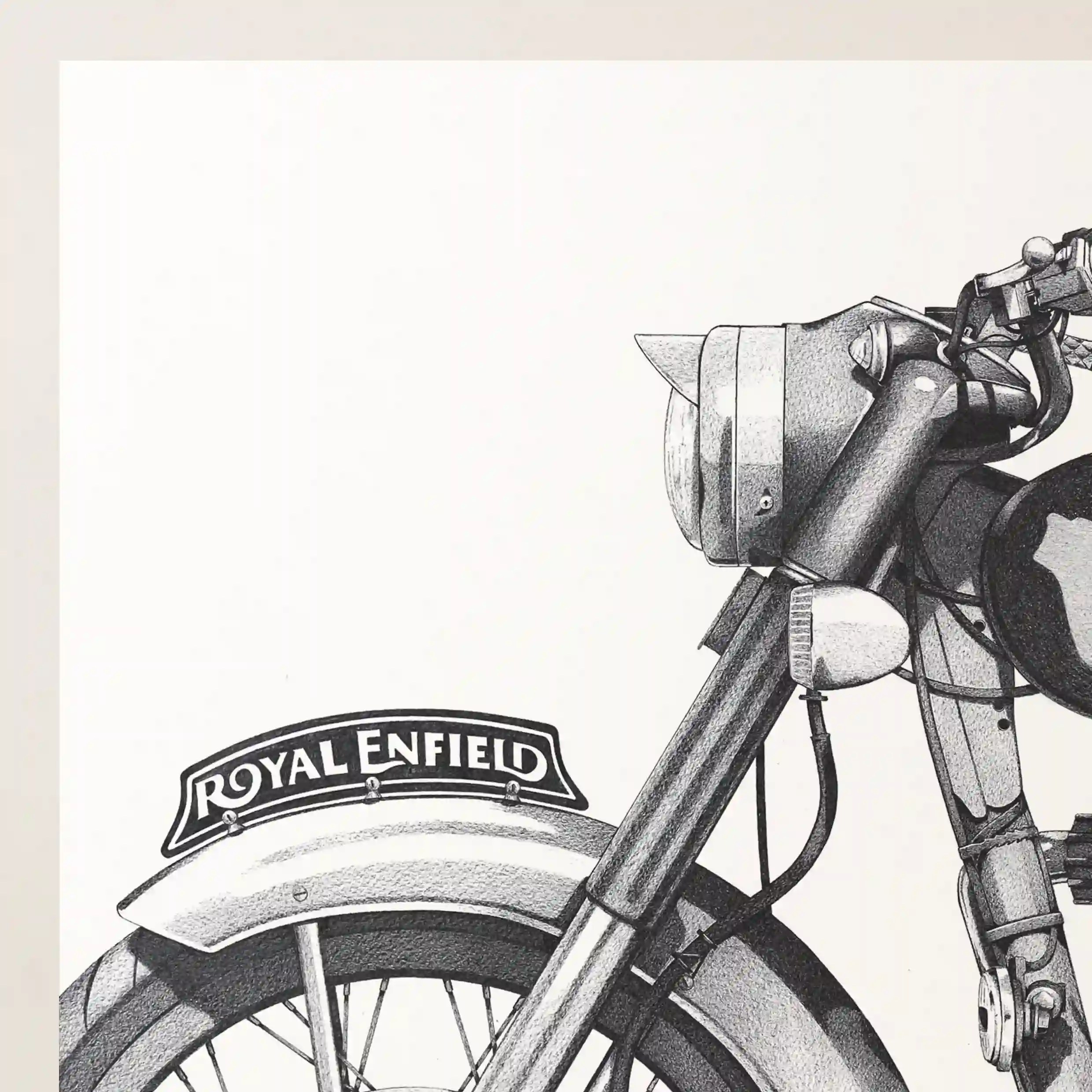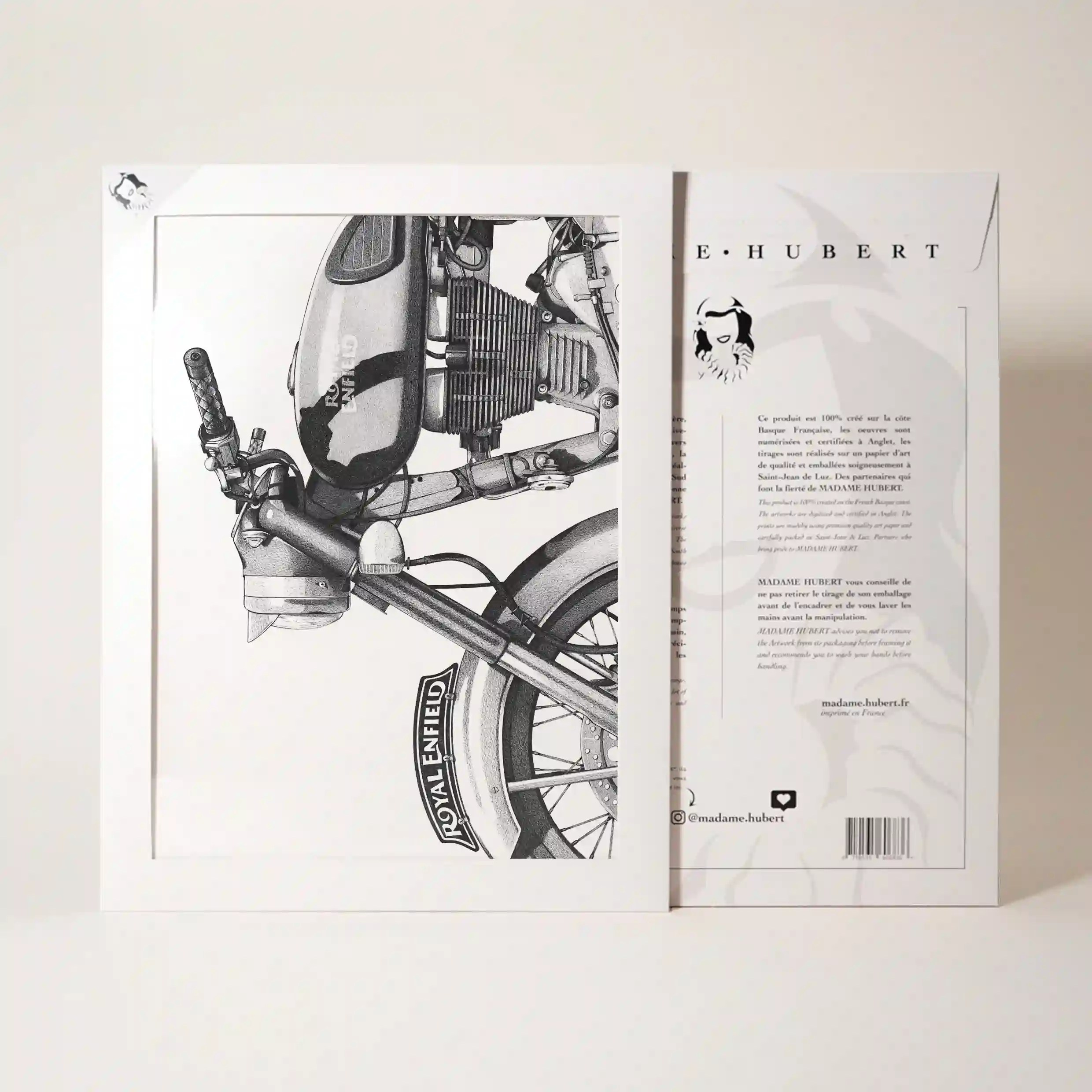 Plongez dans l’univers du vintage et de l’aventure avec cette affiche originale représentant une moto Royal Enfield, un modèle mythique qui incarne la liberté et l’exploration. Ce dessin en noir et blanc, d’un réalisme saisissant, met en avant chaque détail de la mécanique et de l’esthétique de cette moto légendaire. Son trait minutieux, sa composition épurée et son rendu contrasté en font une pièce décorative à la fois puissante et élégante.