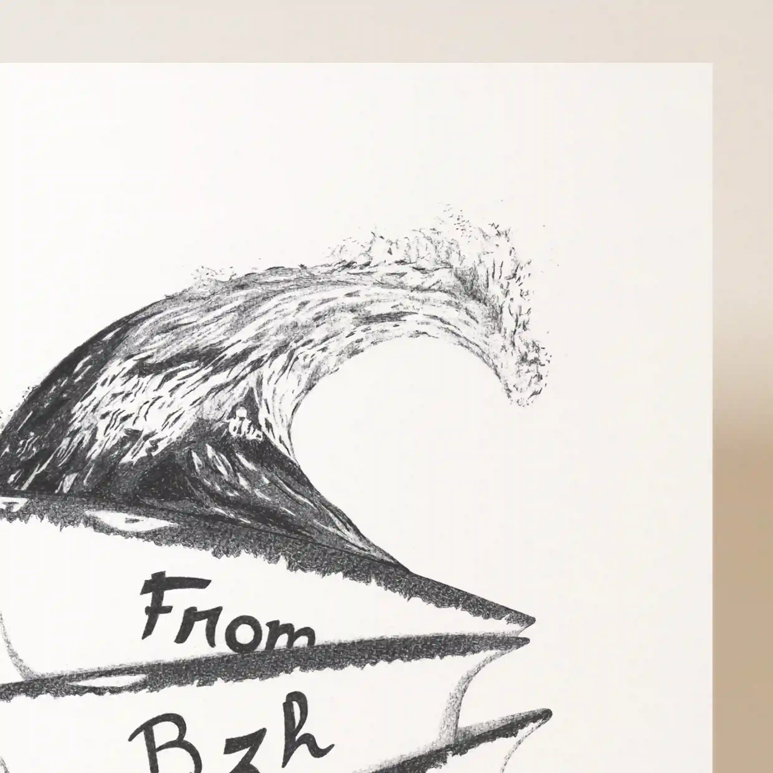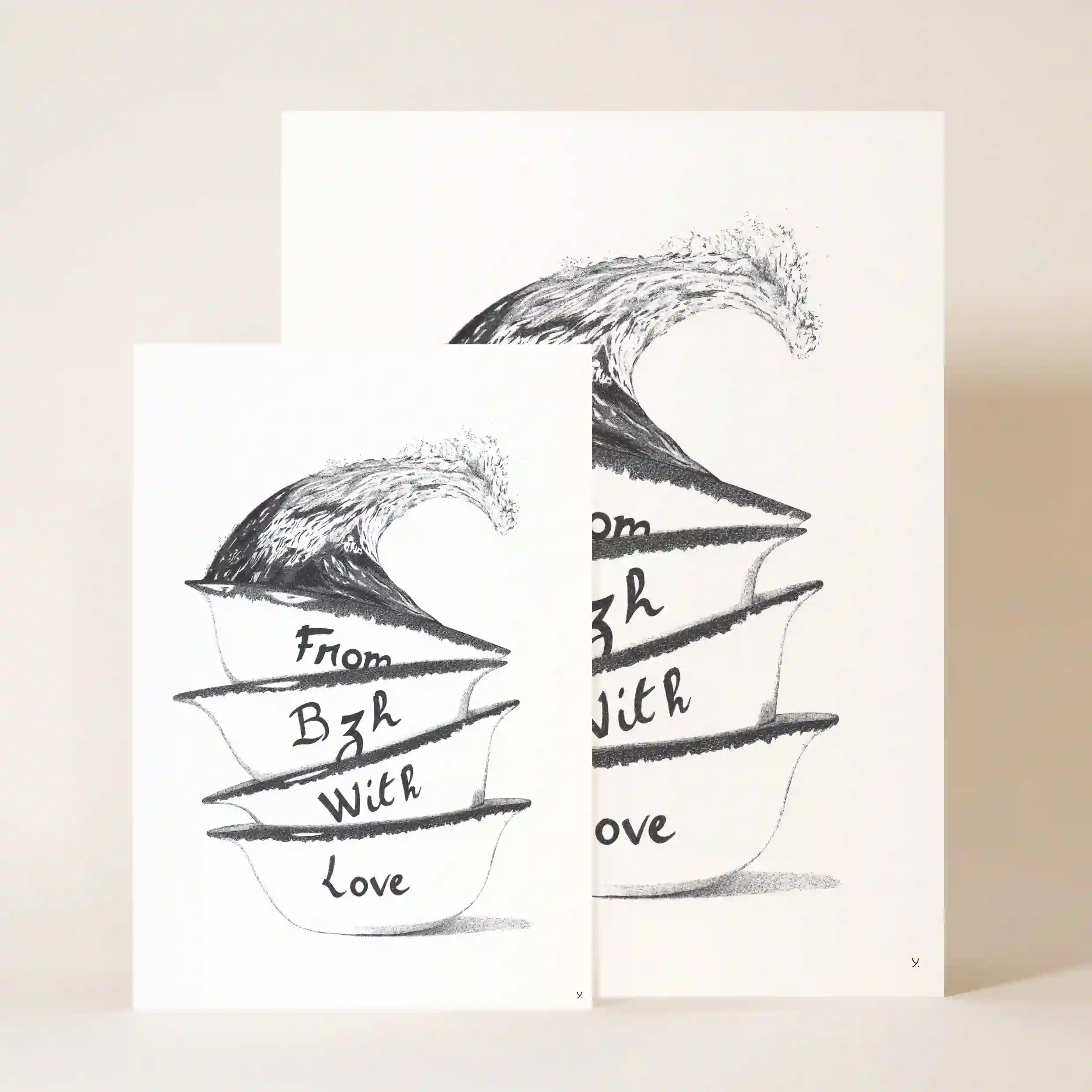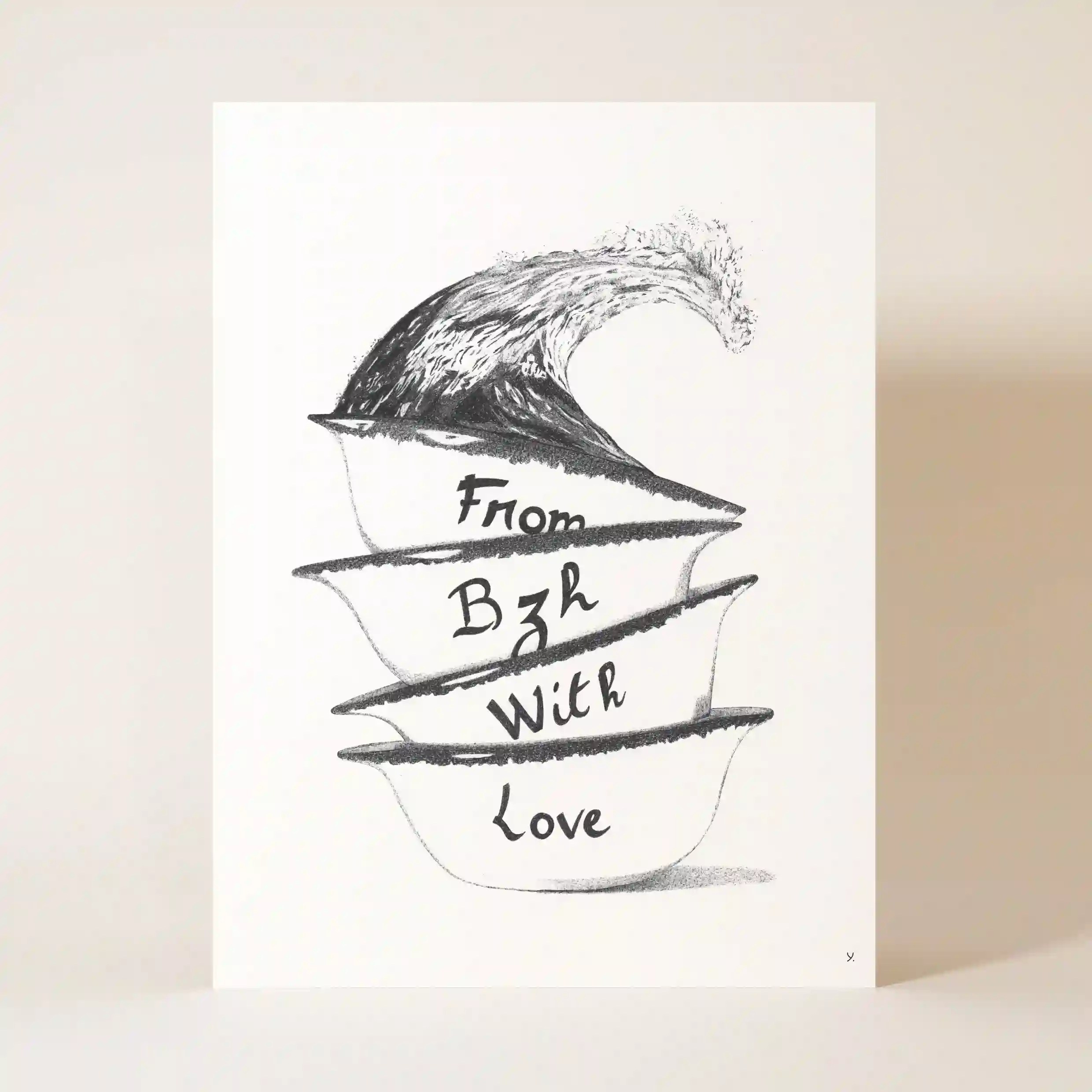 Plongez dans l’univers maritime et artistique avec cette affiche mer originale, un hommage subtil et poétique à la Bretagne. Ce dessin en noir et blanc, à la fois élégant et plein de caractère, met en scène une composition audacieuse et symbolique : trois bols bretons empilés, portant l’inscription « From BZH With Love », surmontés d’une puissante vague qui s’échappe du dernier bol.