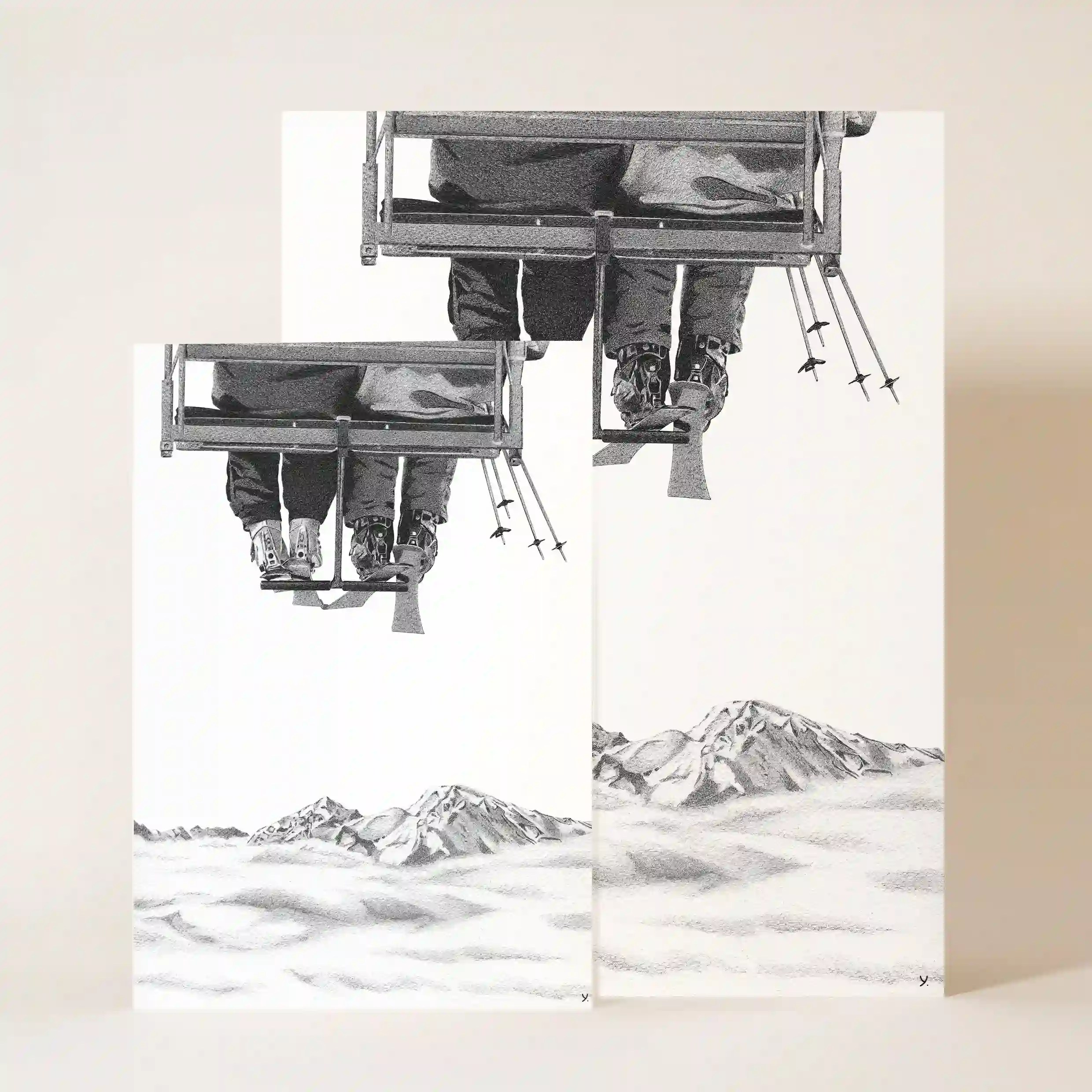 L’illustration met en avant un moment que tout amateur de ski ou de snowboard reconnaîtra immédiatement : l’attente paisible sur un télésiège, les pieds balançant au-dessus du vide, prêts à dévaler les pistes enneigées. Les skieurs, capturés sous un angle original, semblent flotter dans l’air, suspendus entre ciel et montagne. À leurs pieds, un paysage spectaculaire se dévoile : une mer de nuages enveloppe les reliefs, tandis que les sommets enneigés percent l’horizon avec majesté.