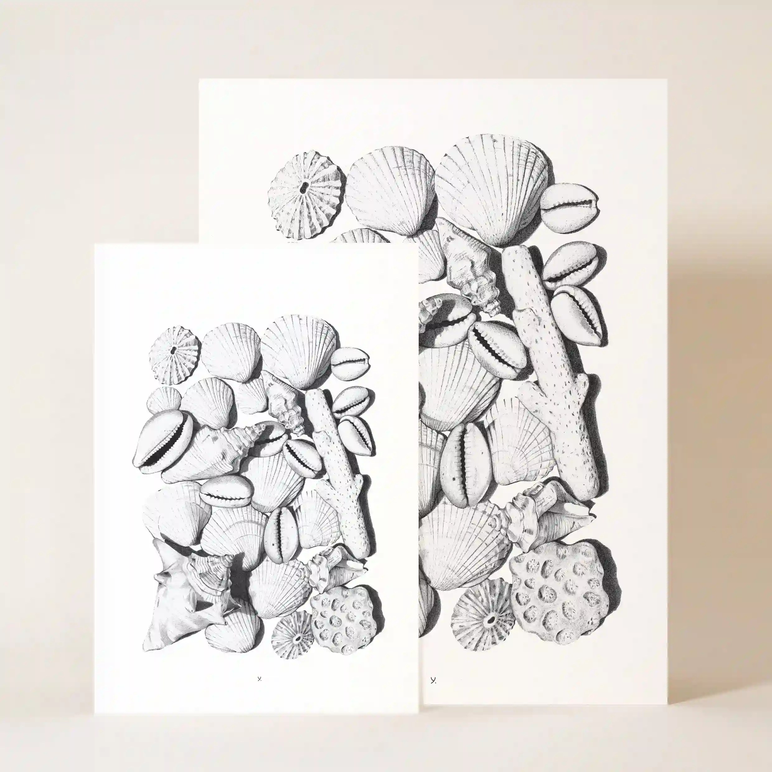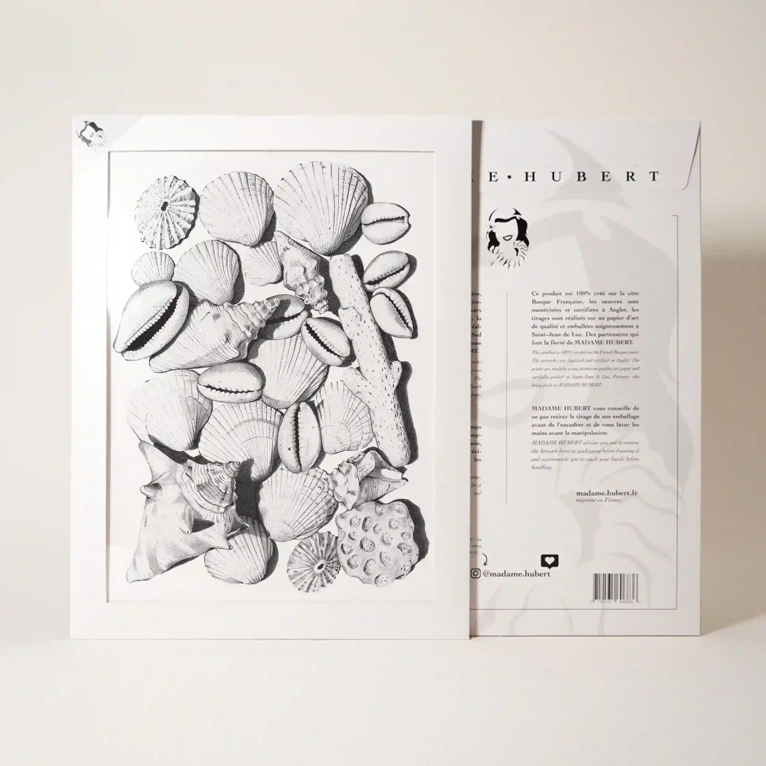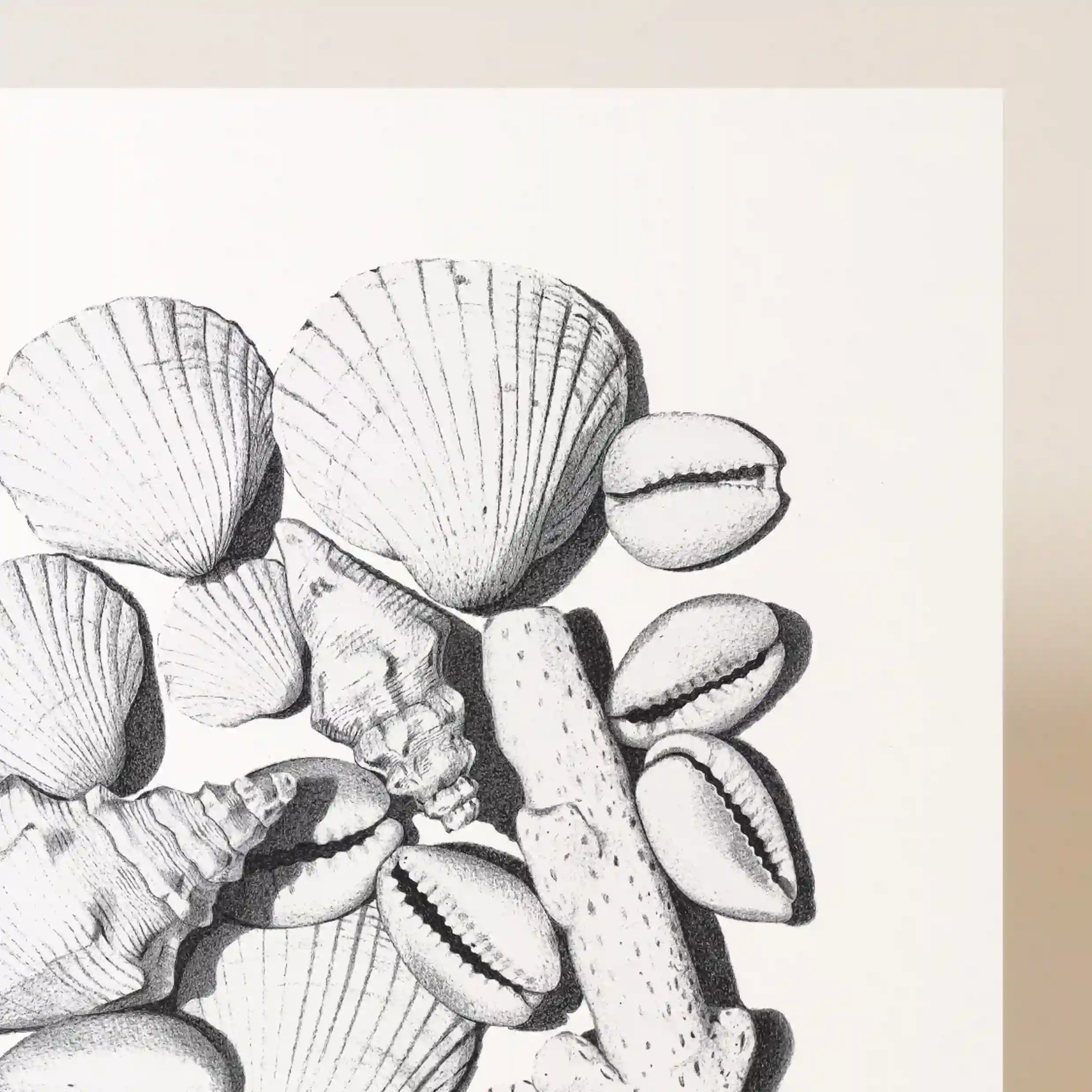Réalisée avec soin, cette affiche illustre la finesse du travail artistique, où chaque détail est minutieusement reproduit. Le jeu subtil des ombres et des contrastes donne du relief aux coquillages, leur conférant une impression de réalisme saisissante.