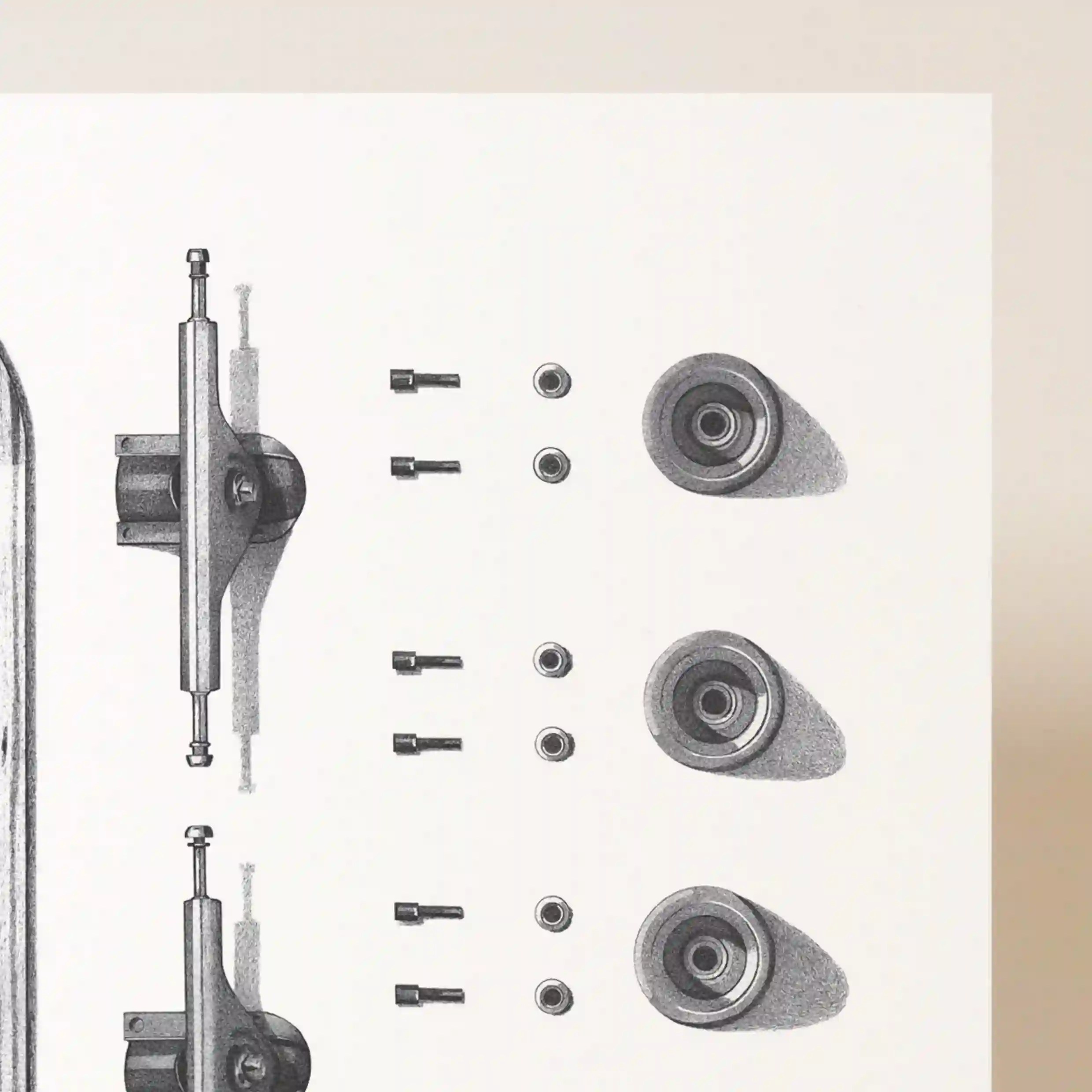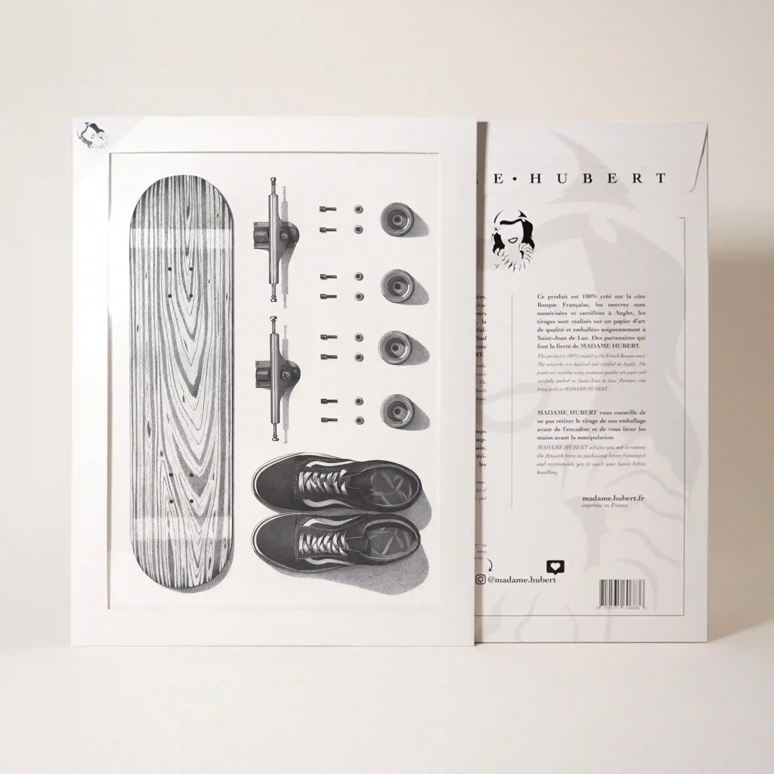 Cette affiche originale se distingue par son esthétique sobre et élégante. Le rendu en noir et blanc accentue les textures et les contrastes, offrant une véritable immersion dans l’univers du skate. L’attention portée aux détails, notamment le grain du bois et la symétrie de la composition, apporte une touche d’authenticité qui séduira aussi bien les passionnés de skate que les amateurs d’art graphique.