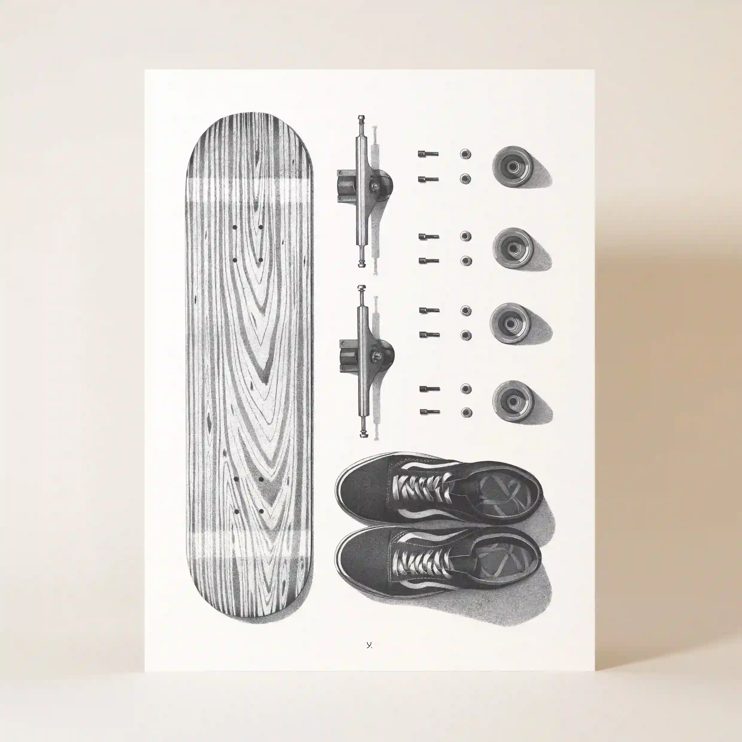 Plongez dans l’univers du skateboard avec cette affiche skate minimaliste et détaillée, qui capture l’essence même de cet art de la glisse. Son dessin en noir et blanc met en avant les éléments emblématiques d’un skateboard démonté : le plateau en bois aux lignes naturelles, les trucks robustes, les roues prêtes à être montées, ainsi que les chaussures de skate, indispensables pour tout rider.