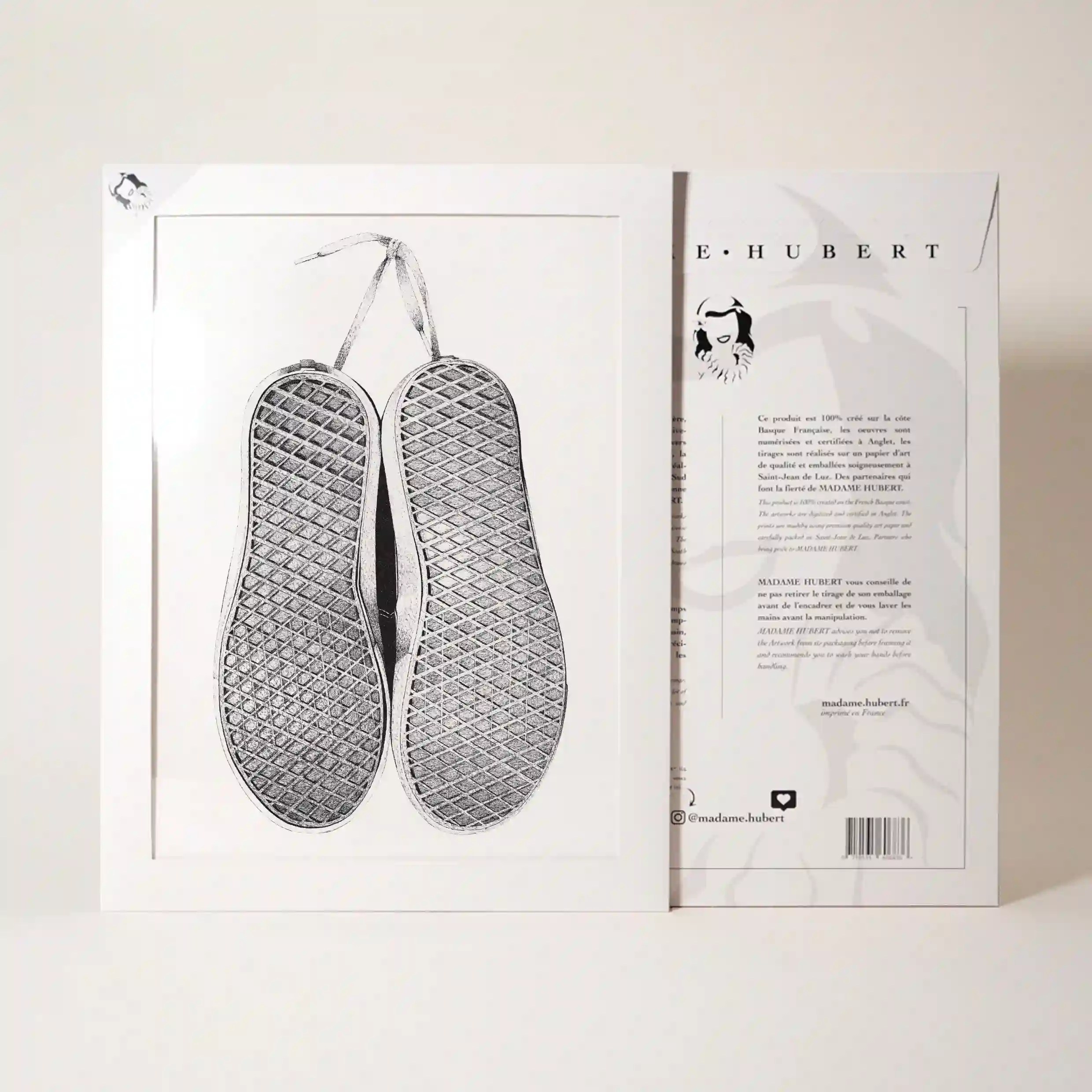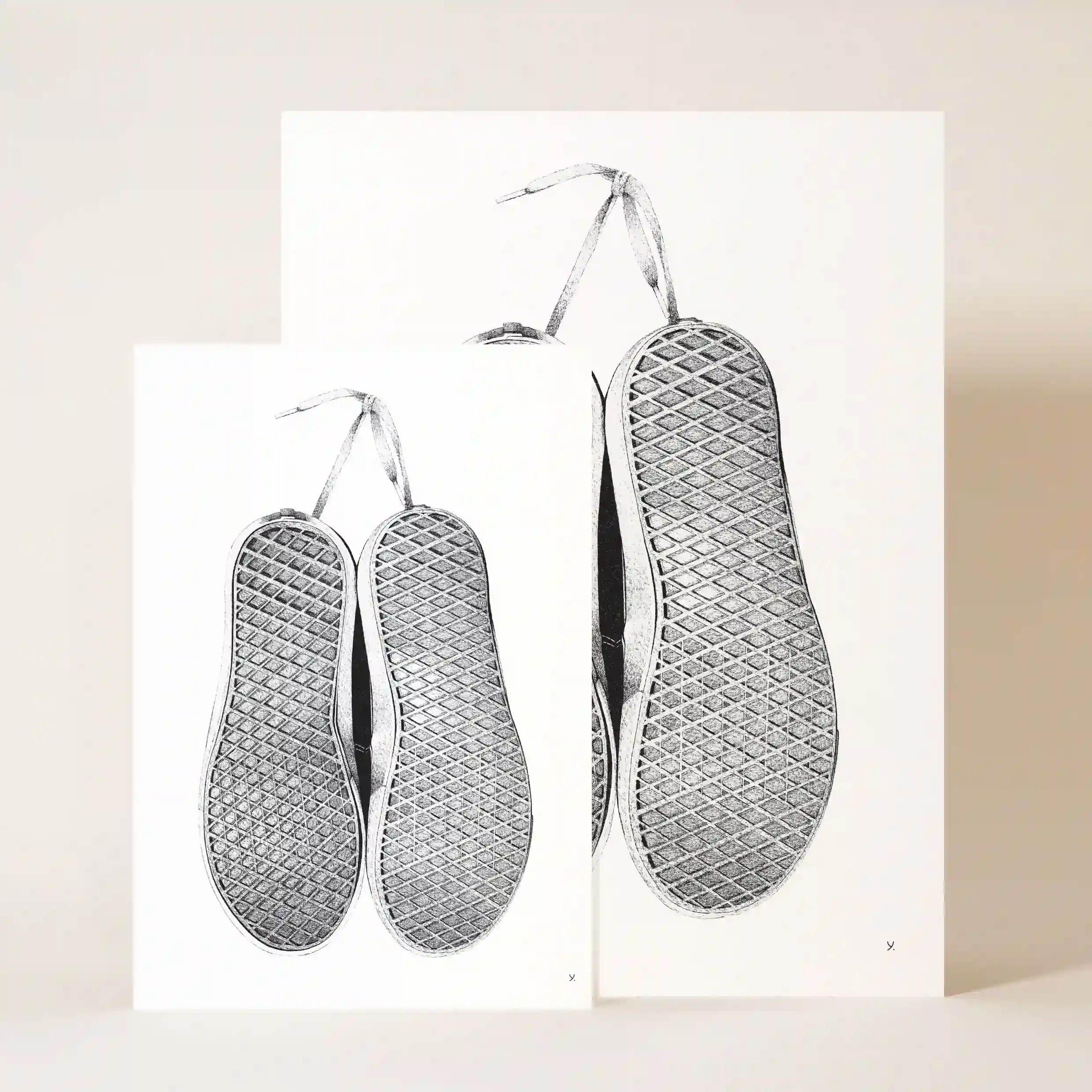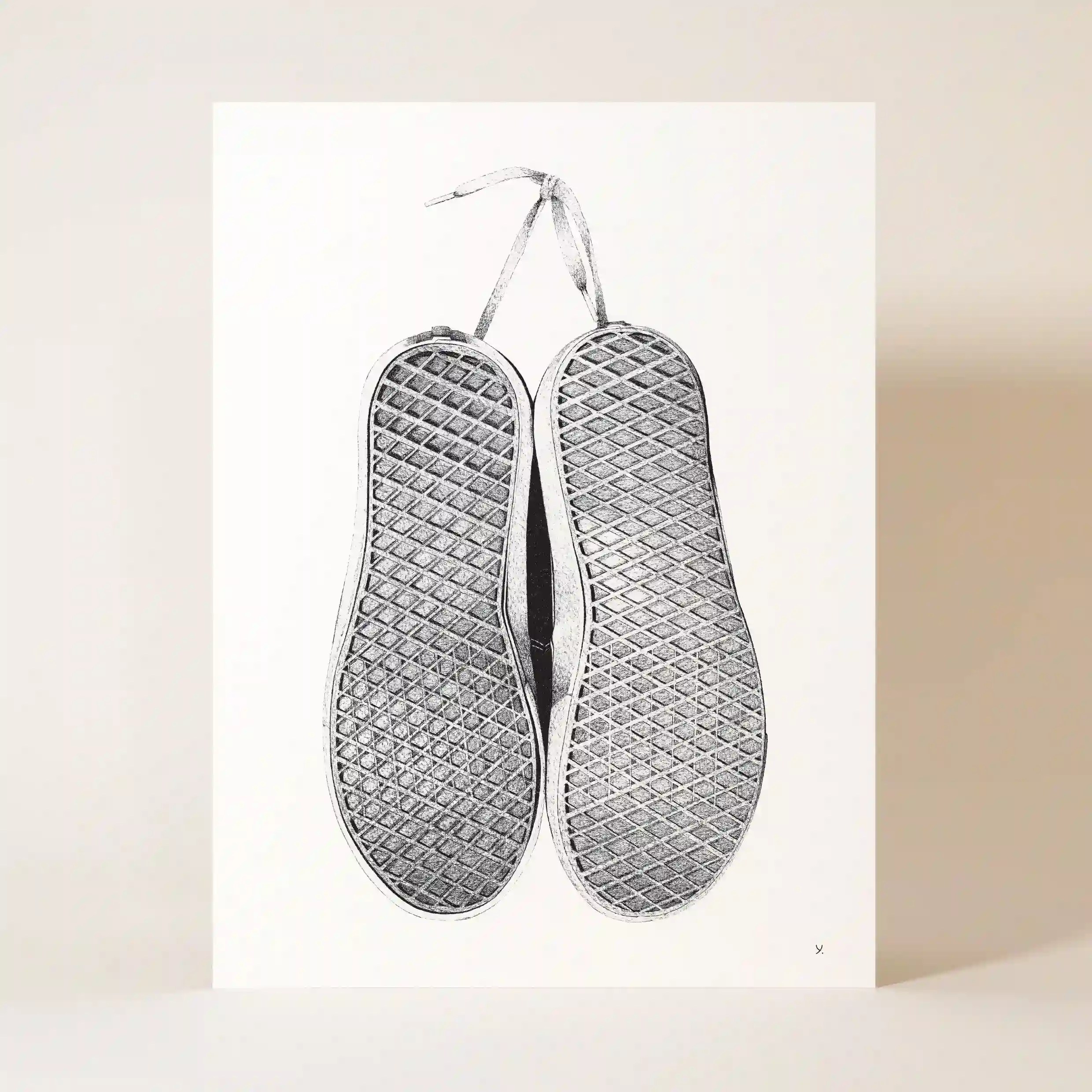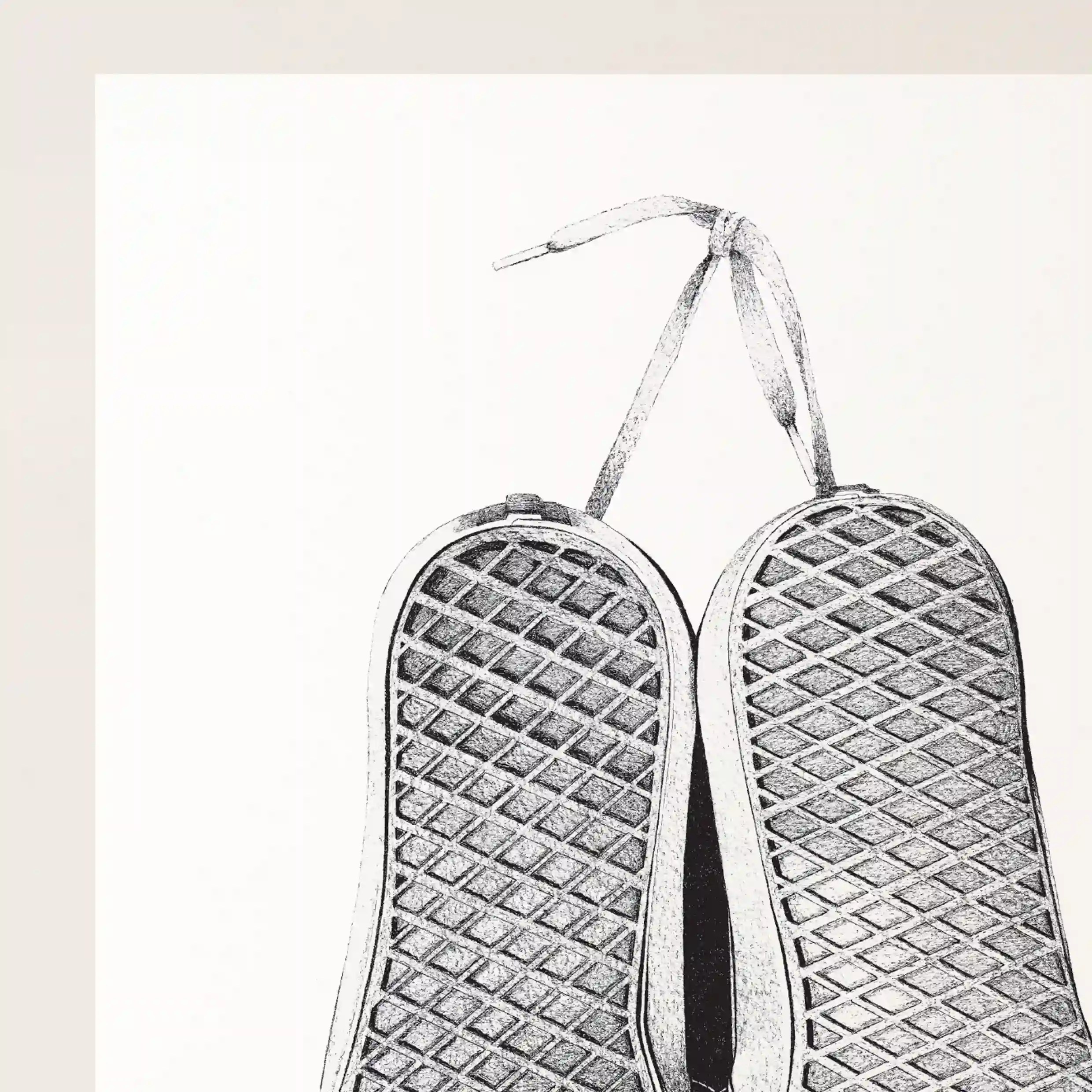 Le choix de représenter les semelles de ces sneakers suspendues met en avant une vision artistique unique et pleine de caractère. L’illustration joue avec les contrastes et les textures, mettant en avant le motif géométrique typique des chaussures de skate. Ce détail rappelle l’usure et les nombreuses sessions passées sur un grip de planche, entre figures techniques et longues journées à rider les spots urbains.
