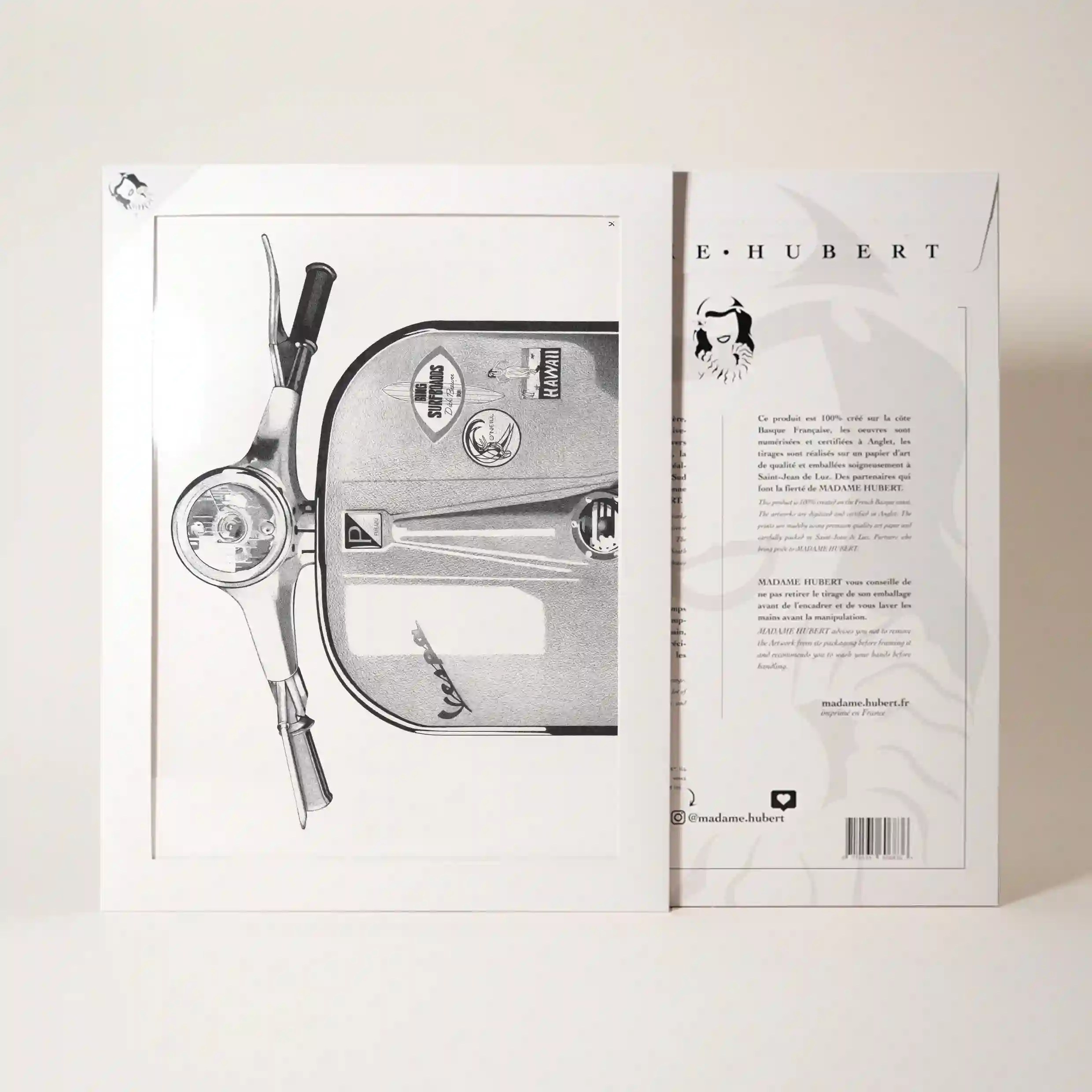 Plongez dans l’univers vintage et aventurier avec l’Affiche Mer « Stickers », une œuvre artistique qui capture l’esprit de liberté, d’évasion et de voyage. Cette affiche originale, en noir et blanc, met en scène un scooter Vespa emblématique, symbole de road trips insouciants et d’explorations côtières. Parfaite pour une décoration murale unique, elle séduira aussi bien les passionnés de voyage, de surf, que les amateurs d’objets rétro.